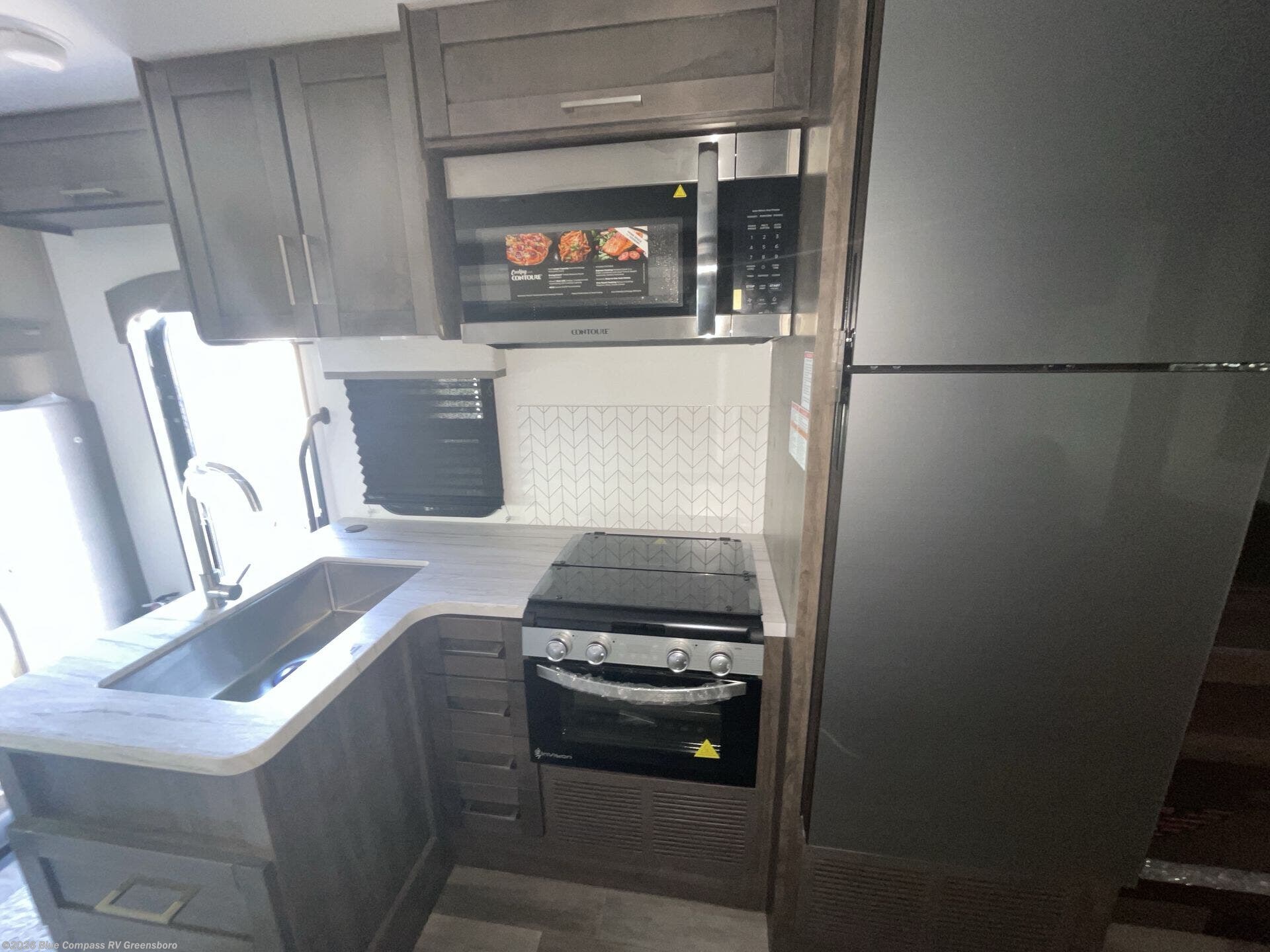 With any Odyssey Class C gas motorhome by Entegra Coach, the driver will appreciate the power from the 325 HP engine, the towing capacity from the 7,500 lb. hitch, the tire pressure monitoring system, the navigation from the Sony infotainment center with Apple CarPlay and Android Auto, plus the backup and side-view cameras when parking and driving down the highway. The kitchen offers full amenities including a recessed stainless steel sink with a cutting board sink cover, LED-lit pressed countertops, a decorative backsplash, and a pop-up charging station with 110 outlet and USB plugs to keep your smart phones charged. Get ready for luxury in a Class C, choose your favorite today!