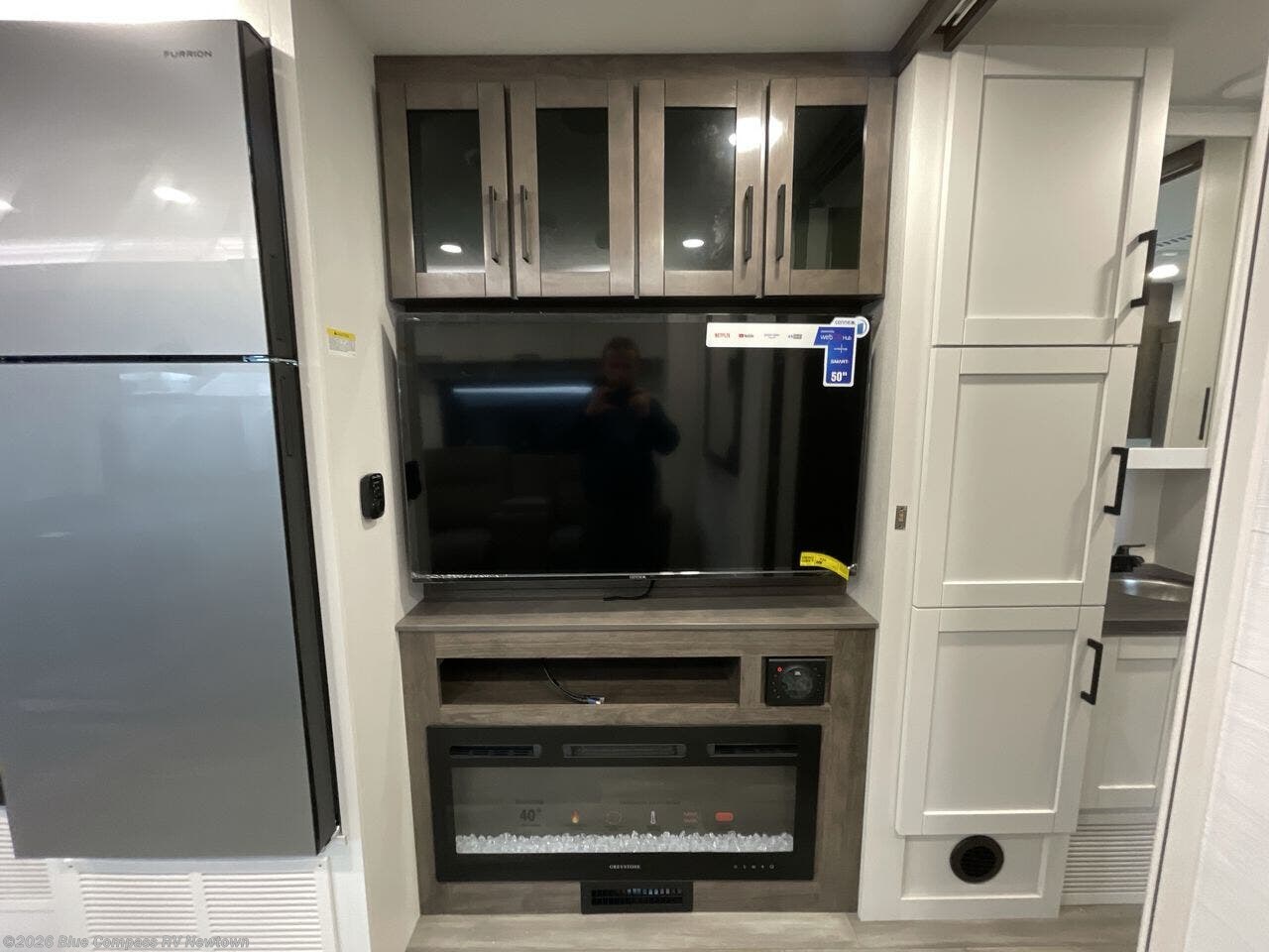 Relax inside while sitting on the sofa, at the booth dinette or on the swivel captains chairs while enjoying the fireplace and 50" TV, or unwind outside under the 18' electric awning while watching the exterior TV. After shopping in town or hiking the trails you can get cleaned up in the private toilet and shower room then brush your teeth in the bathroom sink a few steps outside the door. The private bedroom includes a space saving sliding door, a unique rear queen bed slide, plus storage. The cook will enjoy making meals using the residential-size microwave and Furrion all-in-one cooktop and oven, then storing leftovers in the 8 cu. ft. refrigerator. And the L-shaped counter with sink will come in handy.