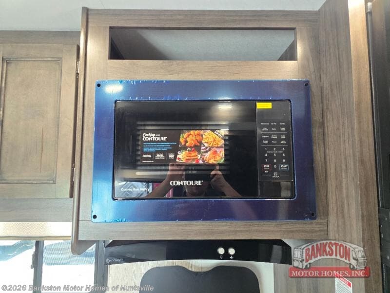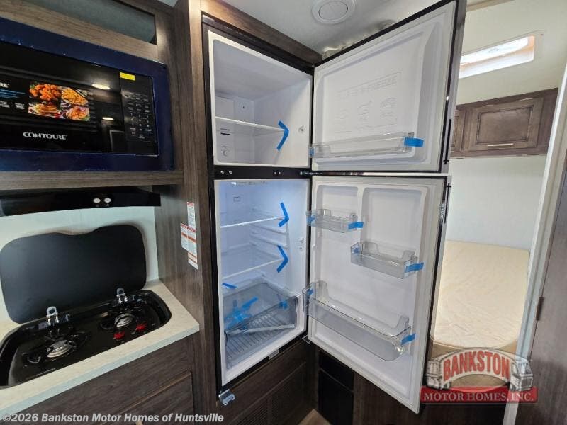 This coach will feel a little more like home with a booth dinette and full bath onboard! You can dine here, play games, and even let guests sleep here. There is additional sleeping space in the cab-over bunk and the rear corner 60" x 74" queen bed. You will find everything you need to cook meals each day, including a two-burner cooktop with a flush cover, a convection microwave, plus a 10-cu. ft. 12V refrigerator to store perishables.