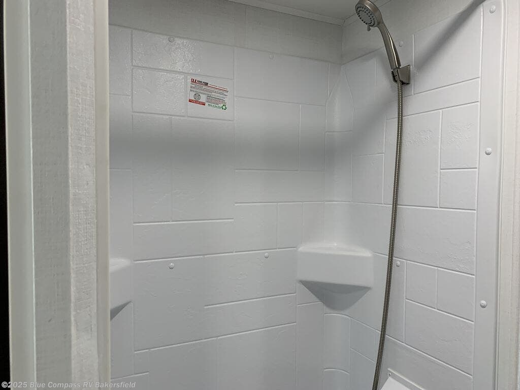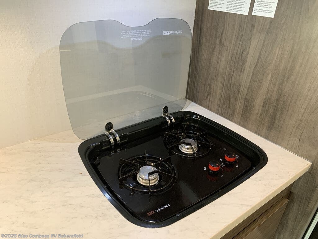 Travel in style in this spacious coach for seven to eight! Once you park at the campsite, you can start lunch on two-burner cooktop or in the convection microwave oven. There is a U-shaped dinette, jack-knife sofa, and cab-over bunk for dining, seating, and sleeping space. You'll find your own space in the rear bedroom with an RV queen bed, large wardrobe, and a privacy curtain. The 24" x 36" independent shower is right across from the private toilet and sink, allowing two people to use this space at once!