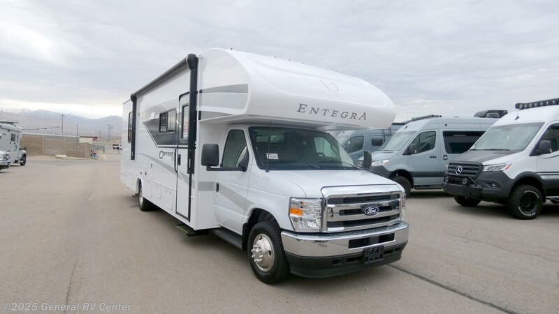 **Entegra Coach Odyssey SE Class C gas motorhome 29KF Ford highlights:** * Rear Bedroom * Large Slide Out * Cab-Over Bunk * Convection Microwave Oven * Outside Shower Travel in style in this spacious coach for seven to eight! Once you park at the campsite, you can start lunch on two-burner cooktop or in the convection microwave oven. There is a U-shaped dinette, jack-knife sofa, and cab-over bunk for dining, seating, and sleeping space. You'll find your own space in the rear bedroom with an RV queen bed, large wardrobe, and a privacy curtain. The 24" x 36" independent shower is right across from the private toilet and sink, allowing two people to use this space at once! The Odyssey SE Class C gas motorhome by Entegra Coach is constructed with TuffShell vacuum-bond laminated sidewalls, a one-piece, seamless fiberglass front cap, and bead-foam insulation for added durability and strength. Whether you choose a model with a Ford E-350 chassis, Ford E-450 or Chevy 4500 chassis, you will get a durable coach made to last. The driver will also love the power steering, tilt steering wheel, and auxiliary start switch. The 7' interior ceiling height will provide plenty of space to stretch out and the high-intensity, recessed LED lights will make your space feel more like home. All of your power needs will be met with a 4,000-watt generator and 12V house battery, plus there is a 13.5K BTU A/C and 30K BTU furnace to keep you comfortable all year long. There are a couple additions you might want to add to further customize your Odyssey SE, like the optional automatic hydraulic leveling jacks and the optional 200W solar panel for some off-grid camping!