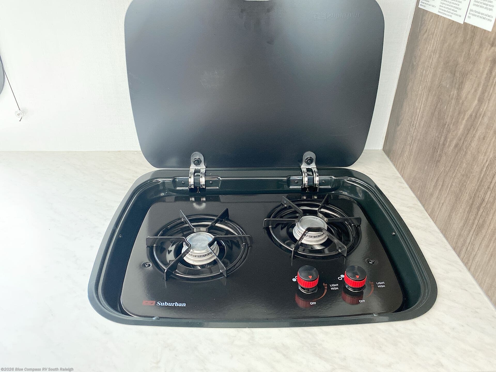 Travel in style in this spacious coach for seven to eight! Once you park at the campsite, you can start lunch on two-burner cooktop or in the convection microwave oven. There is a U-shaped dinette, jack-knife sofa, and cab-over bunk for dining, seating, and sleeping space. You'll find your own space in the rear bedroom with an RV queen bed, large wardrobe, and a privacy curtain. The 24" x 36" independent shower is right across from the private toilet and sink, allowing two people to use this space at once!