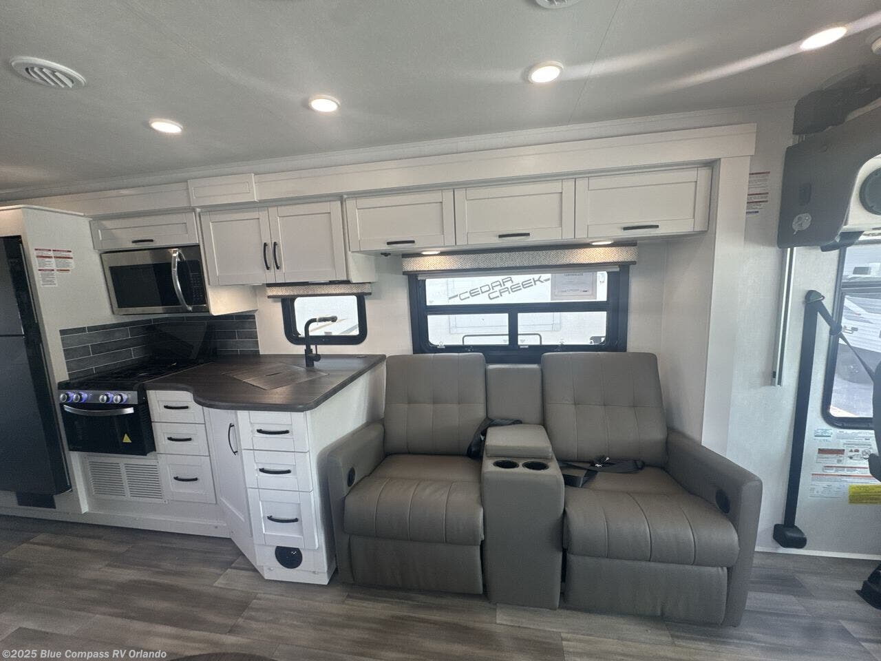 This Vision Class A gas motorhome has excellent interior living space with a full-wall slide! You'll fully enjoy the kitchen and the amenities it provides, like a residential-size microwave, a 10 cu. ft. 12V refrigerator, a Furrion all-in-one cooktop and oven, and a pantry. The 68" jack-knife sofa and booth dinette offer you lounging space after a full day of traveling, and the 39" LED HD Smart TV offers you some entertainment when you don't want to be active anymore. The exterior portion of this coach is also excellently appointed with an outdoor kitchen, exterior entertainment center with LED HD Smart TV, radio, and speakers, and a 23' electric awning with LED lights. You also have great choices of options for this coach with the optional theater seating, LED HDTV in the bedroom, or drop-down overhead cab bunk.