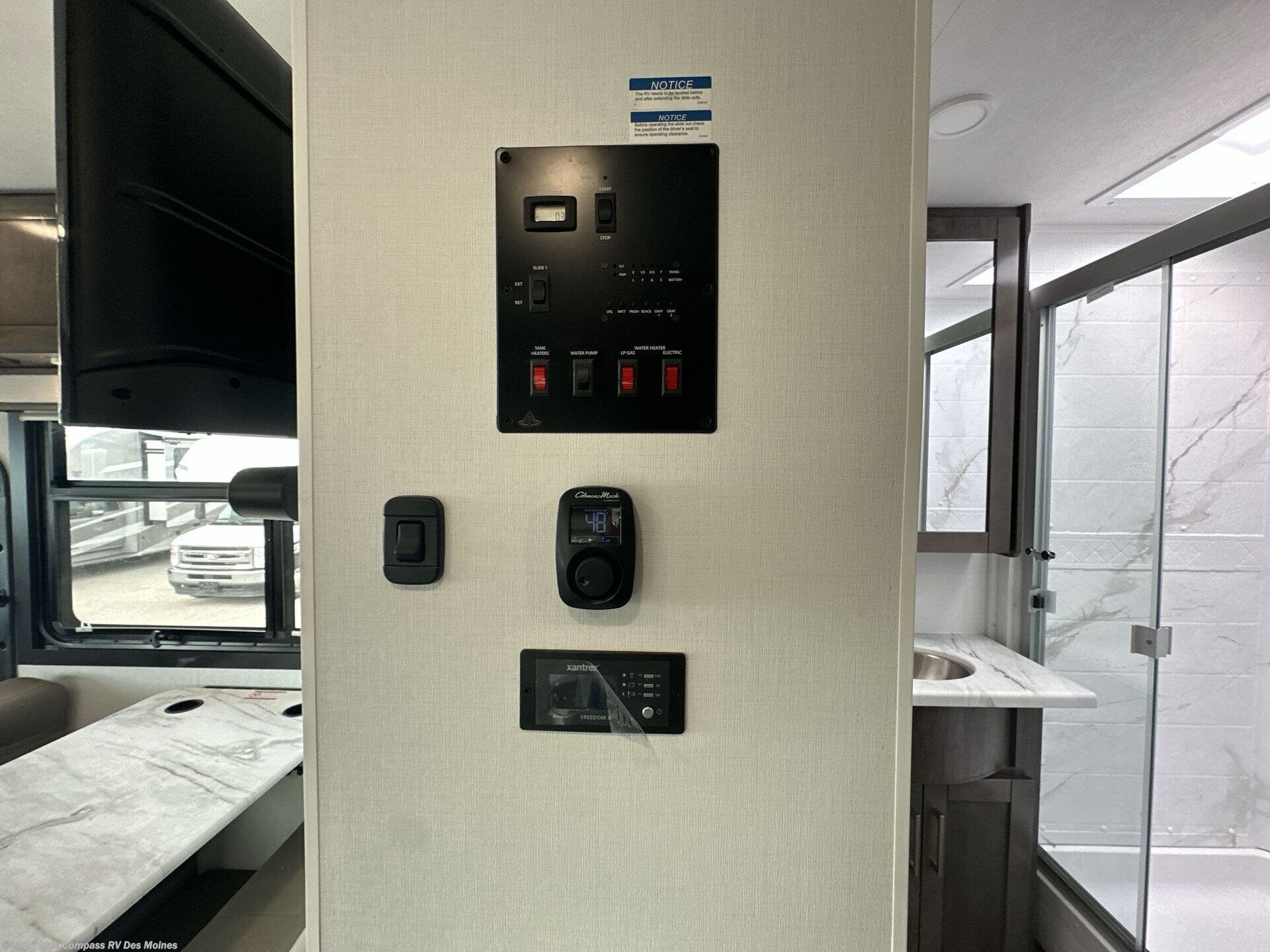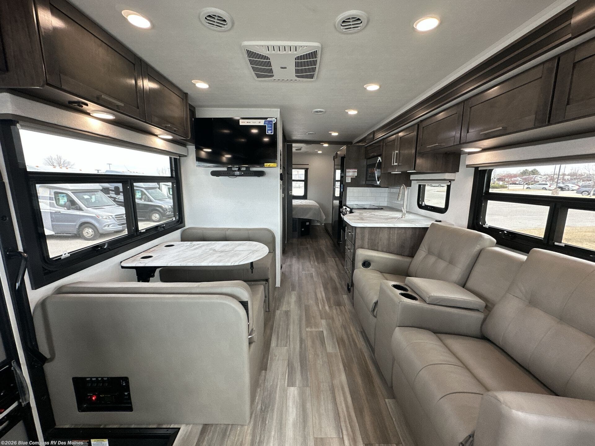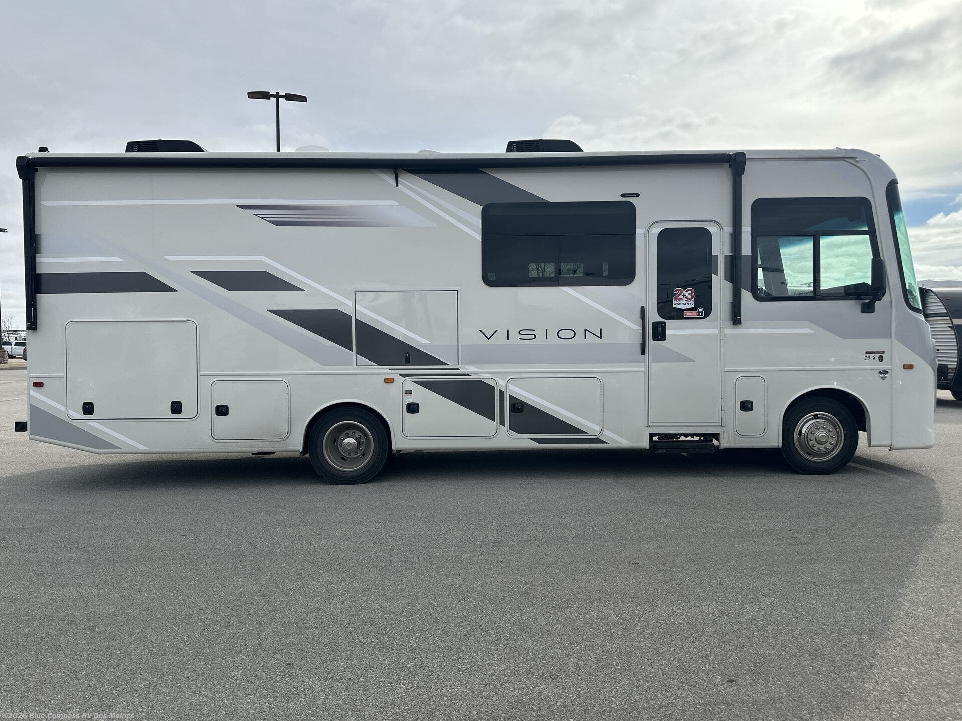 This Vision Class A gas motorhome has excellent interior living space with a full-wall slide! You'll fully enjoy the kitchen and the amenities it provides, like a residential-size microwave, a 10 cu. ft. 12V refrigerator, a Furrion all-in-one cooktop and oven, and a pantry. The 68" jack-knife sofa and booth dinette offer you lounging space after a full day of traveling, and the 39" LED HD Smart TV offers you some entertainment when you don't want to be active anymore. The exterior portion of this coach is also excellently appointed with an outdoor kitchen, exterior entertainment center with LED HD Smart TV, radio, and speakers, and a 23' electric awning with LED lights. You also have great choices of options for this coach with the optional theater seating, LED HDTV in the bedroom, or drop-down overhead cab bunk.