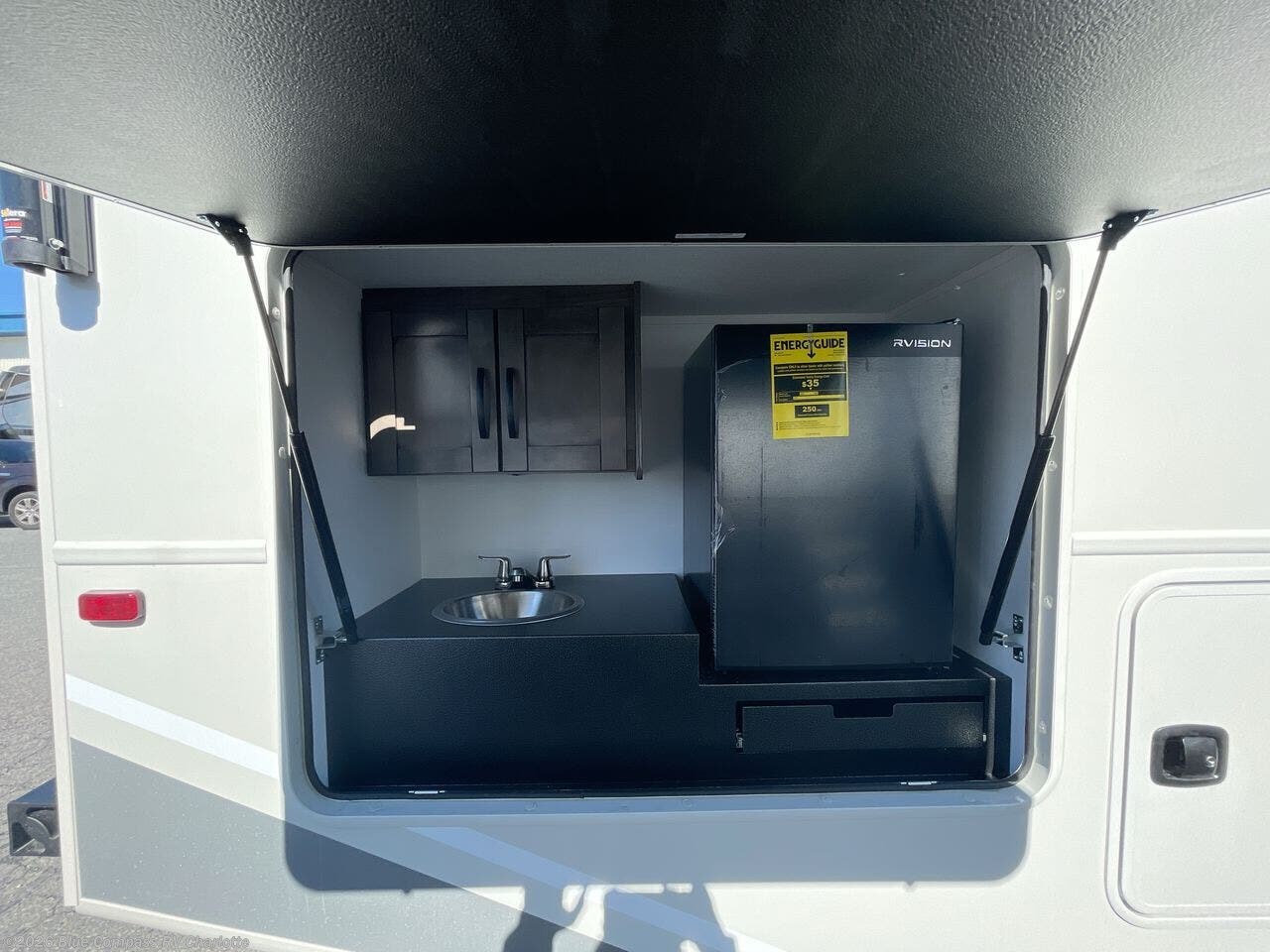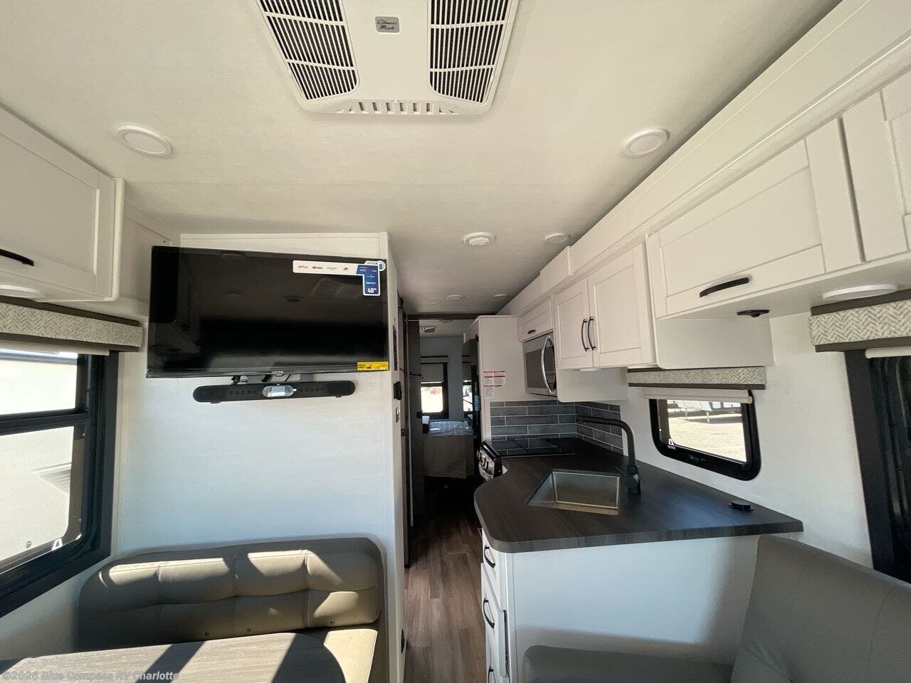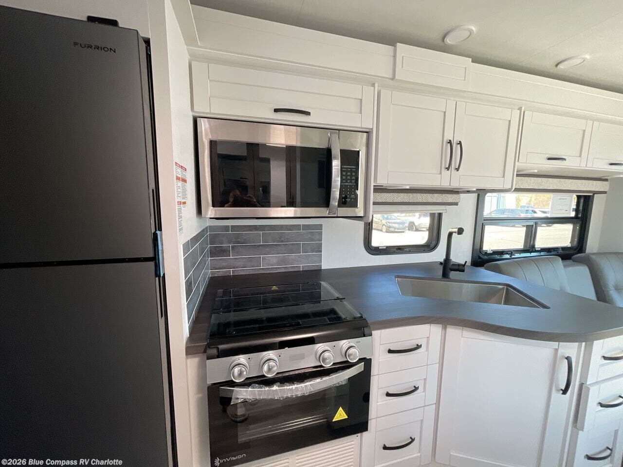 This Vision Class A gas motorhome has excellent interior living space with a full-wall slide! You'll fully enjoy the kitchen and the amenities it provides, like a residential-size microwave, a 10 cu. ft. 12V refrigerator, a Furrion all-in-one cooktop and oven, and a pantry. The 68" jack-knife sofa and booth dinette offer you lounging space after a full day of traveling, and the 39" LED HD Smart TV offers you some entertainment when you don't want to be active anymore. The exterior portion of this coach is also excellently appointed with an outdoor kitchen, exterior entertainment center with LED HD Smart TV, radio, and speakers, and a 23' electric awning with LED lights. You also have great choices of options for this coach with the optional theater seating, LED HDTV in the bedroom, or drop-down overhead cab bunk.