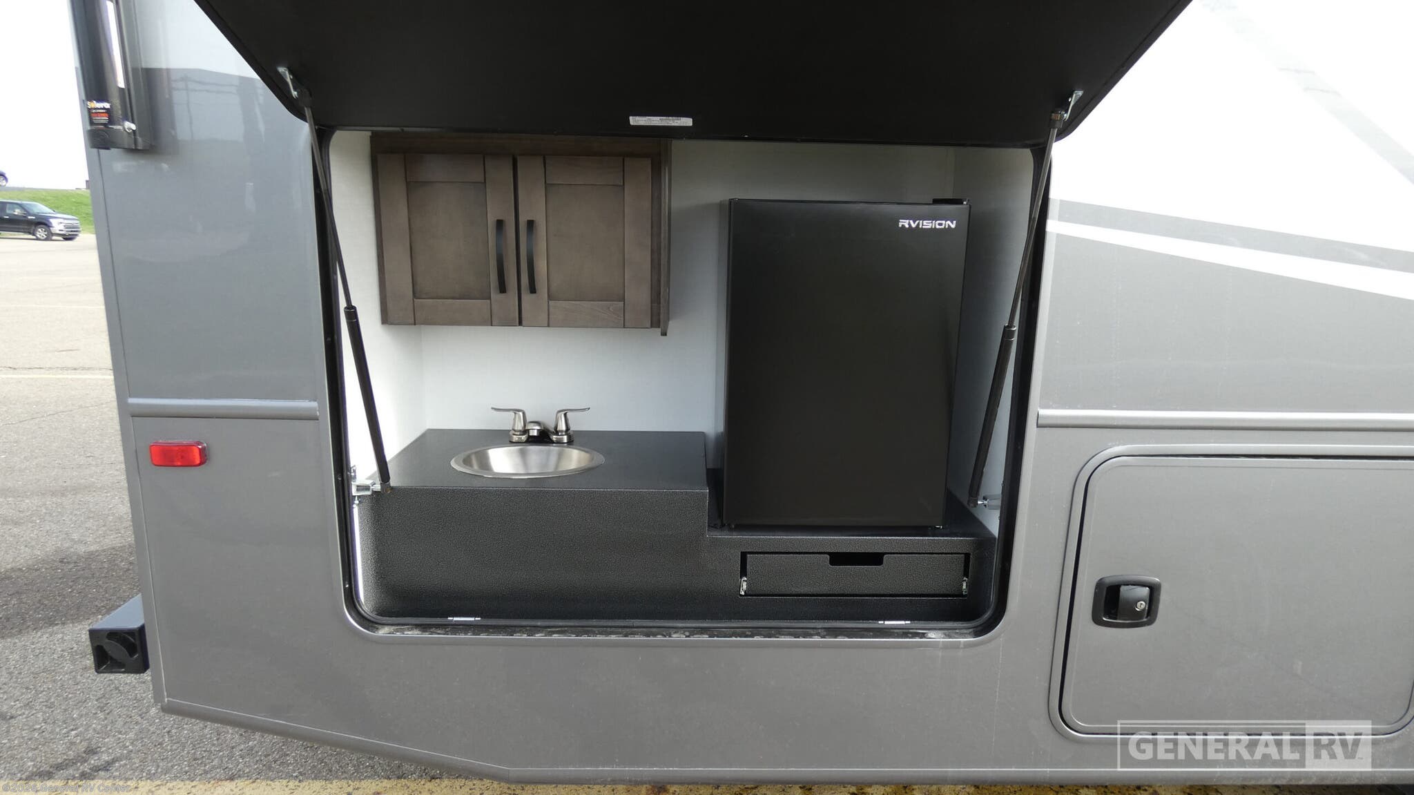 **Entegra Coach Vision Class A gas motorhome 29S highlights:** - Full-Wall Slide - RV Queen Bed - Booth Dinette - Panoramic Windshield - Outside Kitchen - Exterior LED TV This Vision Class A gas motorhome has excellent interior living space with a full-wall slide! You'll fully enjoy the kitchen and the amenities it provides, like a residential-size microwave, a 10 cu. ft. 12V refrigerator, a Furrion all-in-one cooktop and oven, and a pantry. The 68" jack-knife sofa and booth dinette offer you lounging space after a full day of traveling, and the 39" LED HD Smart TV offers you some entertainment when you don't want to be active anymore. The exterior portion of this coach is also excellently appointed with an outdoor kitchen, exterior entertainment center with LED HD Smart TV, radio, and speakers, and a 23' electric awning with LED lights. You also have great choices of options for this coach with the optional theater seating, LED HDTV in the bedroom, or drop-down overhead cab bunk. Cruise to your next luxurious camping location in any Entegra Coach Vision Class A gas motorhome! With its high-class features, the Vision makes it quite easy to create memorable and lavish getaways. The exterior comes equipped with an electric patio awning with LED lights, an outside shower, an exterior utility center, and slide out awnings. There are also lockable pass-through storage compartments, an exterior entertainment center with speakers, and a 200W solar panel with a dual controller. The 5,500W generator will provide extra convenience while the water filtration system keeps your water pure and tasting great. The E-Z DRIVE ride and handling package is another feature that is sure to spark your interest as it allows you to drive without much effort. This package includes a computer-balanced driveshaft, jounce bumpers, heavy-duty front and rear stabilizer bars, and SACHS shocks.