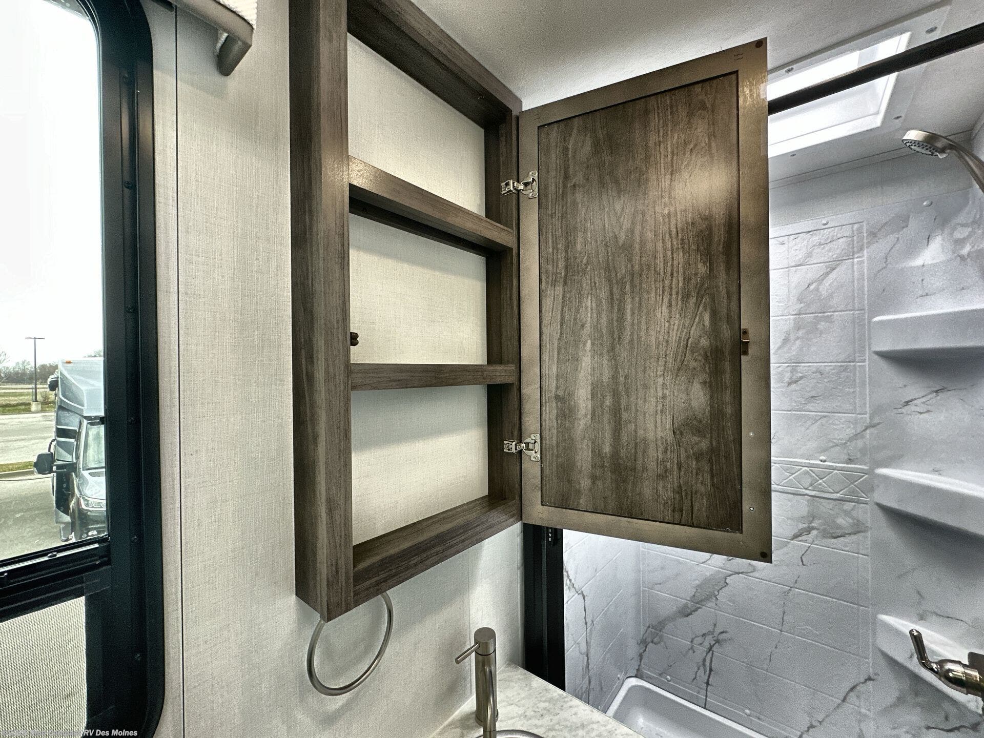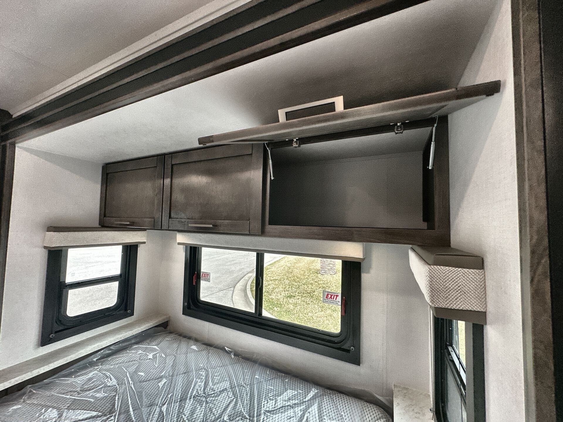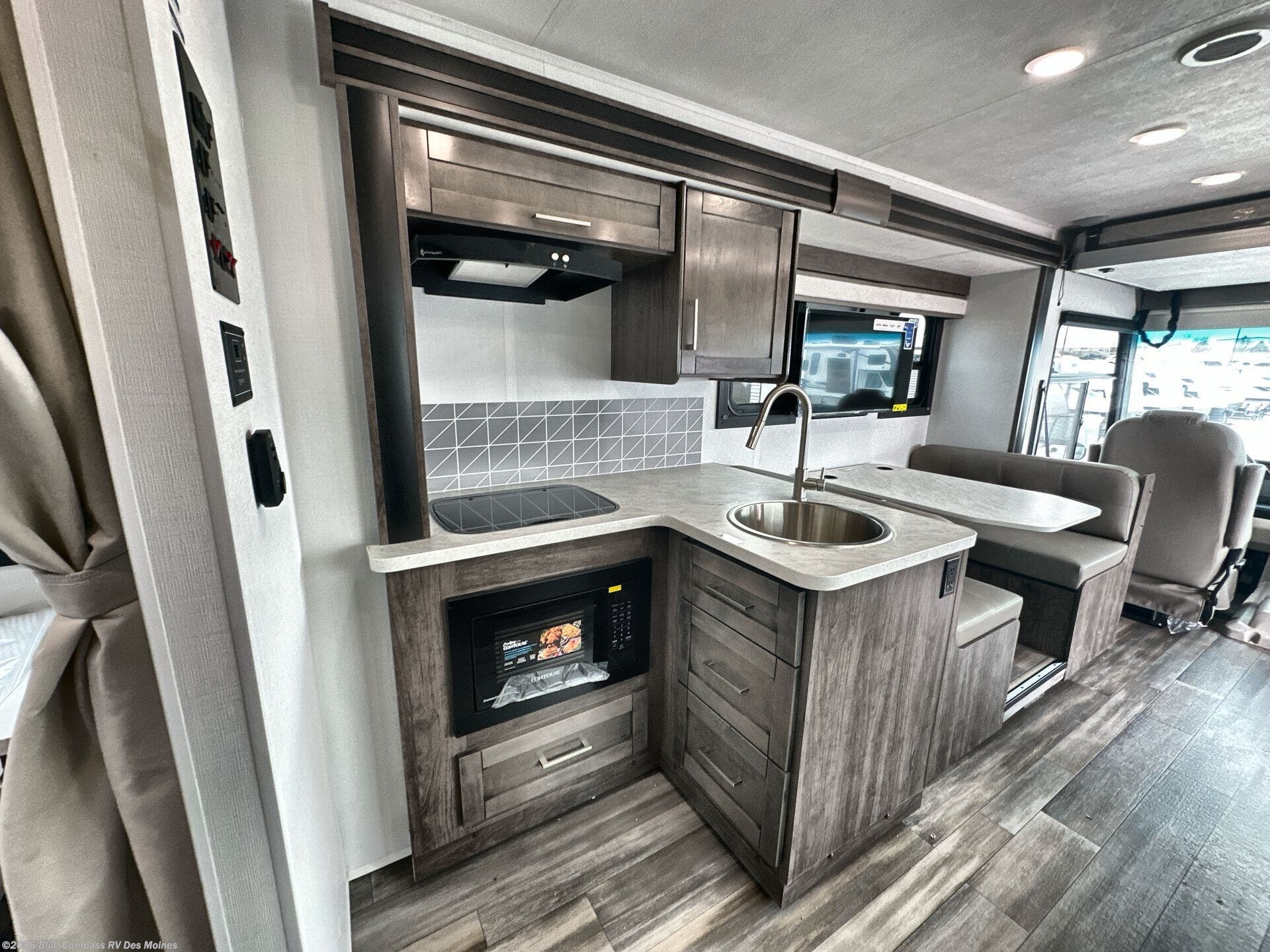 This coach is perfect for your crew of four to five, with the ability to sleep more if you choose the optional drop-down overhead bunk. Once you've arrived at your destination, the swivel captain's seats can be turned around to face the main living area so you can visit with those on the jack-knife sofa and booth dinette. A full kitchen, including a two burner cooktop and convection microwave oven will let you make meals each day, and the 10 cu. ft. 12V refrigerator will keep your food fresh. You'll love having your own space in the rear corner private bedroom that includes a king bed slide out and a spacious wardrobe. And you'll find the full bath in the other rear corner for quick and easy access at night!