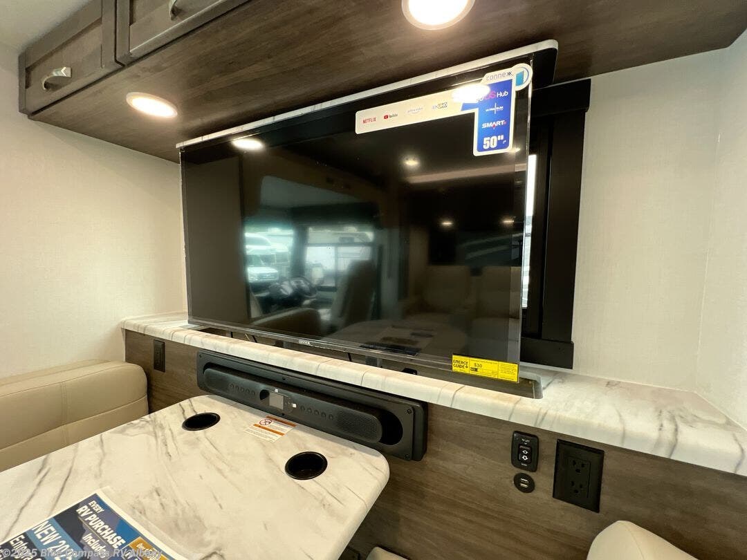 This motorhome has everything you need for a relaxing getaway! Go out alone, or invite a few extra travelers to join you and crash on the 60" tri-fold sofa or 38" x 70" booth dinette. You can even add some more sleeping space for friends or kids by choosing the drop-down overhead bunk option. It will be a piece of cake to enjoy a piece of cake thanks to the Furrion all-in-one cooktop and oven, the residential refrigerator, and the residential microwave will give you everything you need to prepare a batter and bake it. You'll also be able to stay entertained throughout each trip by using the 50" LED HD Smart TV in the living area, the LED HD Smart TV in the bedroom, and the exterior LED HD Smart TV at the outside entertainment center. Everyone can stay squeaky clean with the separated bathroom that has a 30" x 36" shower on one side and a private toilet and sink on the other side!