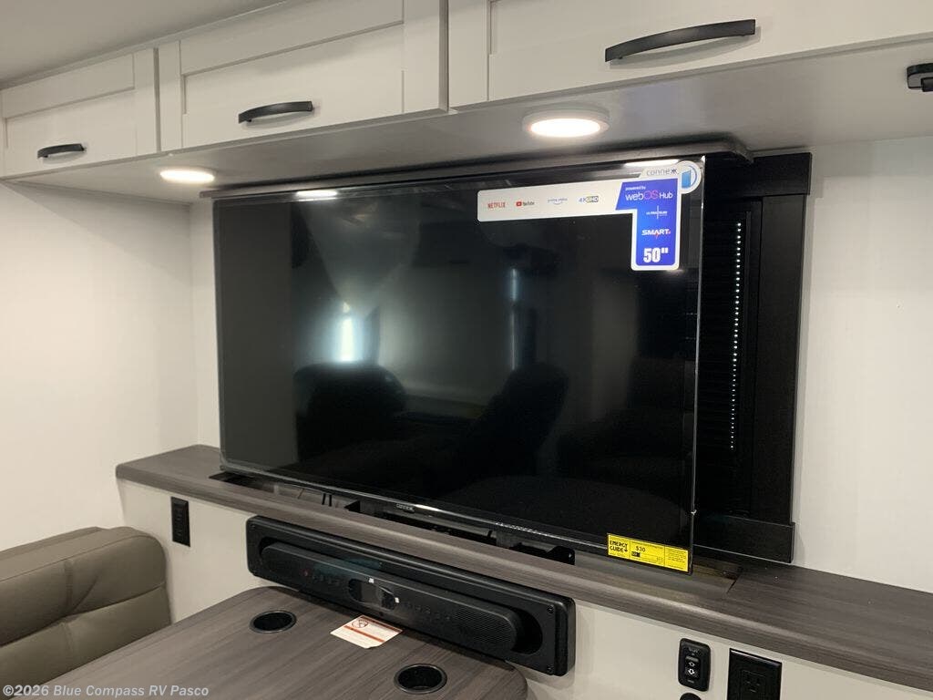 This motorhome has everything you need for a relaxing getaway! Go out alone, or invite a few extra travelers to join you and crash on the 60" tri-fold sofa or 38" x 70" booth dinette. You can even add some more sleeping space for friends or kids by choosing the drop-down overhead bunk option. It will be a piece of cake to enjoy a piece of cake thanks to the Furrion all-in-one cooktop and oven, the residential refrigerator, and the residential microwave will give you everything you need to prepare a batter and bake it. You'll also be able to stay entertained throughout each trip by using the 50" LED HD Smart TV in the living area, the LED HD Smart TV in the bedroom, and the exterior LED HD Smart TV at the outside entertainment center. Everyone can stay squeaky clean with the separated bathroom that has a 30" x 36" shower on one side and a private toilet and sink on the other side!