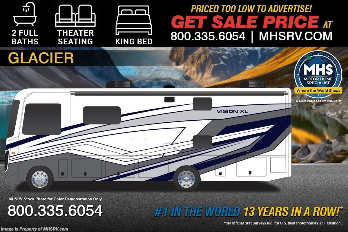 - Front Overhead Bunk Shop hundreds of motorhomes including Class A RVs at MHSRV! Choose from Thor A.C.E. – Resonate – Hurricane – Windsport – Luminate – Indigo – Vegas – Axis – Challenger – Miramar Fleetwood Flair – Fortis – Flex – Bounder - Forest River Georgetown - FR3 – Entegra Coach Vision – Vision XL – Emblem – Holiday Rambler Admiral – Eclipse – Invicta – Vacationer - and much more. We also sell quality pre-owned models such as Jayco Alante SE – Alante – Precept – Precept Prestige – Tiffin Allegro Open Road – Newmar Canyon Star – Bay Star – Winnebago Vista – Sunstar – Adventurer – Coachmen Mirada – Pursuit - Encore and much more. Visit for our complete line-up and the sale prices that have made us the #1 volume selling motor home dealership in the world 12 years in a row! About This RV The Entegra Coach Vision XL is built for your next adventure and includes all new features such as new exterior graphics package, all new full body paint exteriors, infotainment center changed to Sony w/apple car play and android auto, solid surface counters upgraded to match in bathroom and bedroom. This beautiful RV features automatic hydraulic leveling jacks, Ford chassis. This amazing RV boasts Customer Value Package which features 5.5 KW generator, 50 amp electrical service, 1,200 watt inverter, Automatic hydraulic leveling jacks, Backup and sideview camera, Driver/passenger cockpit table, Electric awning with LED lights, Exterior entertainment center with LED TV and single disc DVD/FM radio, Frameless windows, Infotainment system, E-Z Drive Elite package, LED TV in living room, Roller shades, Slideout cover awnings and Solid-surface kitchen countertops. The Vision XL's impressive list of standard features that truly set it apart from the competition include Entegra's unparalleled 2 year warranty, one-piece fiberglass front cap, panoramic windshield with power shade, seamless crowned fiberglass roof, ball-bearing drawer guides, large shower and much more. About Us For more details on this unit, our full inventory, brochures, window stickers, videos, photos, and customer reviews, visit or call 800-335-6054 for the Texas location or 334-288-0331 for our Alabama location. At Motor Home Specialist, we never charge prep or orientation fees. Every new RV sale includes a multi-point inspection, full interior and exterior detail. At our Texas location we also offer a high-pressure rain booth test—an exclusive service in the industry. You'll also receive a comprehensive coach orientation with an MHSRV technician and a complimentary night in our delivery park with full hook-ups at our Texas Location. --Why Pay More? Why Settle for Less?—