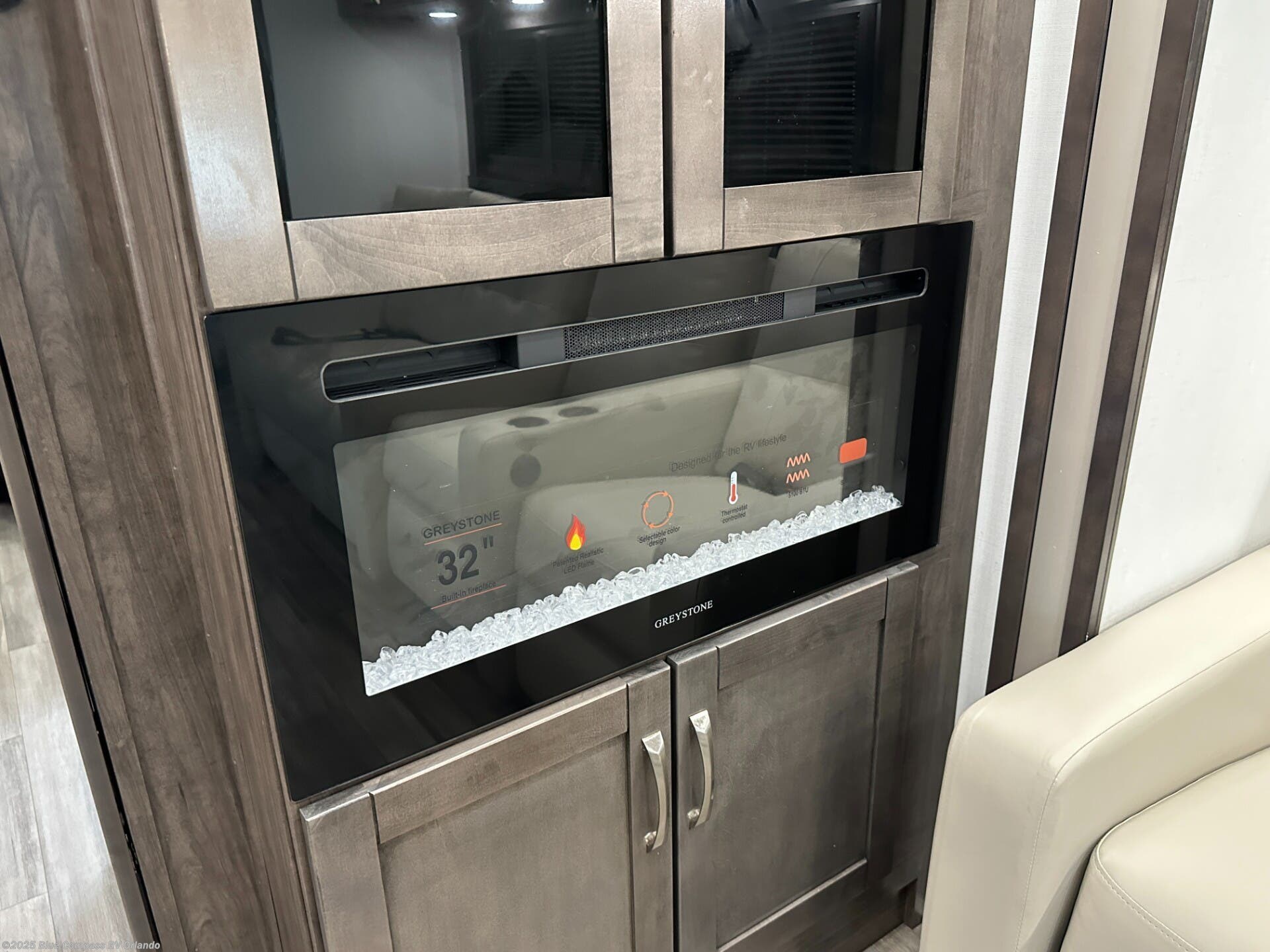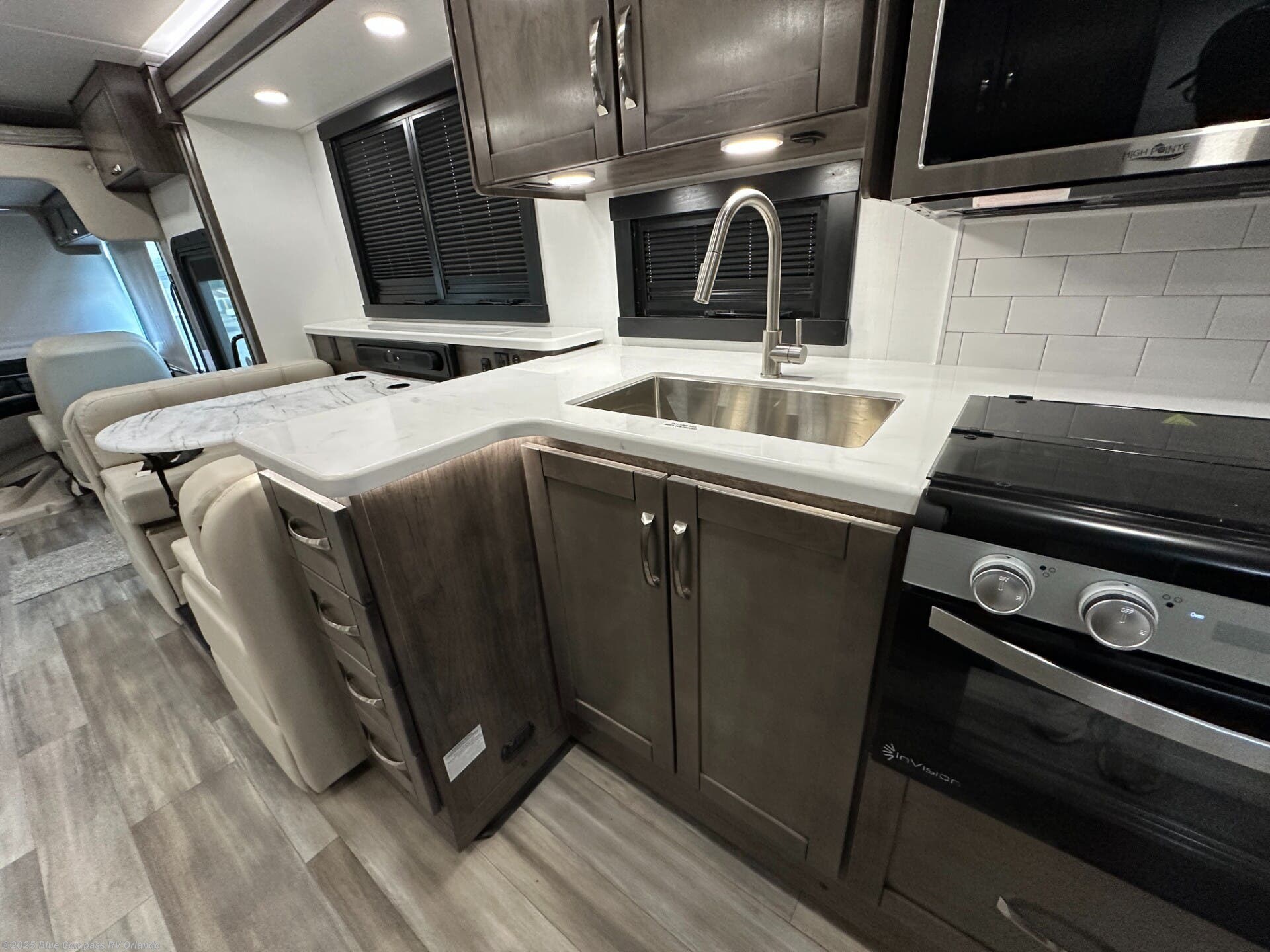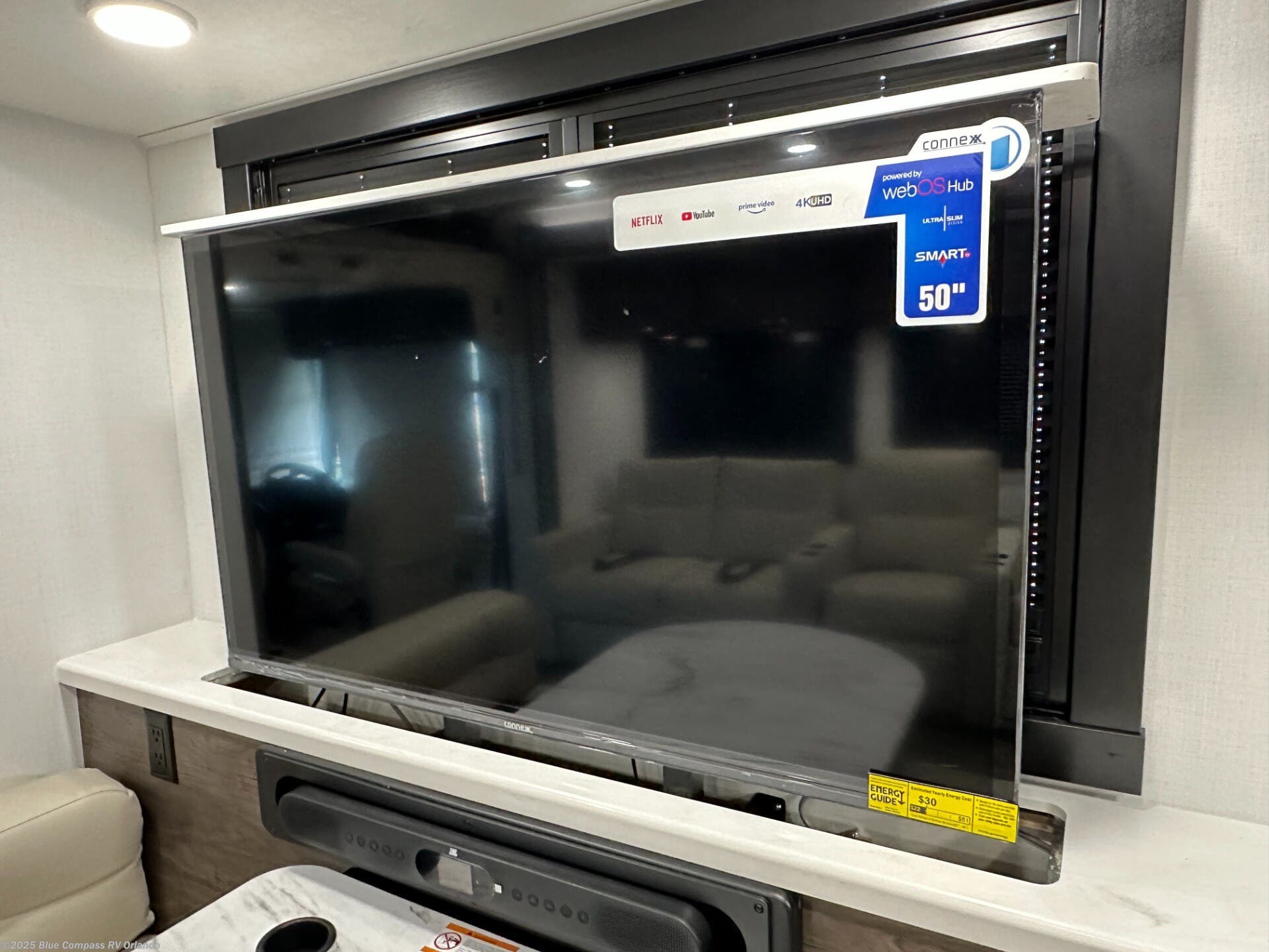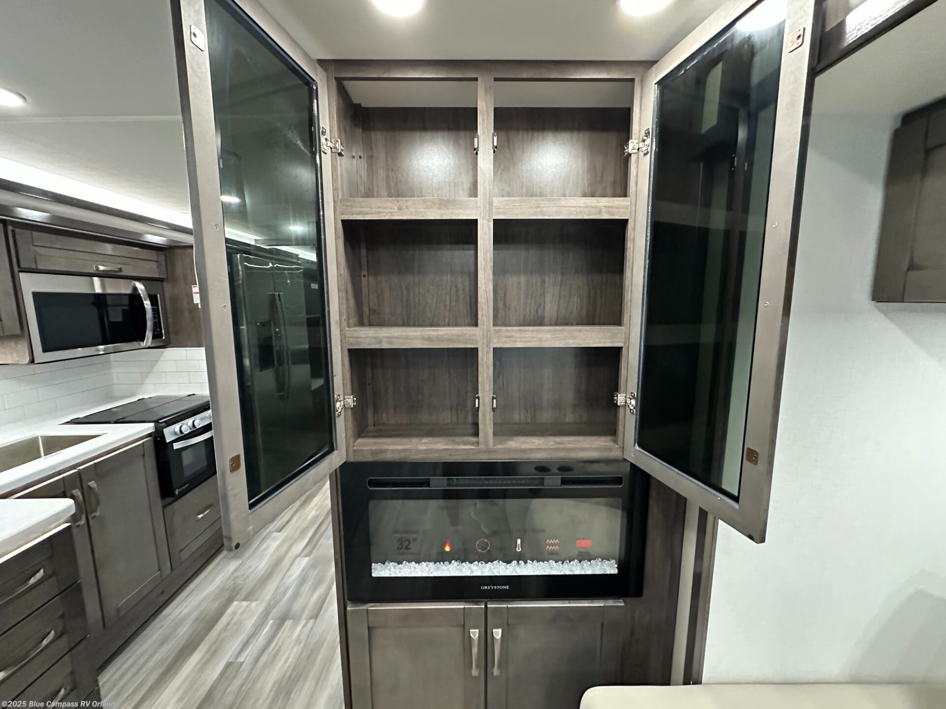 Picture yourself sitting in one of the swivel cab seats with your favorite beverage resting on the removable cockpit table in this Vision XL Class A gas motorhome! When you enter this coach, you will be greeted with a warm and comfortable living environment that has a theater sofa, hide-a-bed sofa, and 38" x 70" booth dinette for lounging, and the fireplace and 50" LED HD Smart TV will add to the coziness. For storing your favorite foods, you can use the residential refrigerator and pantry, and your dishes can be kept in the hutch or overhead cabinets. Conveniently located across from the kitchen is the half bathroom which has an area prepped for an optional washer/dryer, and the walk-around king-size bed in the master suite creates an exceptionally comfortable space to spend your nights.