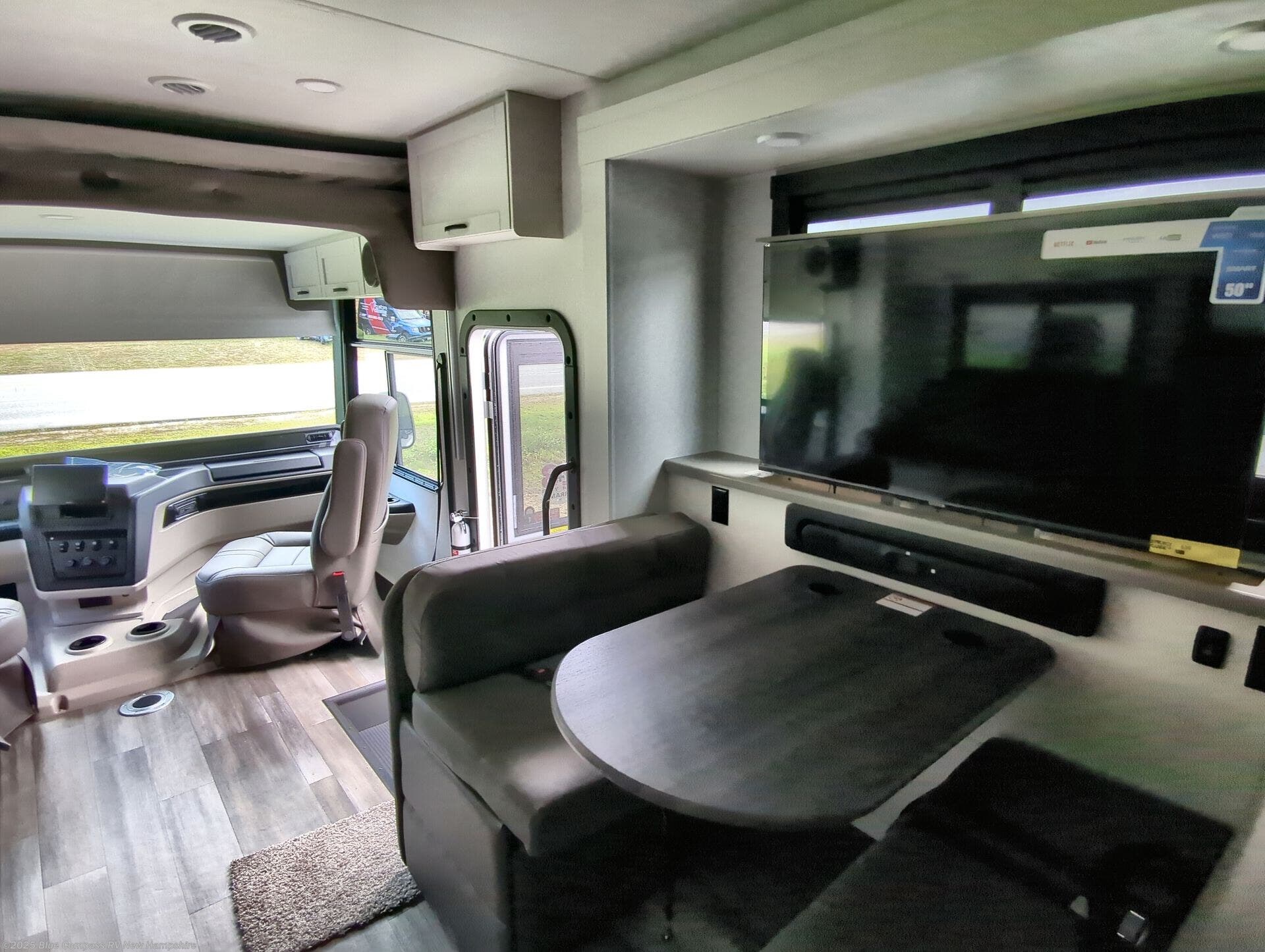 Picture yourself sitting in one of the swivel cab seats with your favorite beverage resting on the removable cockpit table in this Vision XL Class A gas motorhome! When you enter this coach, you will be greeted with a warm and comfortable living environment that has a theater sofa, hide-a-bed sofa, and 38" x 70" booth dinette for lounging, and the fireplace and 50" LED HD Smart TV will add to the coziness. For storing your favorite foods, you can use the residential refrigerator and pantry, and your dishes can be kept in the hutch or overhead cabinets. Conveniently located across from the kitchen is the half bathroom which has an area prepped for an optional washer/dryer, and the walk-around king-size bed in the master suite creates an exceptionally comfortable space to spend your nights.