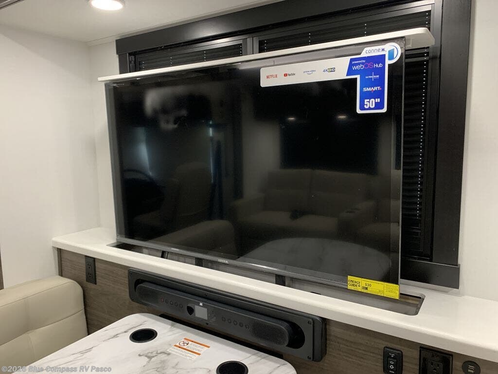 Picture yourself sitting in one of the swivel cab seats with your favorite beverage resting on the removable cockpit table in this Vision XL Class A gas motorhome! When you enter this coach, you will be greeted with a warm and comfortable living environment that has a theater sofa, hide-a-bed sofa, and 38" x 70" booth dinette for lounging, and the fireplace and 50" LED HD Smart TV will add to the coziness. For storing your favorite foods, you can use the residential refrigerator and pantry, and your dishes can be kept in the hutch or overhead cabinets. Conveniently located across from the kitchen is the half bathroom which has an area prepped for an optional washer/dryer, and the walk-around king-size bed in the master suite creates an exceptionally comfortable space to spend your nights.