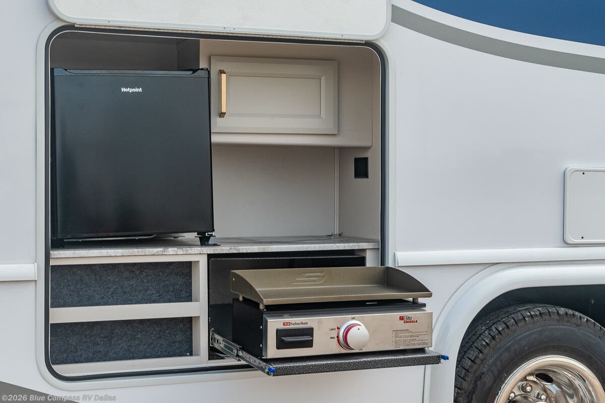Pack your bags and head off on new adventures in this spacious coach! You will love gathering around the U-shaped dinette for a game or a meal, and the full-wall slide provides ample space to move around. An overhead bunk provides sleeping space for little ones or to be used as extra storage space. Since there is a queen Murphy bed, you will enjoy versatile seating and sleeping space, and the full rear bath will allow you to freshen up each day without having to use the camp's facilities. This model also includes a three burner range/convection microwave combo to cook meals on plus an exterior kitchen with a mini fridge, pull-out griddle, and storage when the weather is nice!