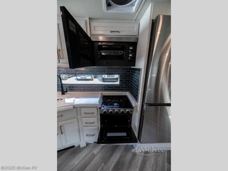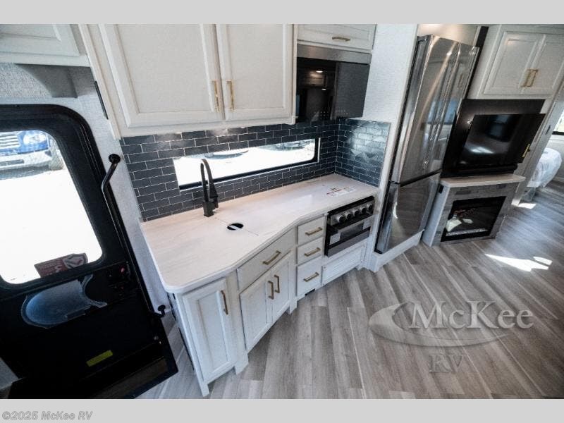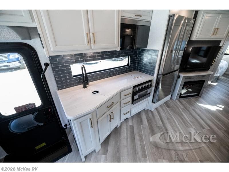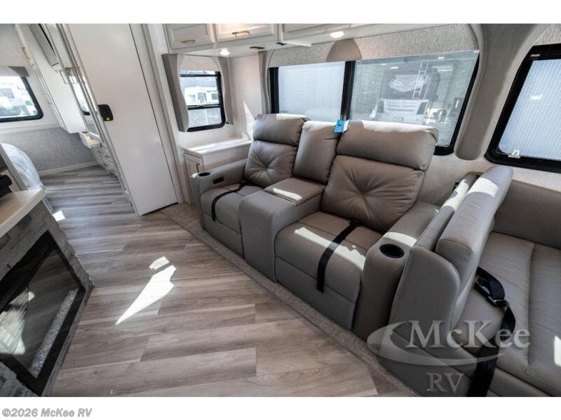 Get ready to live in this coach with all the amenities of home, yet your destination can change when you like! The rear bedroom offers a slide out king bed with CPAP storage above, plus wardrobes, a dresser and an LED TV to watch at night. The full bathroom offers a 24" x 40" shower with a seat so you can relax after shopping in town or hiking the trails. When you get hungry, the full kitchen offers a residential refrigerator, a convection microwave and pantry for all your goodies. The jackknife sofa and end table are across from the LED TV with a fireplace below for a great place to watch your shows, and the rest EZ dinette gives you a place to dine and even work if you need to. You can also enjoy your coffee while sitting in the driver and passenger seats that swivel with a pedestal table in between.