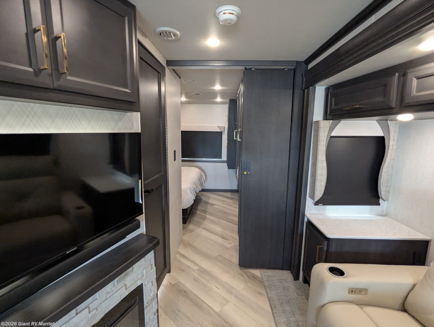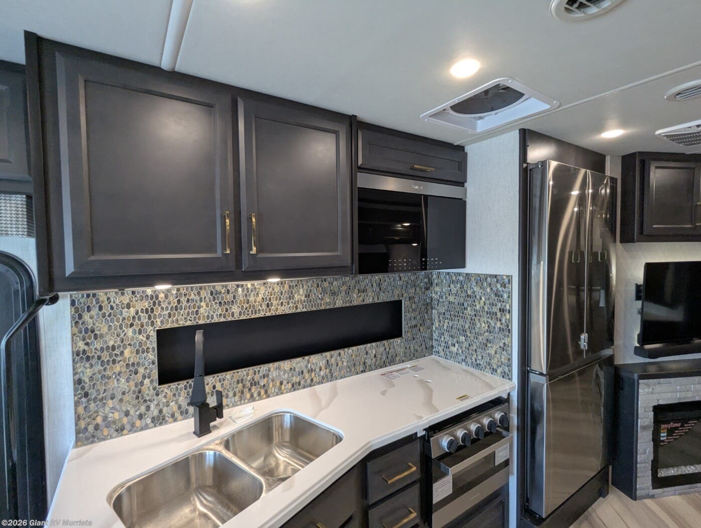 - Spacious Living Area: Features a jackknife sofa, Adap-table® dinette with pop-up TV, and electric fireplace for a stylish, home-like feel.