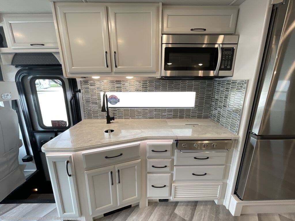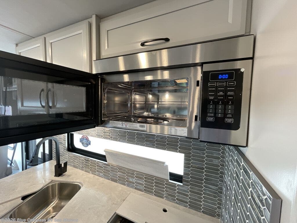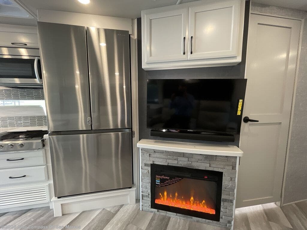 Get ready to live in this coach with all the amenities of home, yet your destination can change when you like! The rear bedroom offers a slide out king bed with CPAP storage above, plus wardrobes, a dresser and an LED TV to watch at night. The full bathroom offers a 24" x 40" shower with a seat so you can relax after shopping in town or hiking the trails. When you get hungry, the full kitchen offers a residential refrigerator, a convection microwave and pantry for all your goodies. The jackknife sofa and end table are across from the LED TV with a fireplace below for a great place to watch your shows, and the rest EZ dinette gives you a place to dine and even work if you need to. You can also enjoy your coffee while sitting in the driver and passenger seats that swivel with a pedestal table in between.