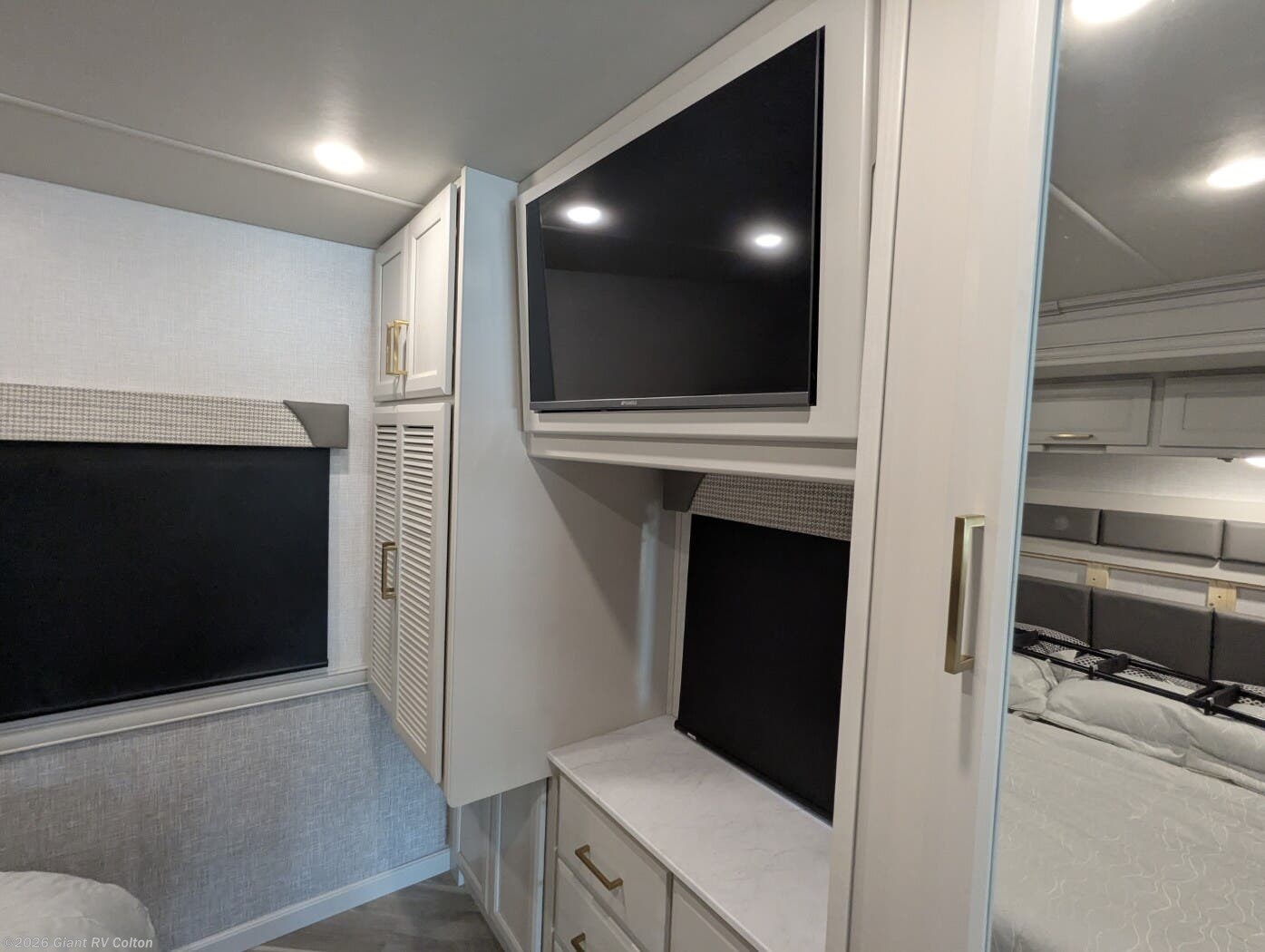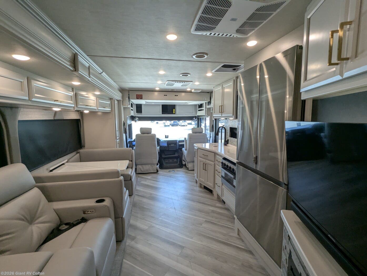 - Outdoor Entertainment: Features a 50" exterior LED TV, power awning with LED lights, 100W solar panel, and a 5.5kW Onan generator for off-grid adventures.