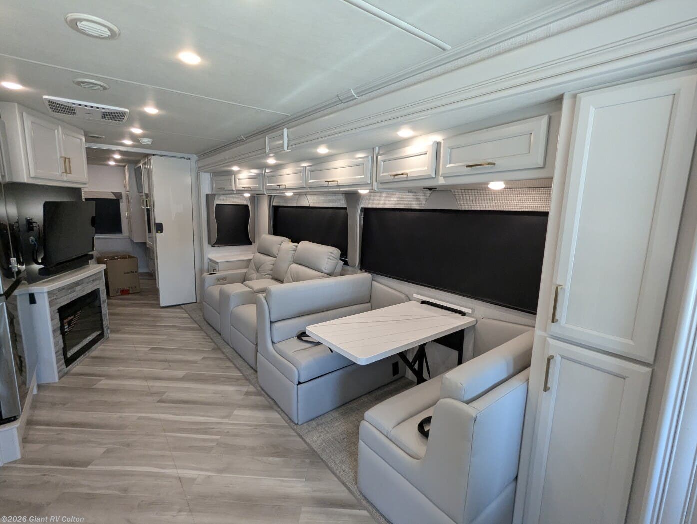 - Spacious Living Area: Includes a full-wall slide with a jackknife sofa, Rest EZ dinette, electric fireplace, and 50" LED Smart TV for relaxation.