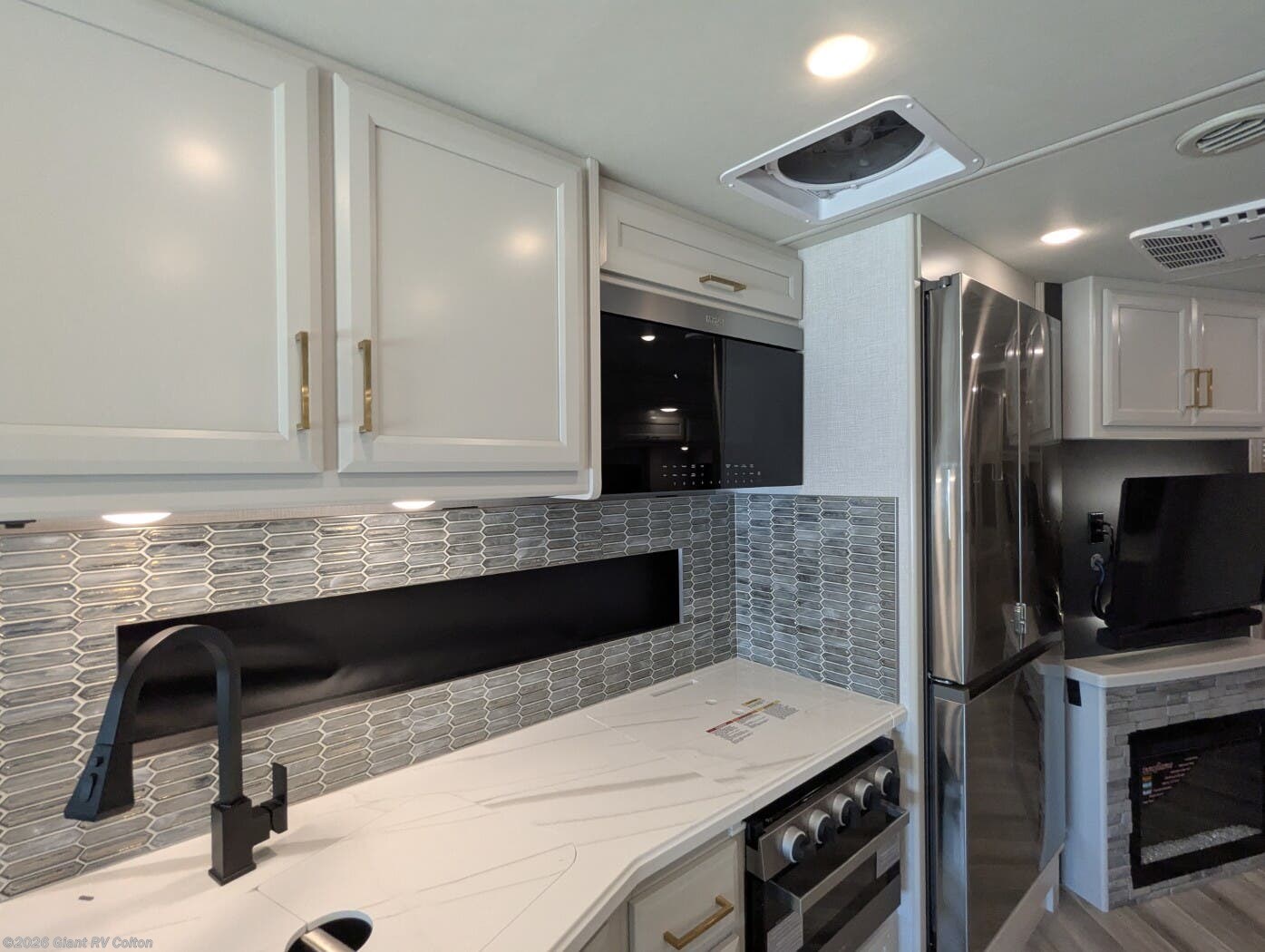 - Modern Kitchen: Equipped with a residential refrigerator, 3-burner cooktop, convection microwave, and solid surface countertops for gourmet meals.
