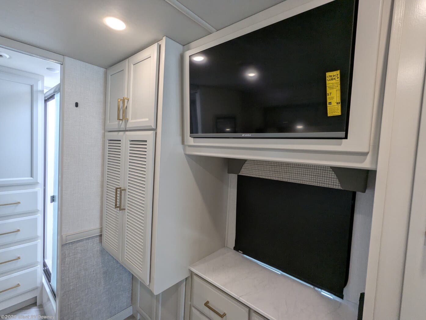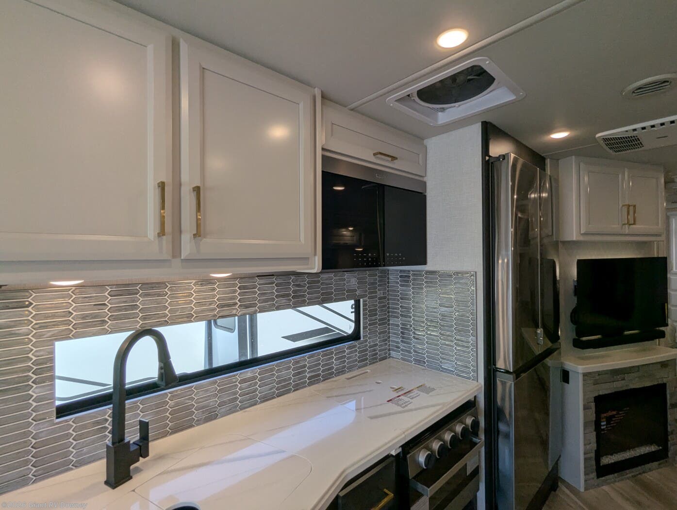 - Premium Amenities: Features air conditioning, a kitchen with a residential refrigerator, electric fireplace, and an exterior LED TV for entertainment.