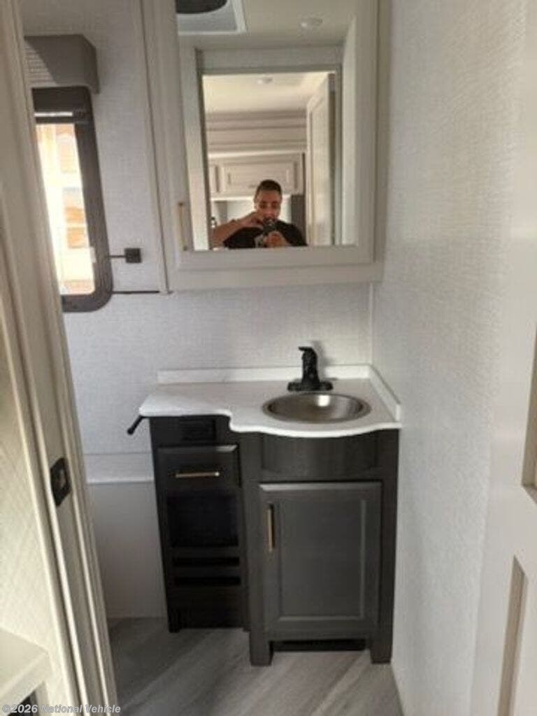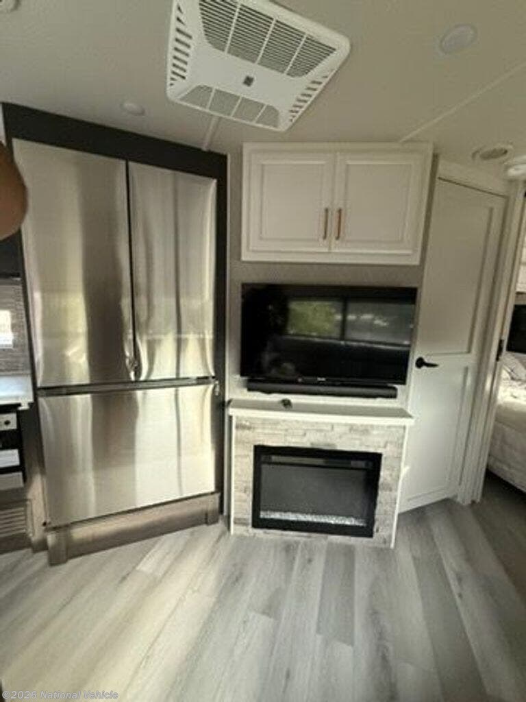 Entertainment abounds with 4 TVs?living room, bedroom, hide-a-loft, and exterior patio?paired with an electric fireplace that adds warmth and ambiance to your living space. Dual roof air conditioners, automatic leveling jacks, and central electric panels maximize comfort, while premium features like tankless water heater, porcelain toilet with water saver, and whole coach water filtration system elevate everyday living.