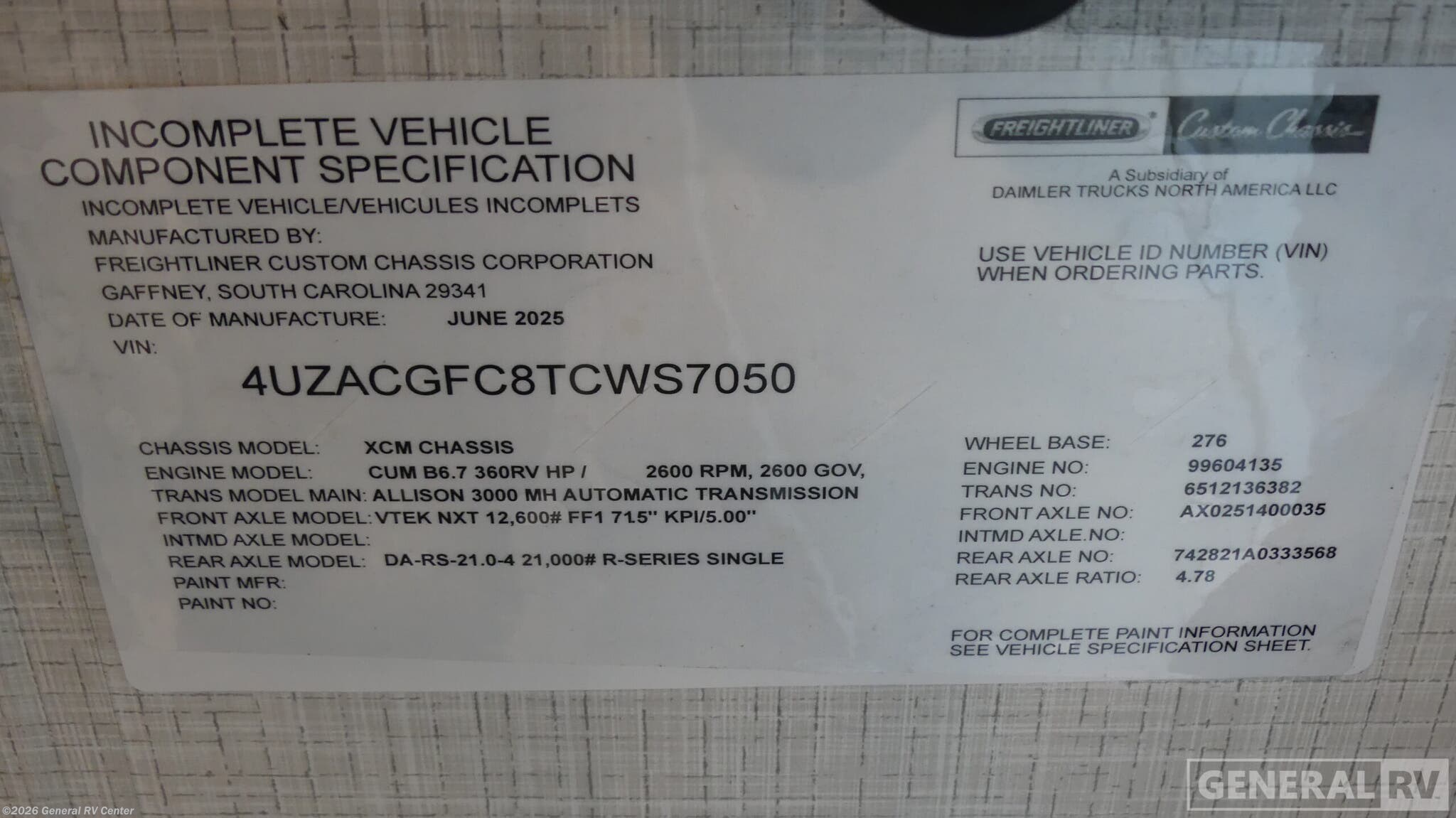 - VIN4UZACGFC8TCWS7050