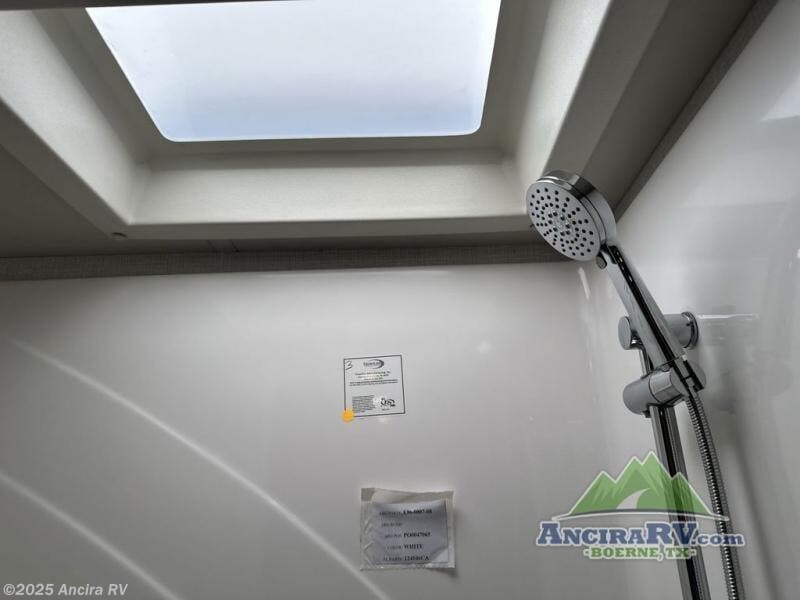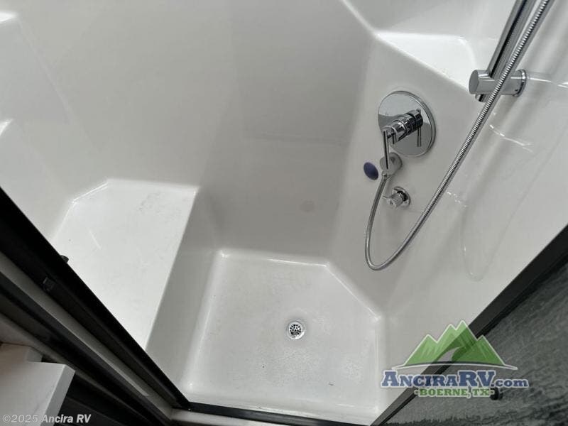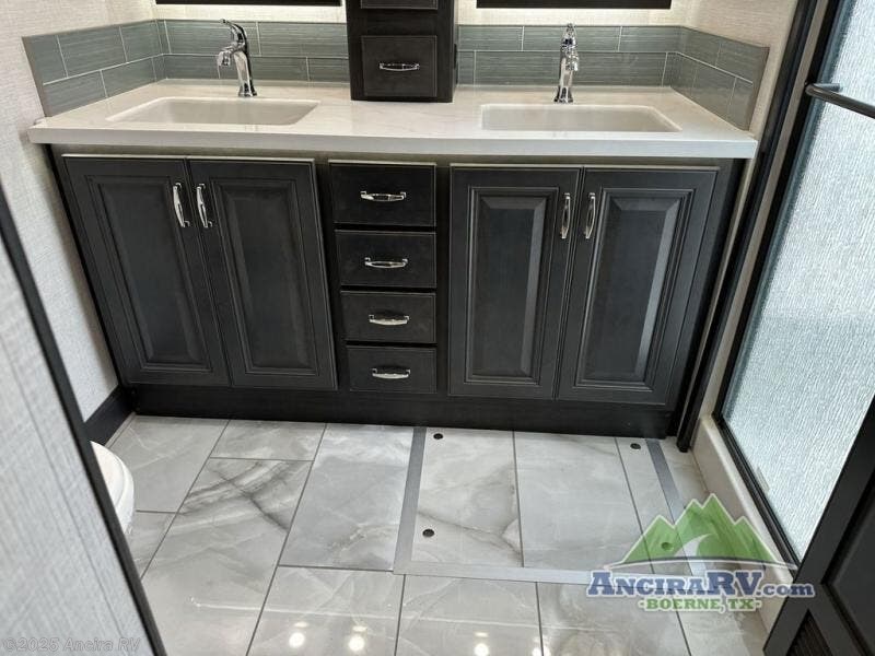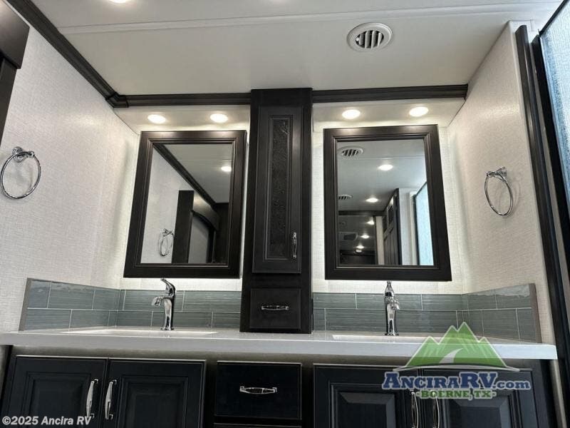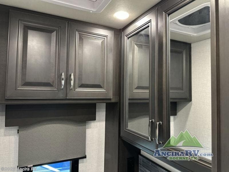 Travel for the love of it, work while traveling, or drive across country to see family and friends! You can do it all in this coach with luxury and residential features throughout and with many conveniences and comforts to keep you on the road. You will love the spacious full bathroom off of the master bedroom that offers two sinks, a fiberglass shower with a seat, glass door and designer shower head assembly. You will be able to keep everything clean using the stackable washer/dryer, and there is a linen closet for fresh towels. The king bed slide provides more floor space, and the two wardrobes, dresser and LED TV are more highlights in the bedroom. The mid-coach half bath is convenient especially when you have guests, and the sofa sleeper with pull-out full bed and the loveseat offer more sleeping space. You might like to add the Hide-A-Bed power drop-down overhead bunk option so you can invite more overnight guests. And the kitchen is something to boast about with the convection microwave, the residential refrigerator and the style of the polished solid surface galley countertop with lighting.