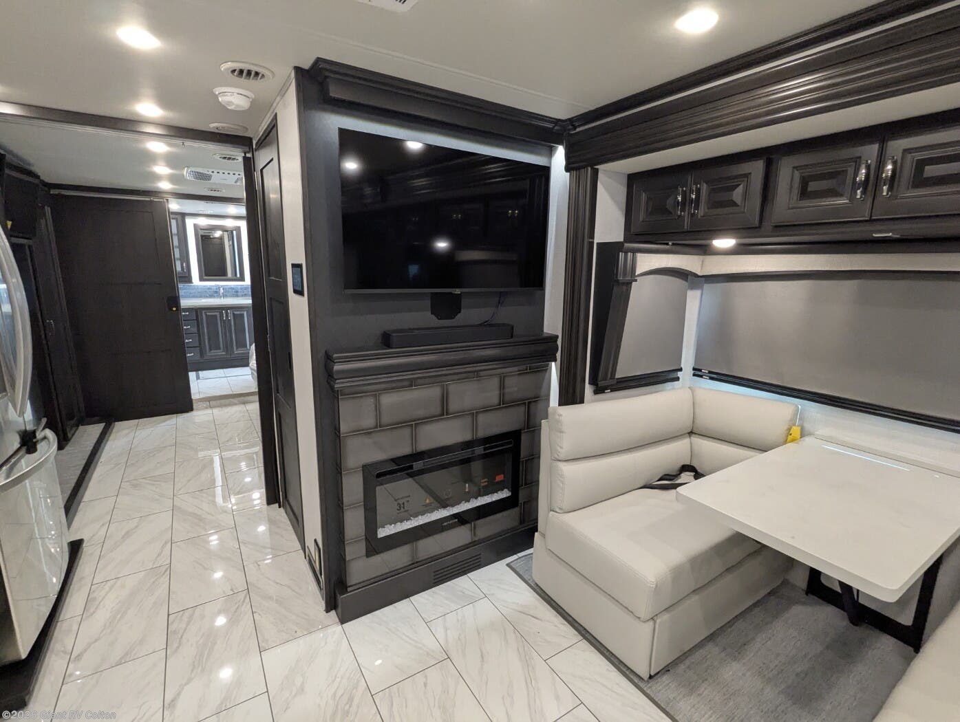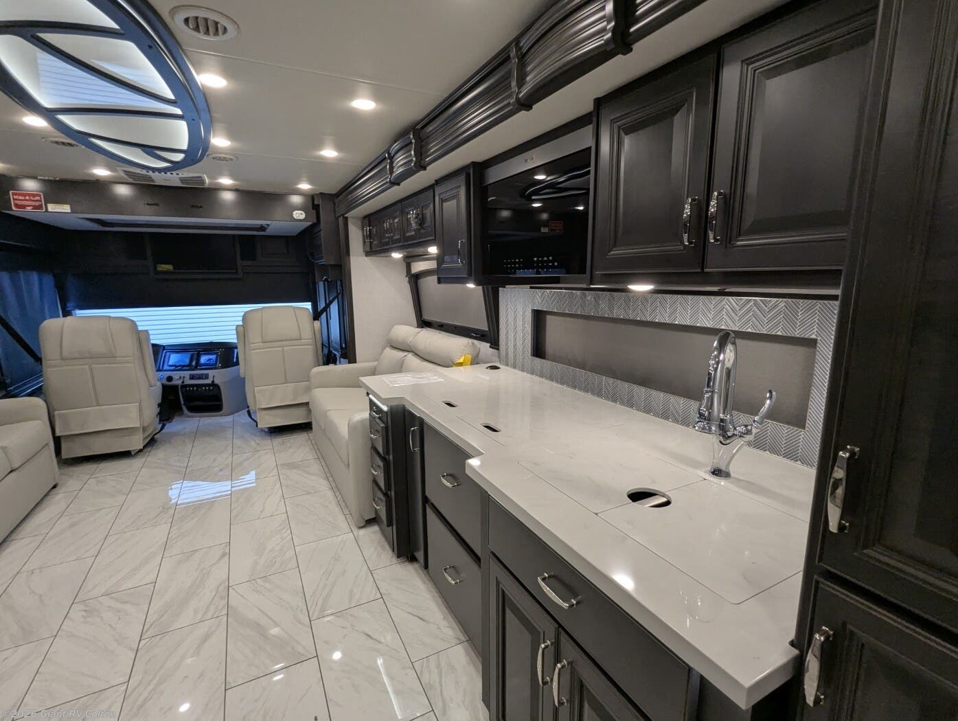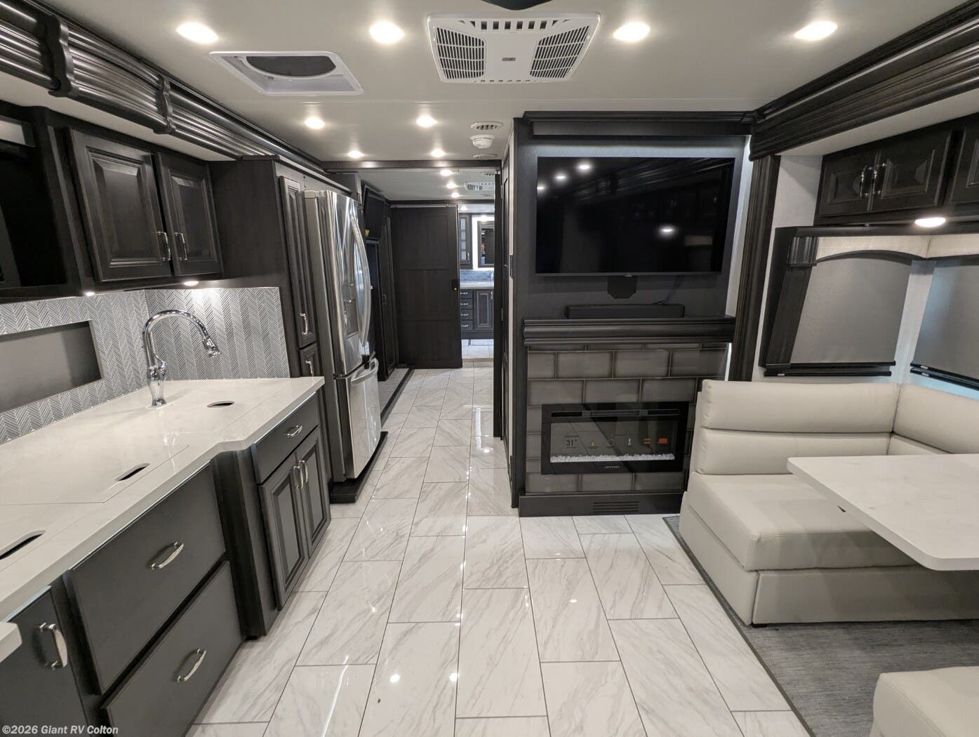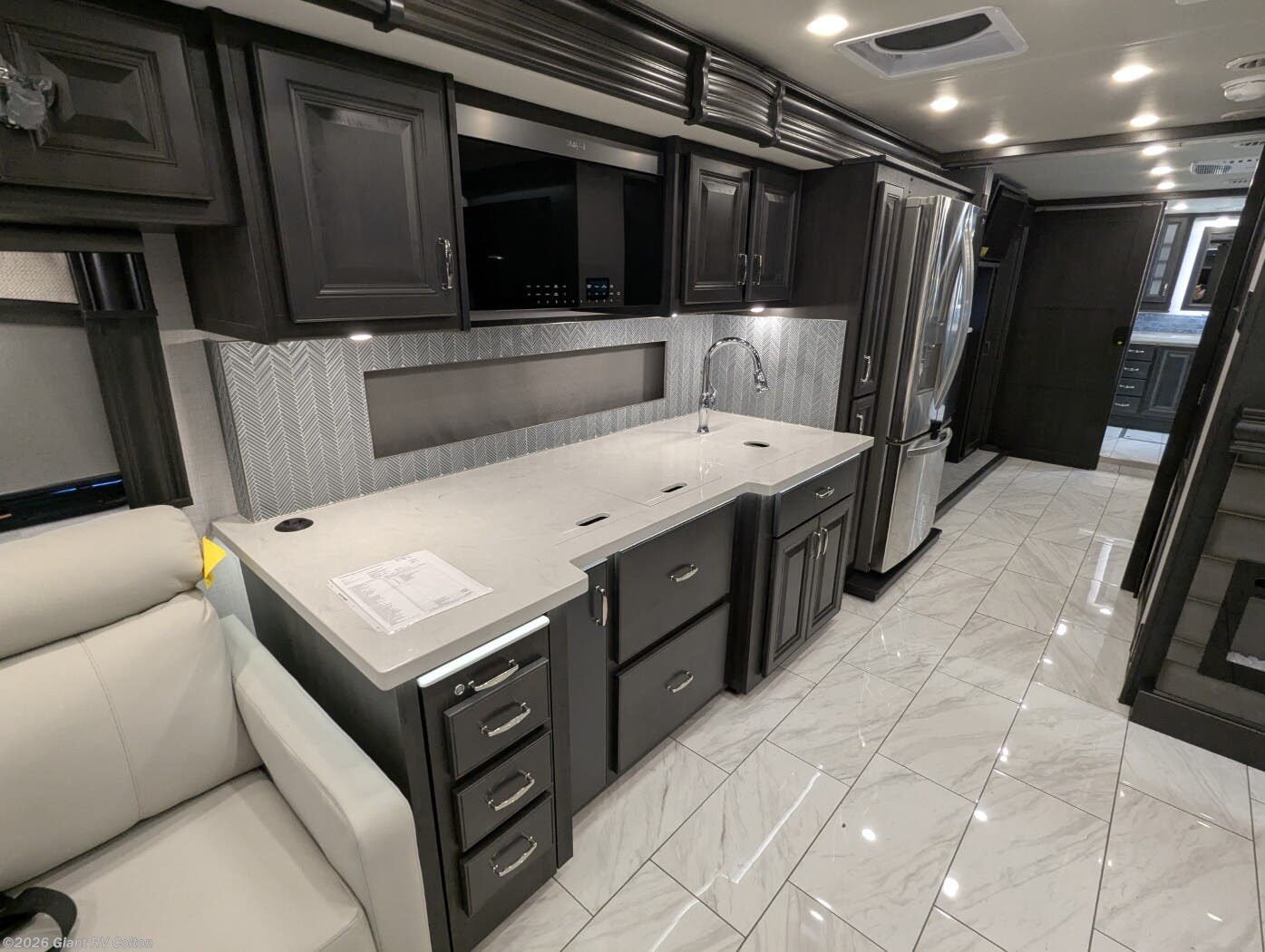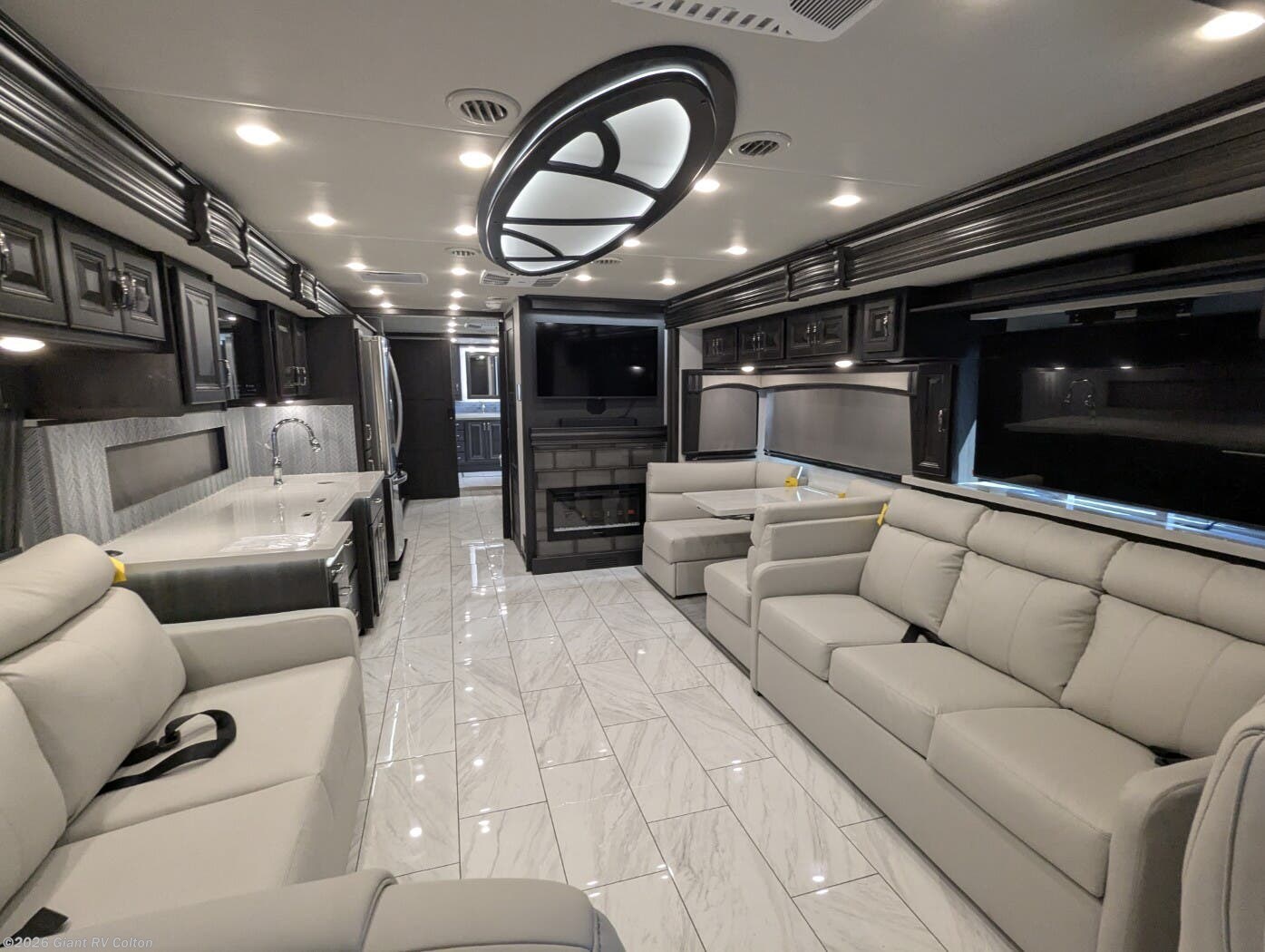- Modern Amenities: Features three 15K BTU A/C units with rear heat pump, a kitchen with residential refrigerator, three-burner cooktop, convection microwave, dishwasher, and dual baths for easy family living.