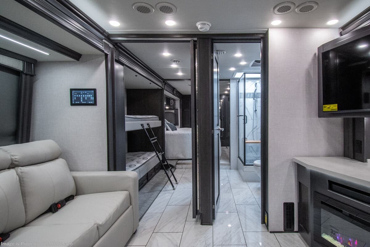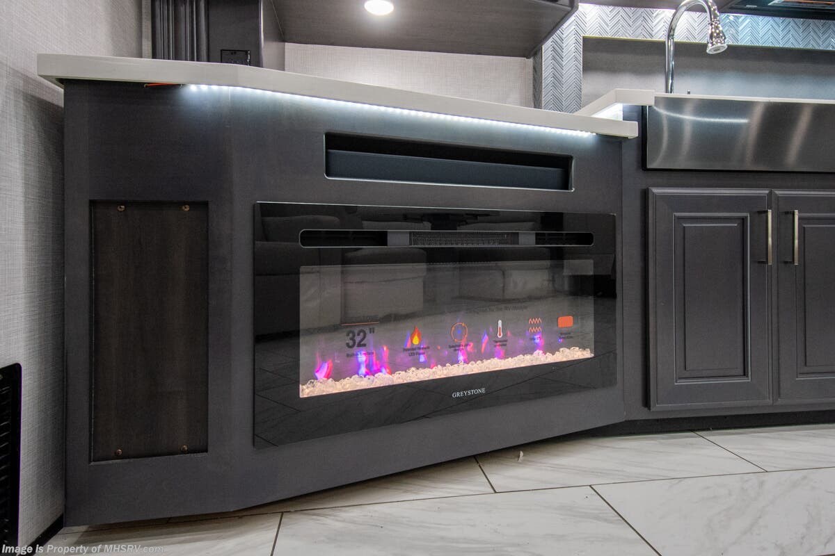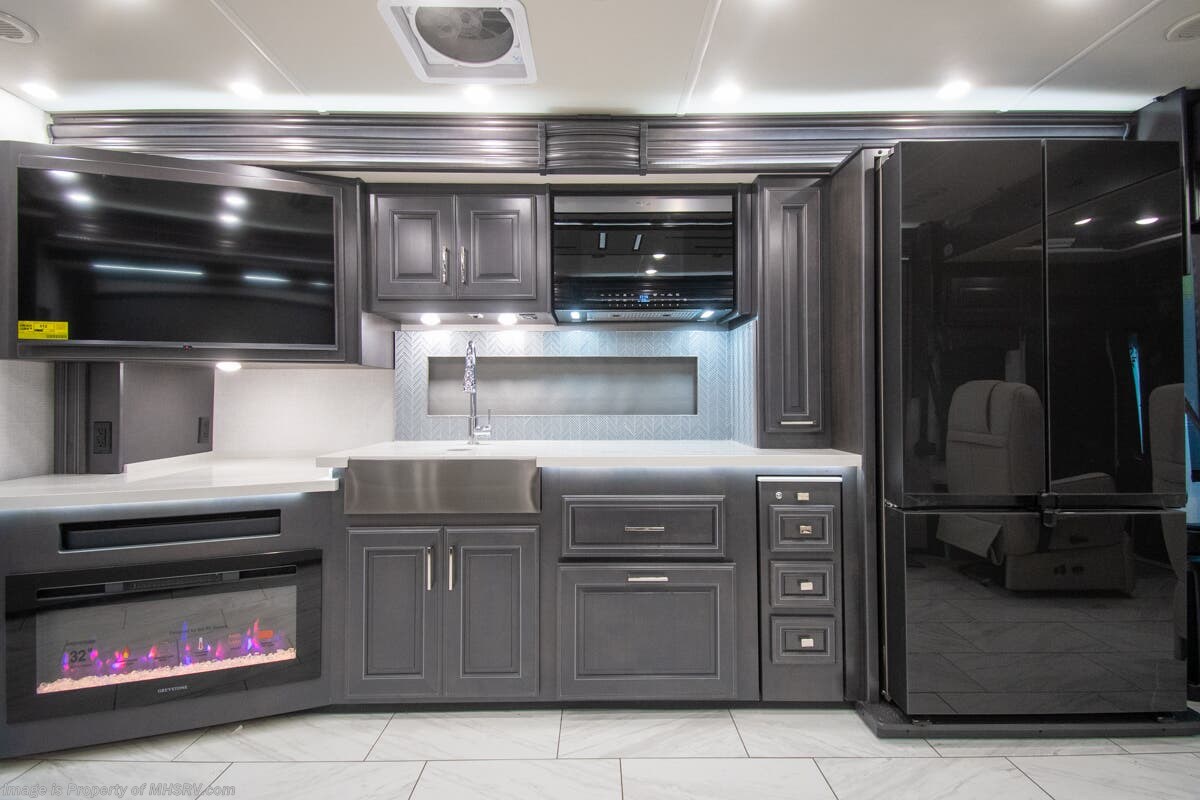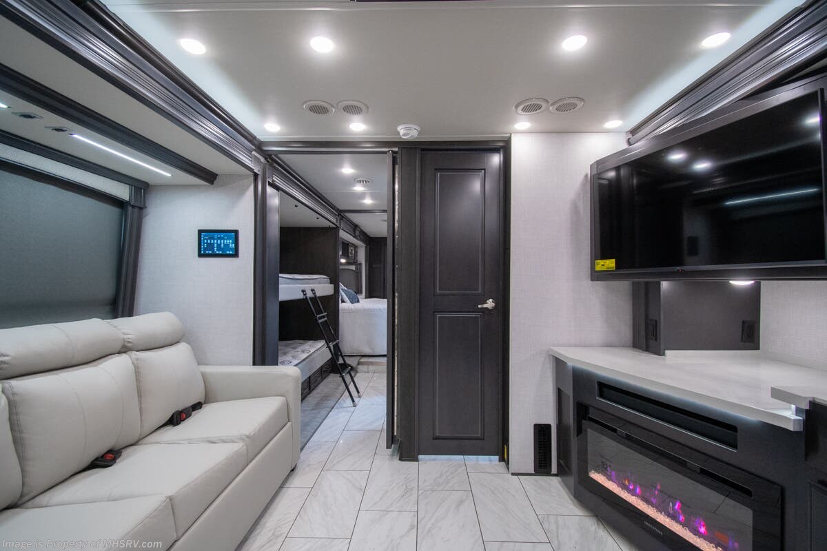 More About This RV This Beautiful RV is approximately 41 feet 4 inches in length and features 2 slides including a full-wall slide, king bed, exterior freezer, fireplace, Cummins L9 diesel engine, Freightliner Freedom Bridge Custom Chassis, Allison 3000 MH transmission, tire pressure monitoring system, heated fresh water and holding tank compartments, molded-fiberglass one-piece roof, automatic hydraulic leveling jacks, 7-way round tow connection, automotive one piece windshield and large living area.