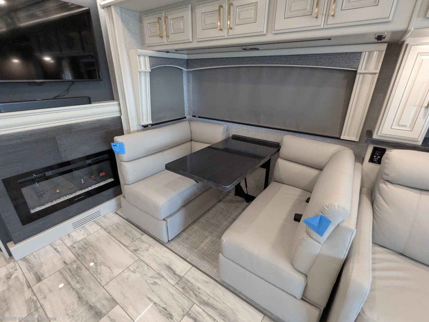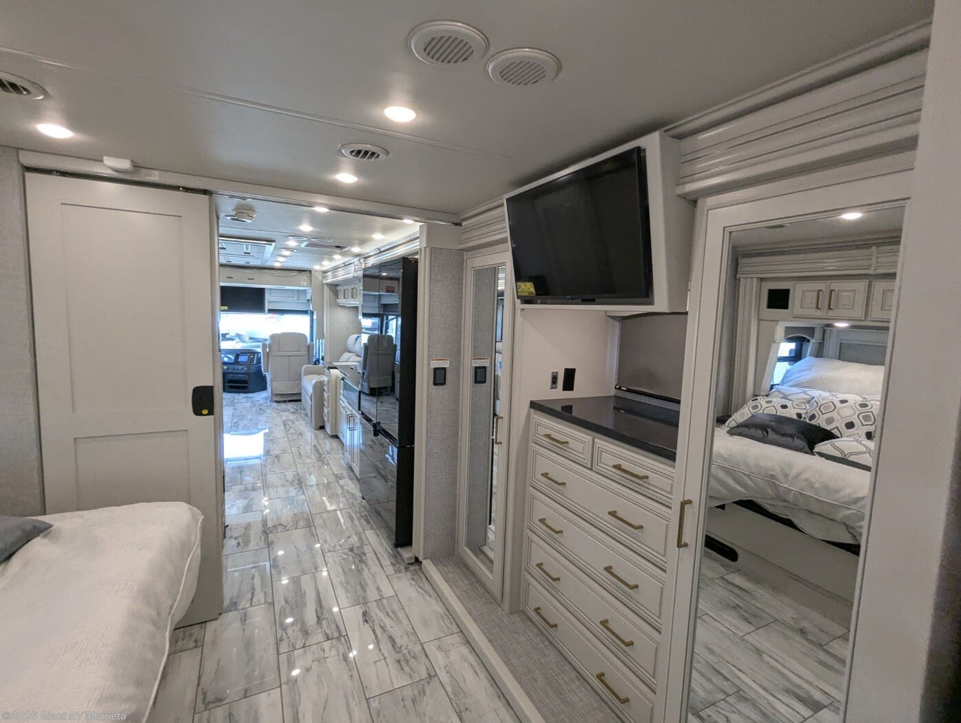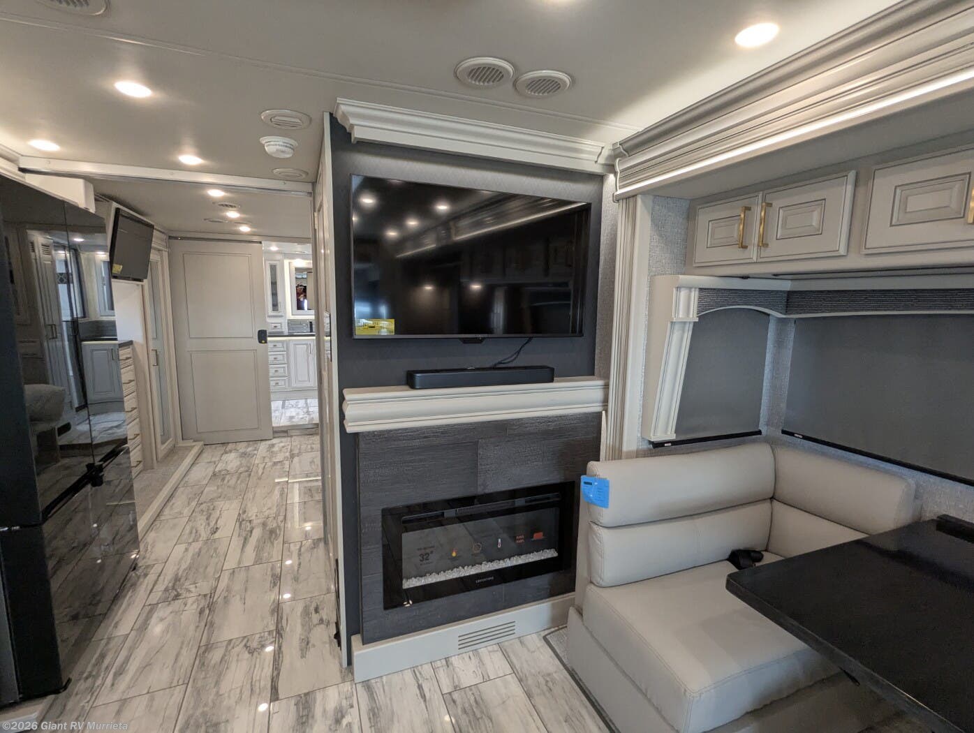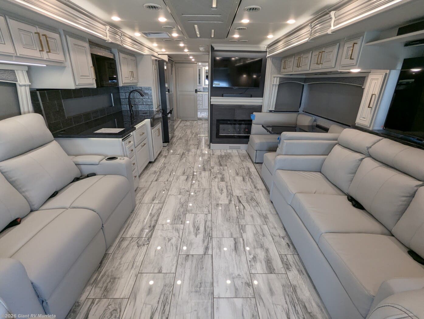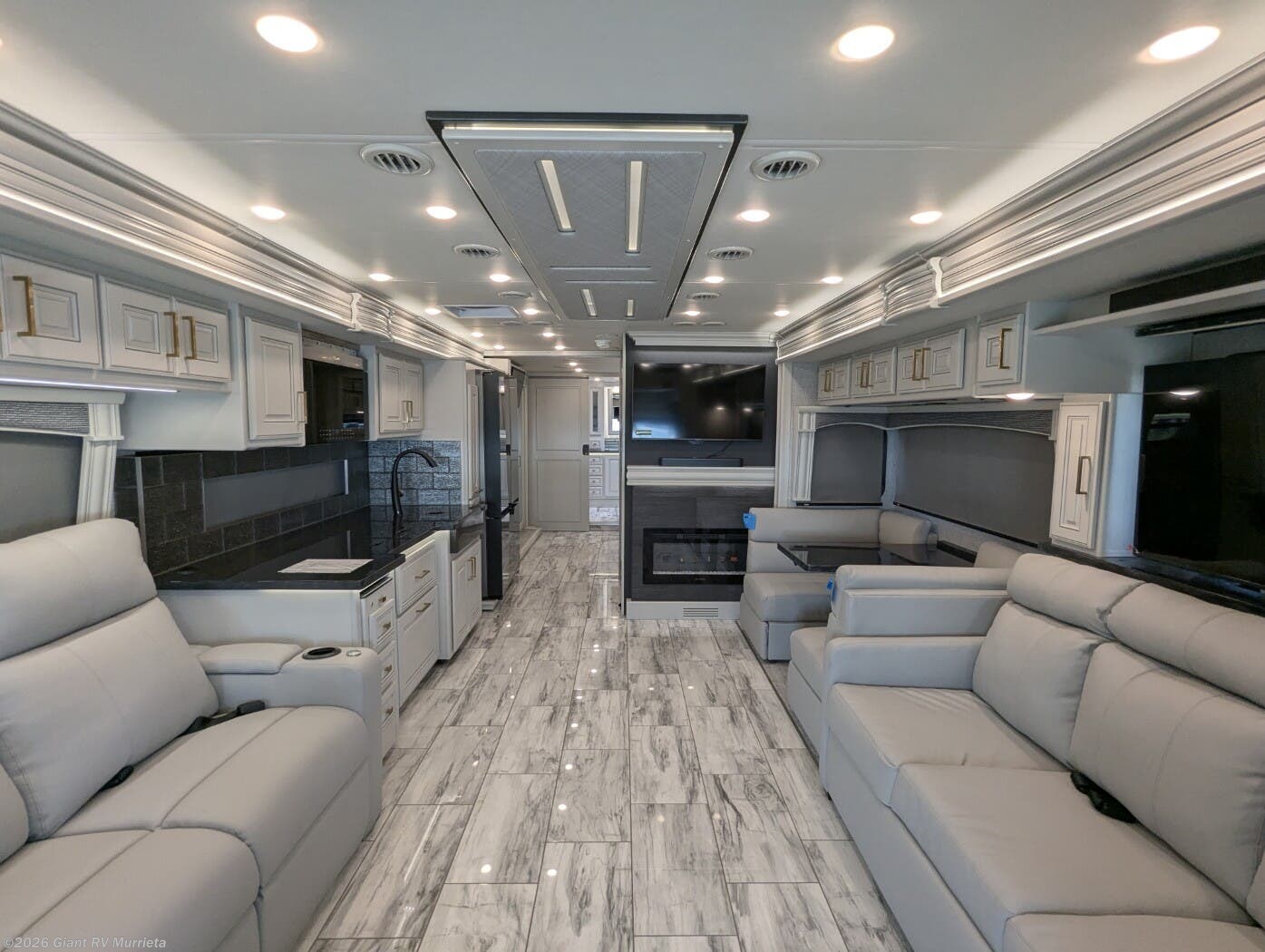 - Luxury Amenities: Features dual air conditioning units, a kitchen with a residential refrigerator, convection microwave, 49” pop-up LED TV, and fireplace.