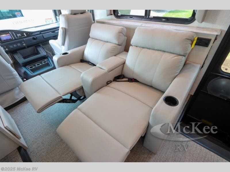 If you're hoping for a luxurious getaway, look no further than this Flair Class A gas motorhome! You can sleep in peace in your own private bedroom, and the full bathroom with shower skylight is directly connected to the bedroom for easy morning routines. Next to the residential refrigerator is a pantry, so you have great kitchen storage, and you also have a three-burner range to cook those foods on. A jackknife sofa gives you lounging and sleeping space, and you have a Wi-Fi Ranger Sky4 to keep connected to the modern world.