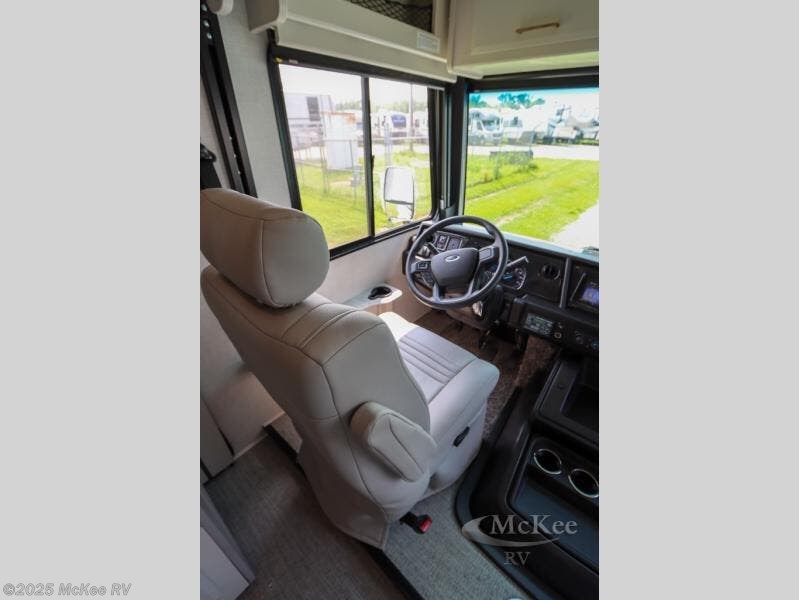 Step up your camping game by adding the Fleetwood Flair Class A gas motorhome to the line-up! The 7.3L 335HP engine with 468 LB/FT of torque forms the base, and the 8,000-LB towing capacity gives you the chance to bring a car with your coach. On the exterior you'll find an automotive, bonded one-piece windshield, exterior-mounted sideview cameras, and an exterior LED TV. The interior is decked out with a dash radio, an electronic instrument panel, and reclining/swivel cab chairs. There is also a workstation at the automotive-style dash, and the Bluetooth coach system in the bedroom has exterior speakers for fun party nights.