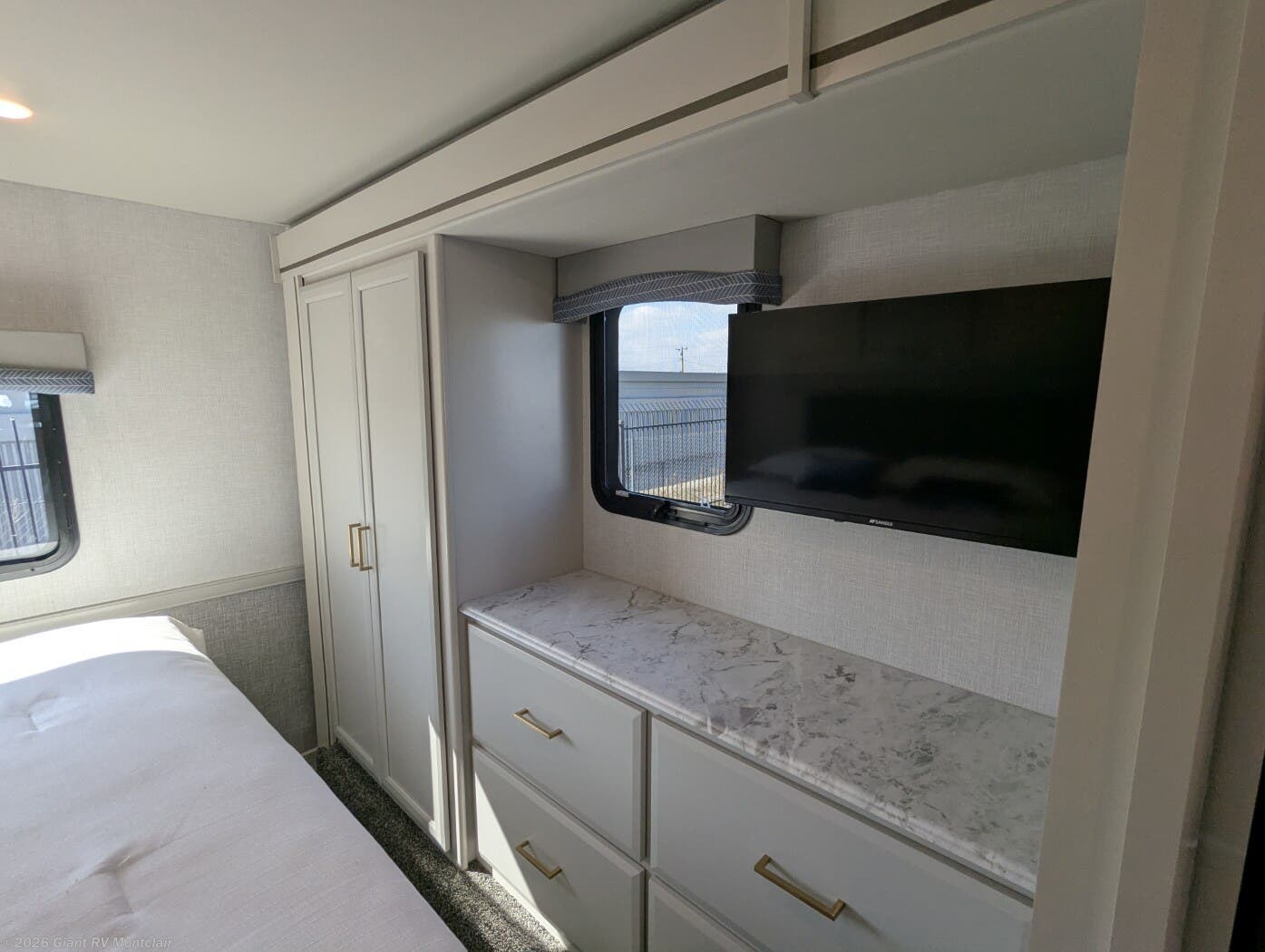 Hit the road in style with the 2026 Fleetwood Flair 29M, a luxurious Class A motorhome perfect for families seeking adventure. Built on a Ford F-53 chassis, this new RV features a 31 ft. layout with a full-wall slide, rear bedroom, and L-shaped dinette for spacious relaxation. Available at Giant RV in California, the Flair 29M blends power and comfort for your camping getaway!