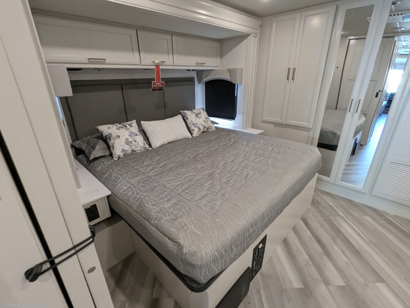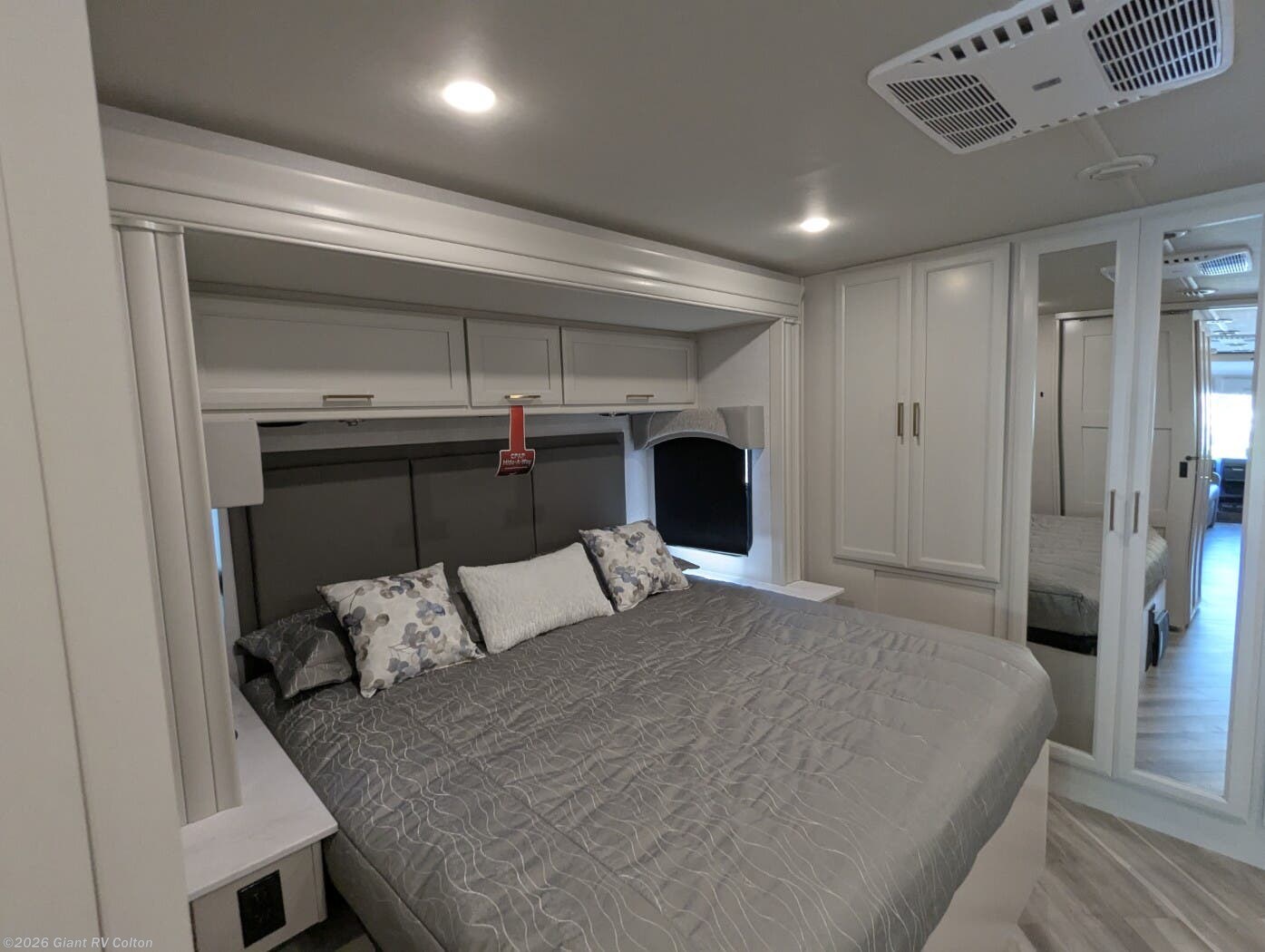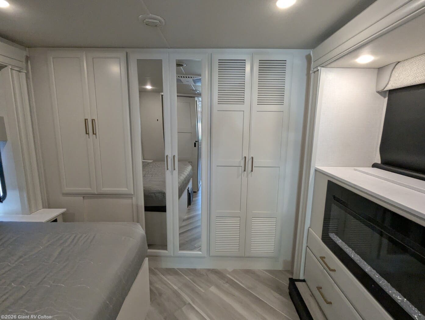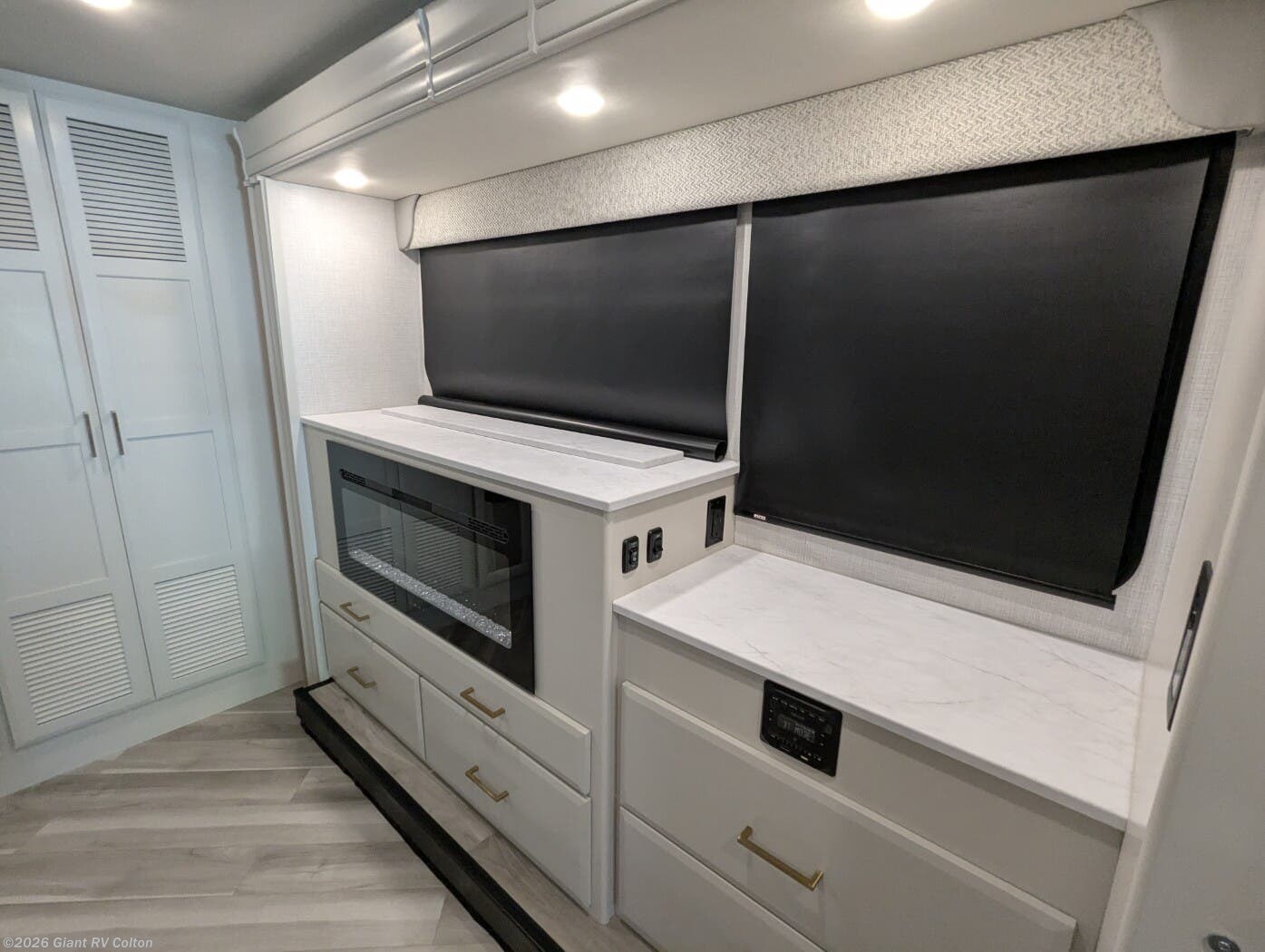 - Private Bedroom: Features a Serenity Series RV king bed slide, full-width wardrobe, and LED TV with fireplace for cozy relaxation.