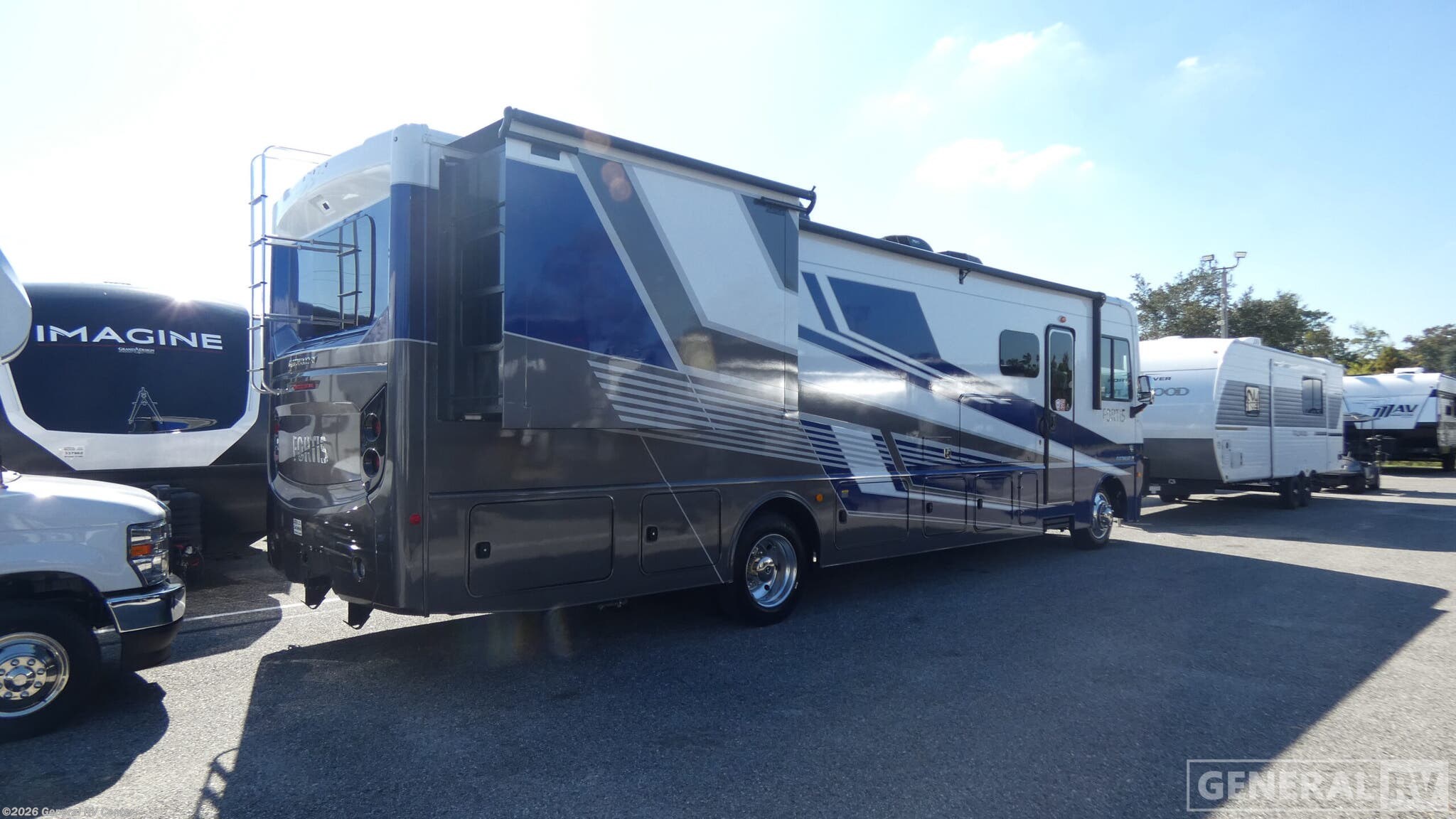 Experience the perfect blend of luxury and functionality with the 2026 Fleetwood Fortis 34MB. This motorhome is designed to accommodate up to six guests comfortably, featuring a serene King bed, and convertible dinette. The front kitchen layout, equipped with a full-size electric refrigerator and a three-burner cooktop, makes meal preparation a delight, while the center living area offers a spacious haven with theater seats and dream dinette for relaxation and entertainment. The Fortis 34MB ensures a seamless travel experience with its powerful Ford F53 chassis, boasting 335 horsepower and 468 torque. Despite its robust capabilities, it maintains a sleek profile at 35.75 feet in length and 12.83 feet in height. Enjoy the convenience of a 20-foot powered retractable awning for outdoor leisure, while the interior features a center bath with a stylish plastic/glass shower. With a generous 100-gallon fresh water capacity and ample storage, this RV is your ultimate companion for extended adventures. Discover more at your nearest General RV dealership and elevate your travel lifestyle today!