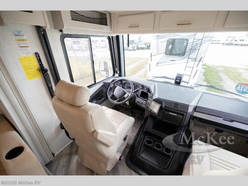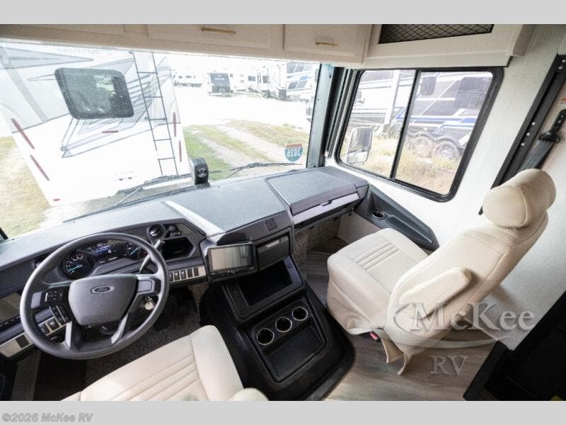 The Fleetwood Fortis Class A gas motorhome is a powerhouse of luxury and convenience, and it also is quite literally a powerhouse with its Ford 7.3L V8 335HP engine with 468 LB/FT of torque. The construction includes a Dryseal edge coating for all ceilings, walls, and floor, and the Powerlock System 2 has interlocking walls to the roof for stability. Automatic hydraulic leveling jacks make the set-up process easier, and the cab has excellent features, like a 9" stereo with AM/FM/Bluetooth, backup camera, reclining/swivel cab seats, driver/passenger center table, and an automotive-style dash with dual monitors and workstation. You will find vinyl tile flooring all throughout the interior, as well as full-extension drawer guides with latches, coordinating window treatments, and energy-efficient LED flush-mount ceiling lighting.