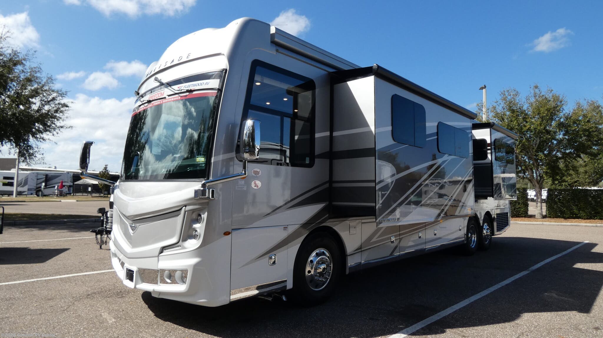 Fleetwood Palisade 40H Class A Diesel highlights: - Solid Hardwood Cabinetry - Bath and a Half - XL Hand-Laid Tile Shower - Fireplace - Exterior TV Travel in comfort and confidence with the Palisade 40H, a luxury diesel coach designed to make every destination feel like home. Inside, you’ll find beautiful solid hardwood cabinetry paired with heated porcelain tile flooring for a refined and welcoming atmosphere. Solid surface countertops and residential-style appliances provide both elegance and everyday functionality, making meal prep on the road simple and enjoyable. The spacious bath features an impressive XL custom hand-laid tile shower, offering a spa-like experience wherever you roam. A convenient stackable washer and dryer add practicality for extended trips, allowing you to travel longer without sacrificing convenience. On the exterior, the custom full-body paint delivers a bold, eye-catching presence, while the Onan generator ensures dependable power when you’re off the grid. Oversized luggage bays and trays offer abundant storage for all your gear, and the top-mount wiper system enhances visibility in changing weather conditions. With thoughtful design details and premium craftsmanship throughout, the 2026 Palisade 40H delivers the comfort, style, and reliability you expect from a luxury Class A diesel motorhome.