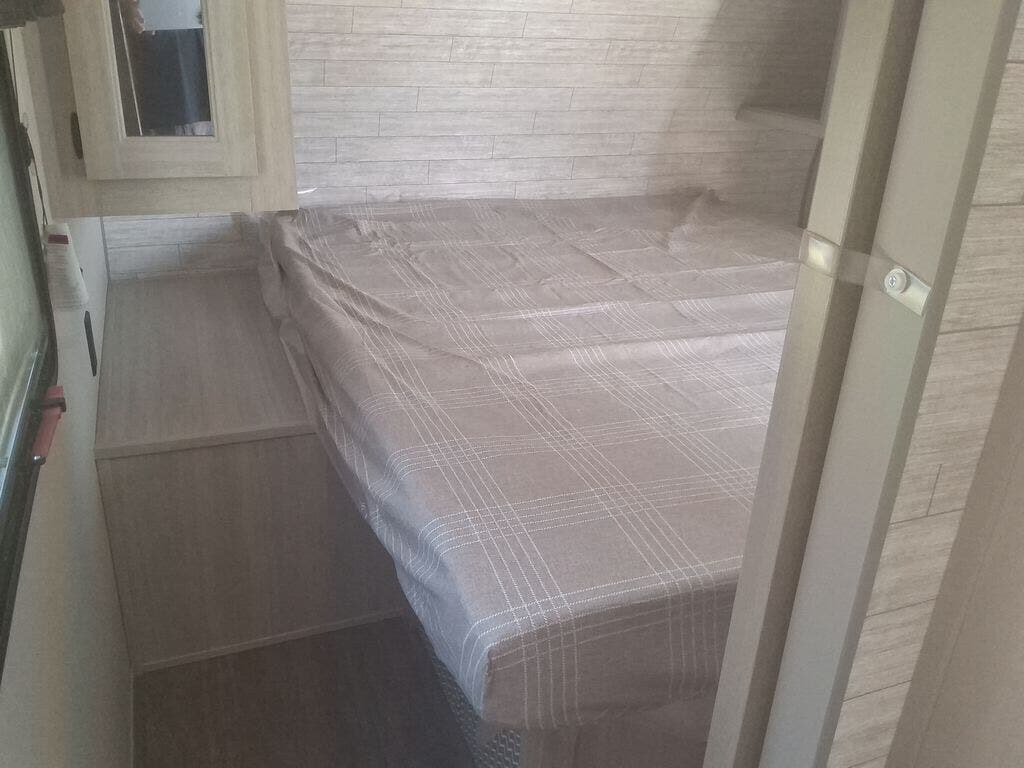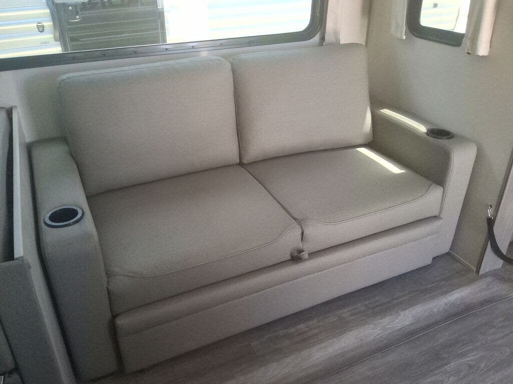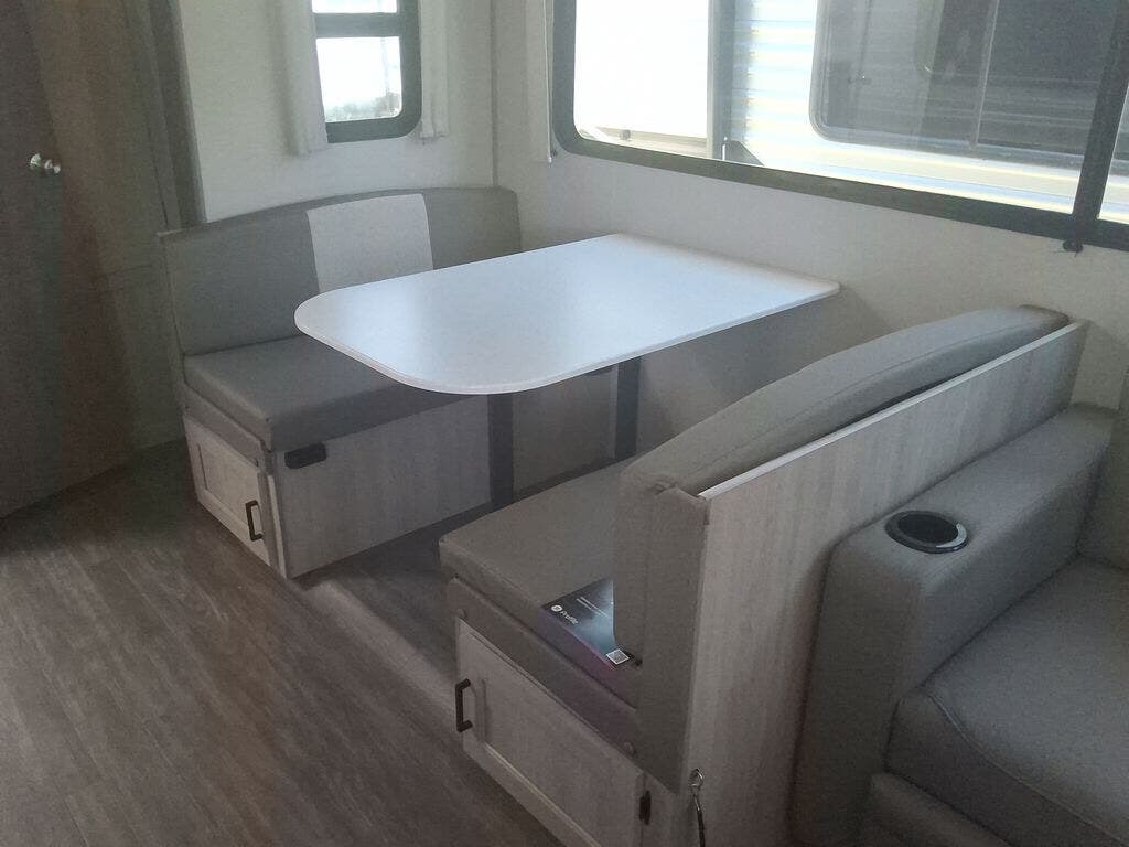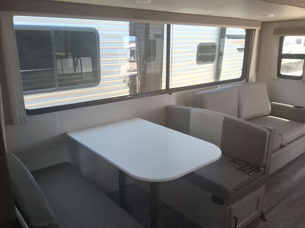 Sleeps up to 5 with a walk-around queen bed, jackknife sofa, and convertible booth dinette