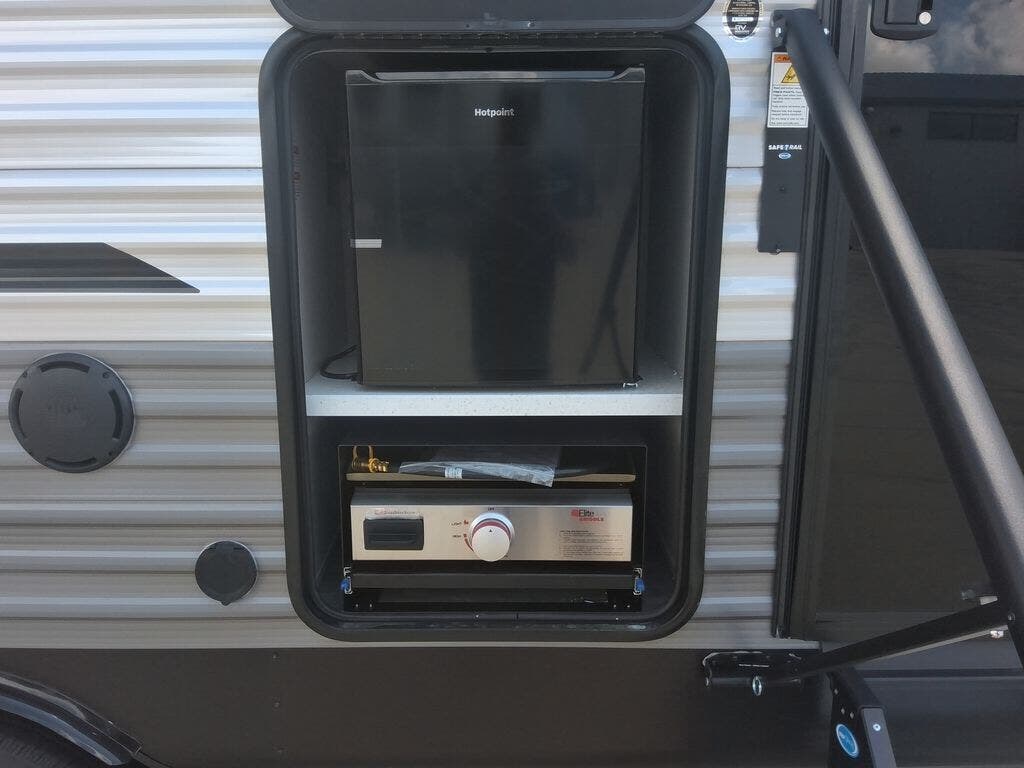 Exterior kitchen with mini fridge and griddle for outdoor cooking