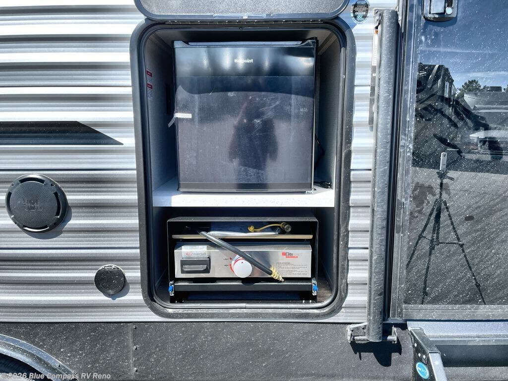 When you are ready to camp with your favorite person, this trailer offers the perfect couples trailer with space for an overnight guest on the booth dinette. You will have a front bedroom with a walk-around queen bed, dual wardrobes and overhead cabinets for your belongings. The main living and kitchen area is spacious with a slide out dinette and sofa giving you more floor space, dining and relaxing seating, and extra sleeping space for friends once the furniture is easily setup. There is a wardrobe/pantry next to the rear corner bathroom complete with a radius shower. The galley kitchen includes full amenities, plus there is an outside kitchen with a griddle and mini refrigerator. Everyone will enjoy the entertainment center when inside, and the 18' awning offers a covered outdoor living area, just grab your chairs from the pass-through compartment.