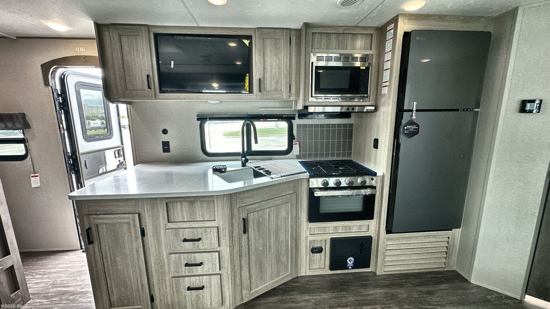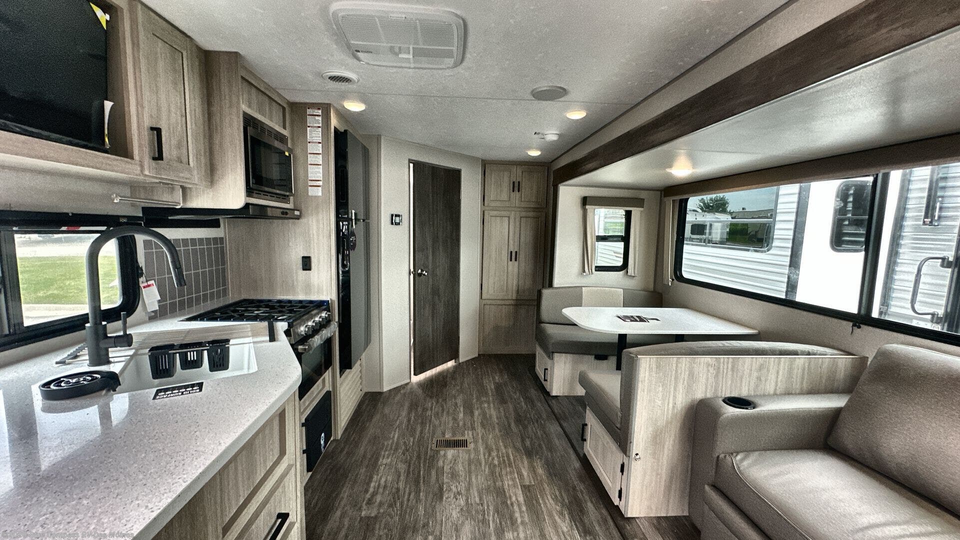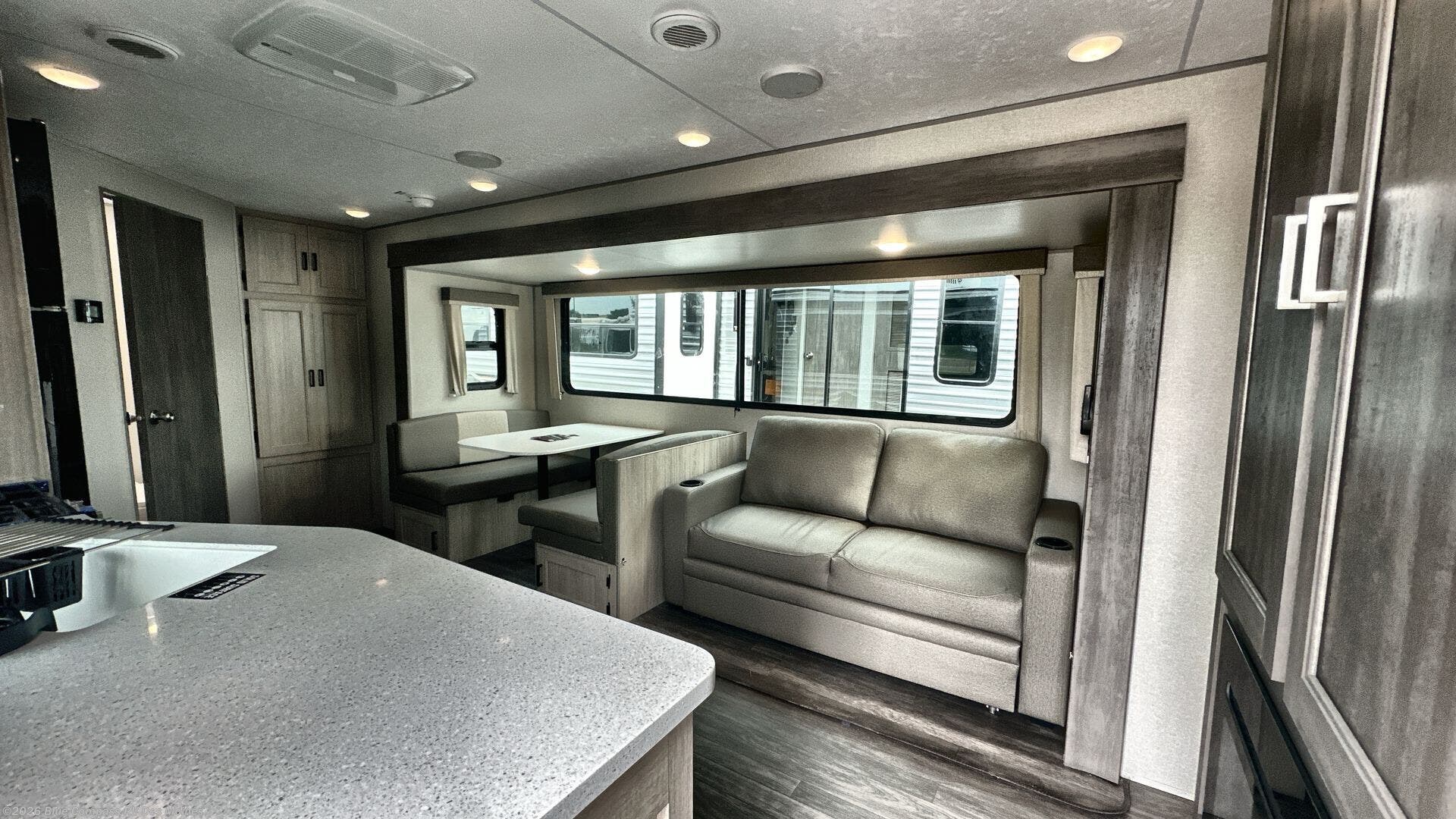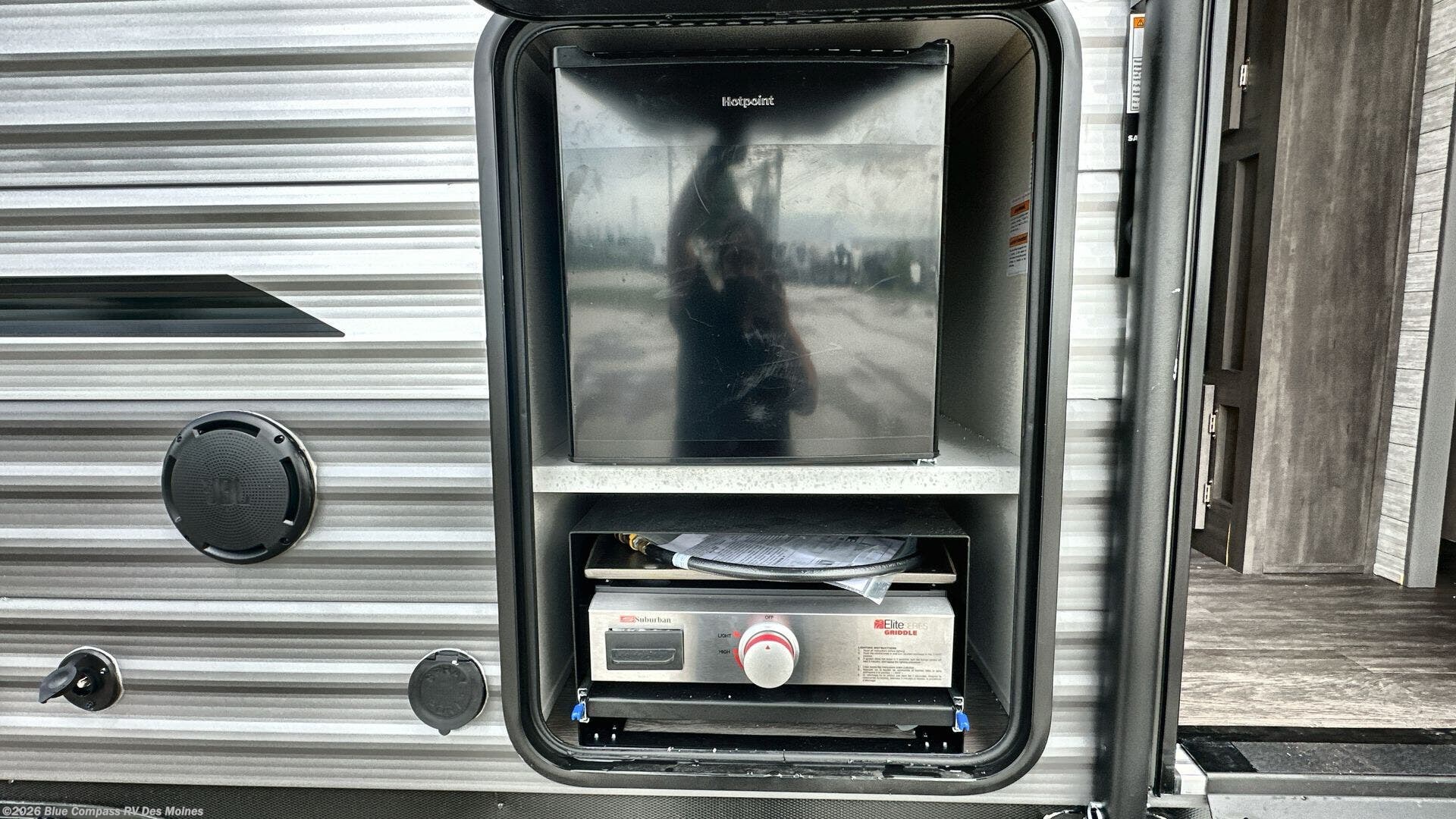 When you are ready to camp with your favorite person, this trailer offers the perfect couples trailer with space for an overnight guest on the booth dinette. You will have a front bedroom with a walk-around queen bed, dual wardrobes and overhead cabinets for your belongings. The main living and kitchen area is spacious with a slide out dinette and sofa giving you more floor space, dining and relaxing seating, and extra sleeping space for friends once the furniture is easily setup. There is a wardrobe/pantry next to the rear corner bathroom complete with a radius shower. The galley kitchen includes full amenities, plus there is an outside kitchen with a griddle and mini refrigerator. Everyone will enjoy the entertainment center when inside, and the 18' awning offers a covered outdoor living area, just grab your chairs from the pass-through compartment.