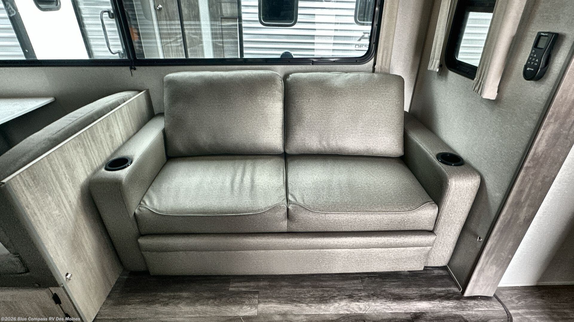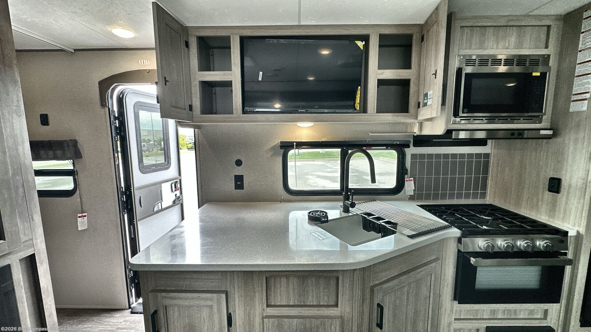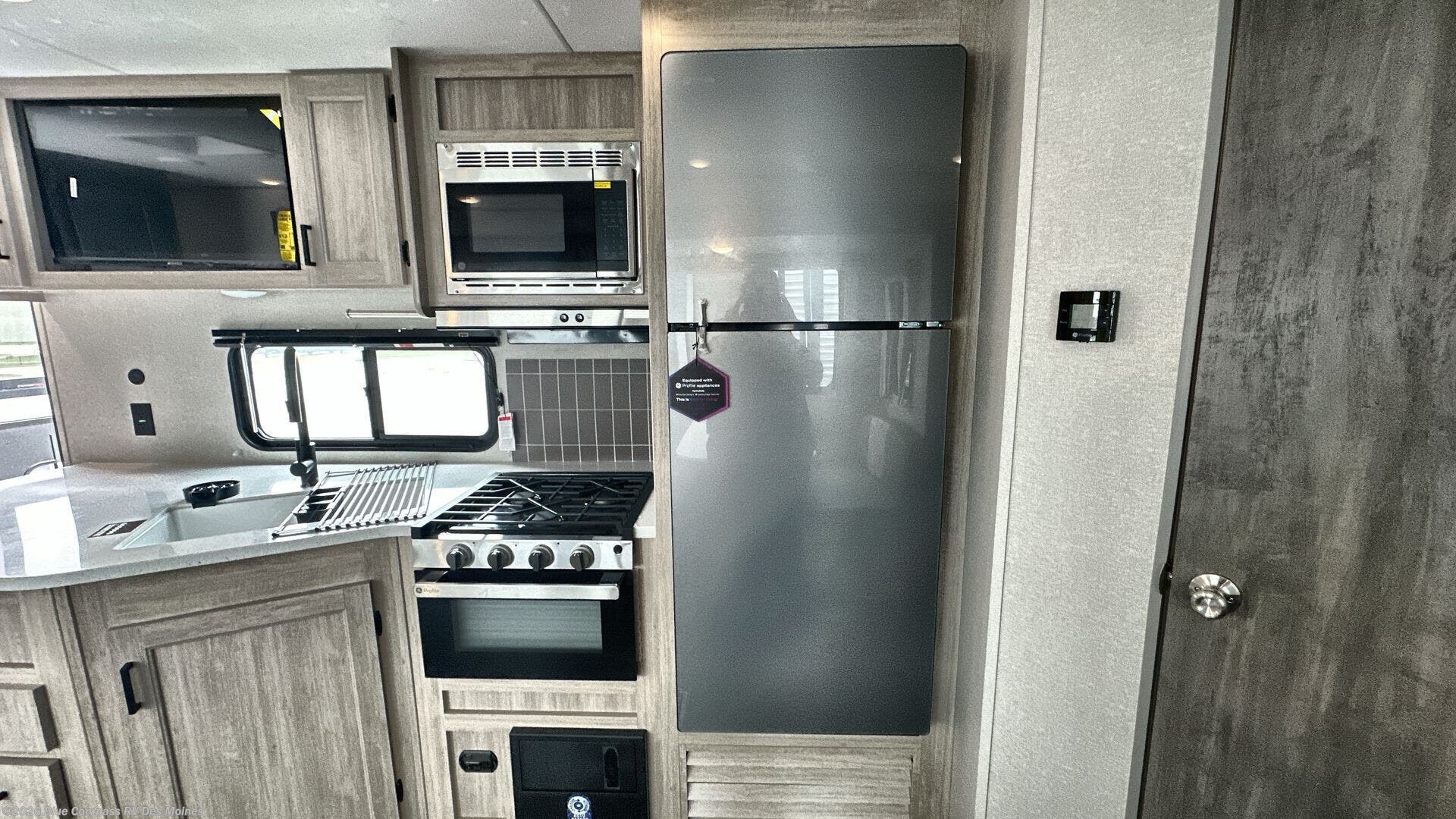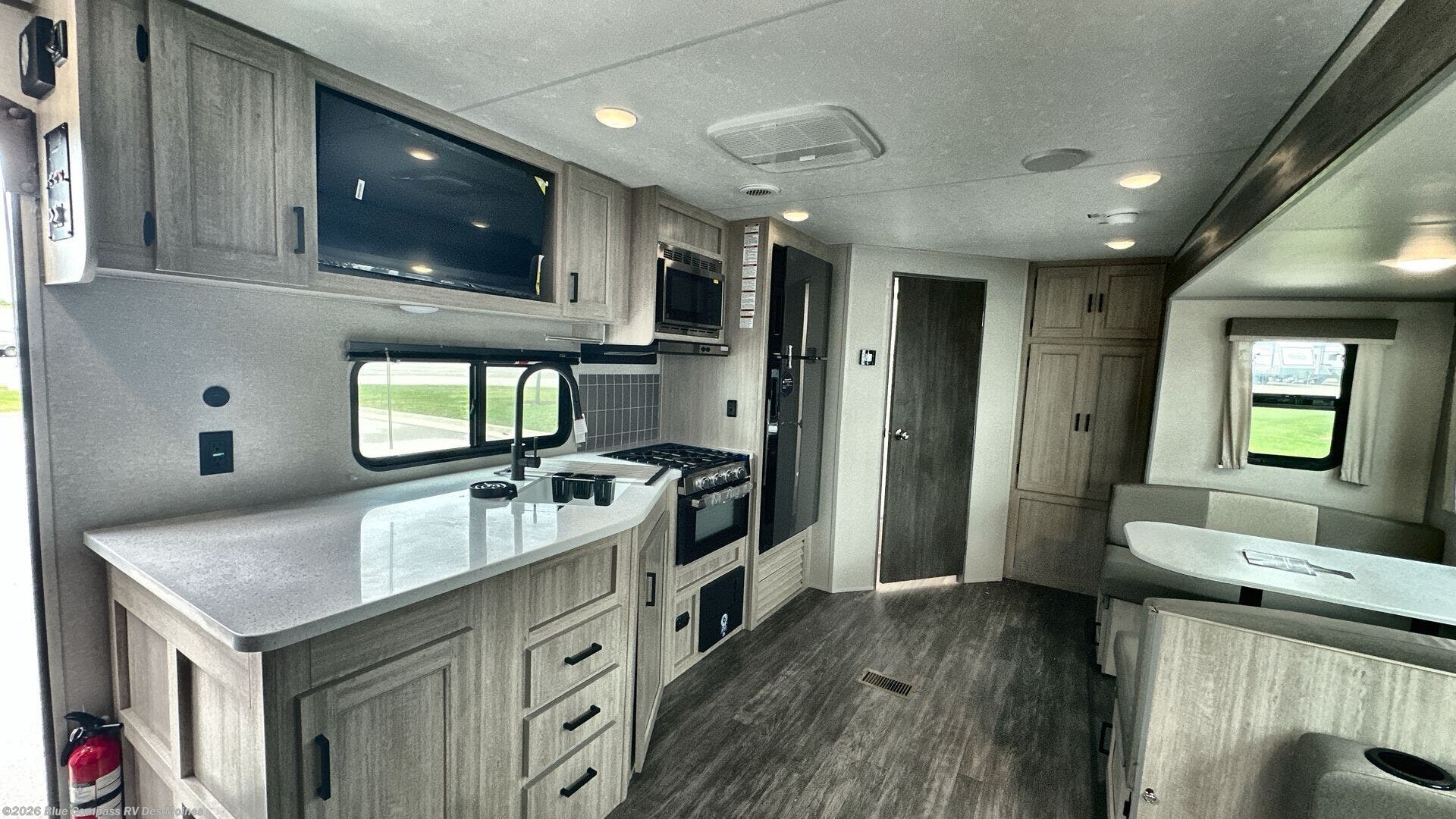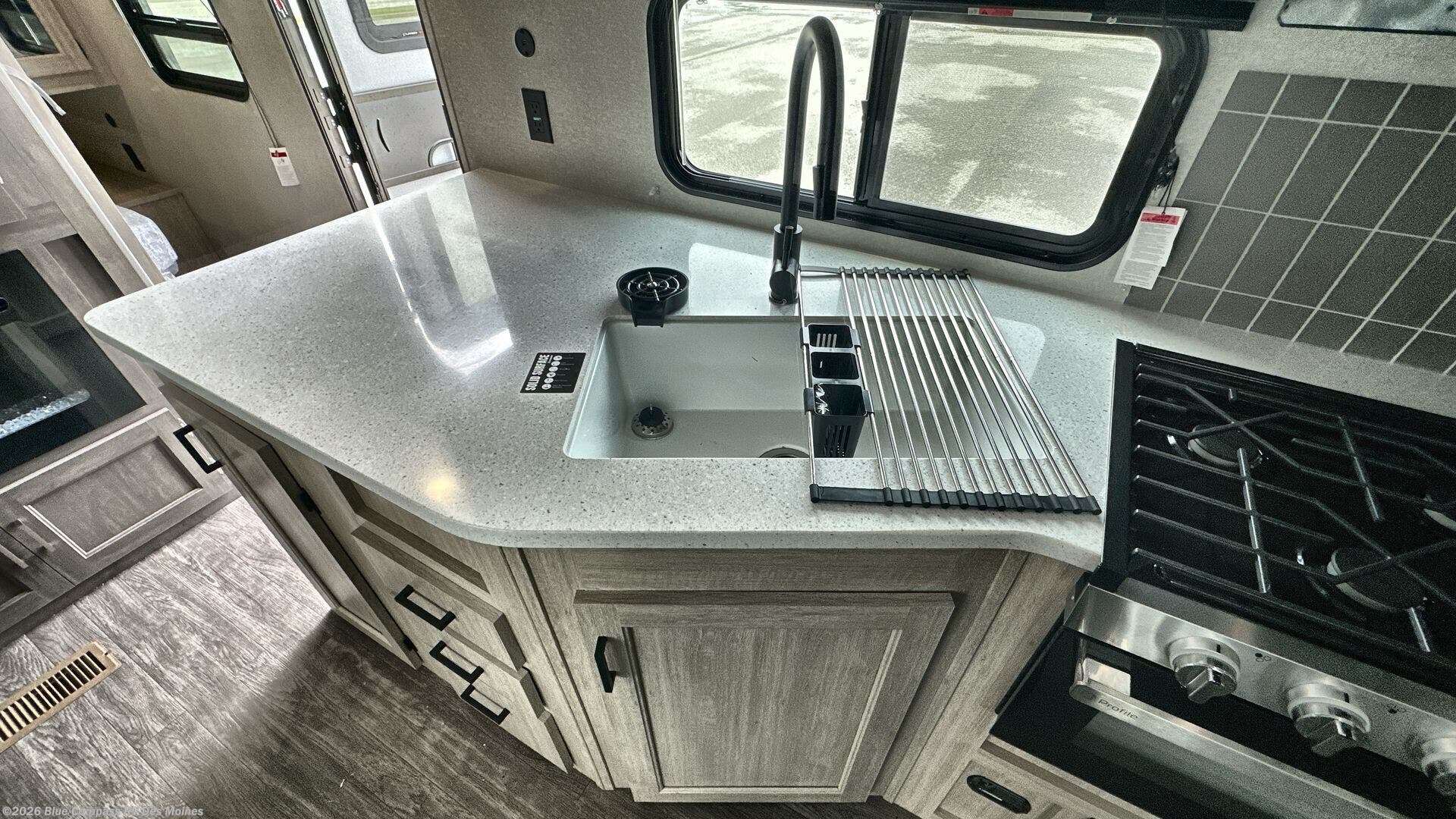 When you are ready to camp with your favorite person, this trailer offers the perfect couples trailer with space for an overnight guest on the booth dinette. You will have a front bedroom with a walk-around queen bed, dual wardrobes and overhead cabinets for your belongings. The main living and kitchen area is spacious with a slide out dinette and sofa giving you more floor space, dining and relaxing seating, and extra sleeping space for friends once the furniture is easily setup. There is a wardrobe/pantry next to the rear corner bathroom complete with a radius shower. The galley kitchen includes full amenities, plus there is an outside kitchen with a griddle and mini refrigerator. Everyone will enjoy the entertainment center when inside, and the 18' awning offers a covered outdoor living area, just grab your chairs from the pass-through compartment.