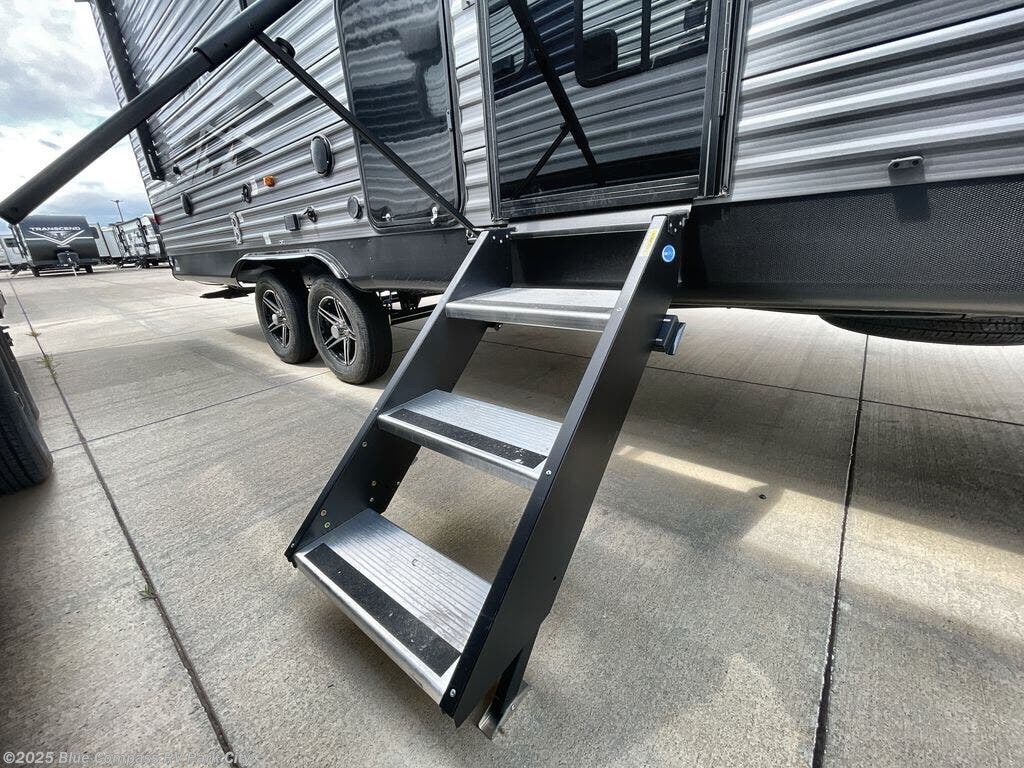 When you are ready to camp with your favorite person, this trailer offers the perfect couples trailer with space for an overnight guest on the booth dinette. You will have a front bedroom with a walk-around queen bed, dual wardrobes and overhead cabinets for your belongings. The main living and kitchen area is spacious with a slide out dinette and sofa giving you more floor space, dining and relaxing seating, and extra sleeping space for friends once the furniture is easily setup. There is a wardrobe/pantry next to the rear corner bathroom complete with a radius shower. The galley kitchen includes full amenities, plus there is an outside kitchen with a griddle and mini refrigerator. Everyone will enjoy the entertainment center when inside, and the 18' awning offers a covered outdoor living area, just grab your chairs from the pass-through compartment.