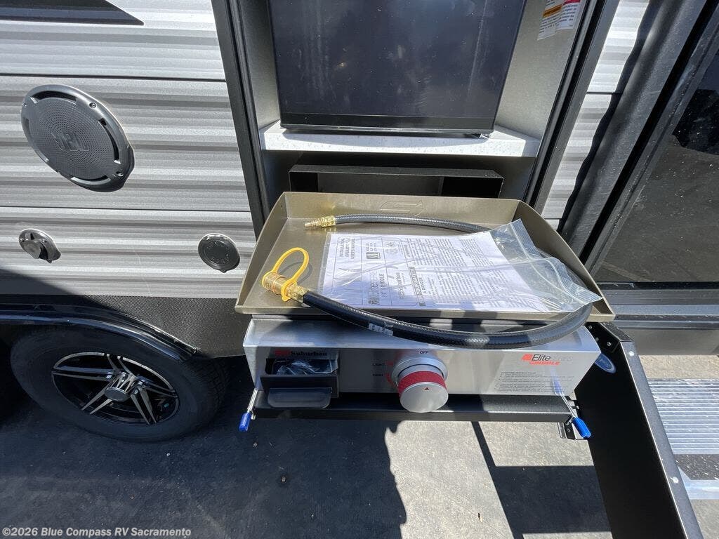 When you are ready to camp with your favorite person, this trailer offers the perfect couples trailer with space for an overnight guest on the booth dinette. You will have a front bedroom with a walk-around queen bed, dual wardrobes and overhead cabinets for your belongings. The main living and kitchen area is spacious with a slide out dinette and sofa giving you more floor space, dining and relaxing seating, and extra sleeping space for friends once the furniture is easily setup. There is a wardrobe/pantry next to the rear corner bathroom complete with a radius shower. The galley kitchen includes full amenities, plus there is an outside kitchen with a griddle and mini refrigerator. Everyone will enjoy the entertainment center when inside, and the 18' awning offers a covered outdoor living area, just grab your chairs from the pass-through compartment.