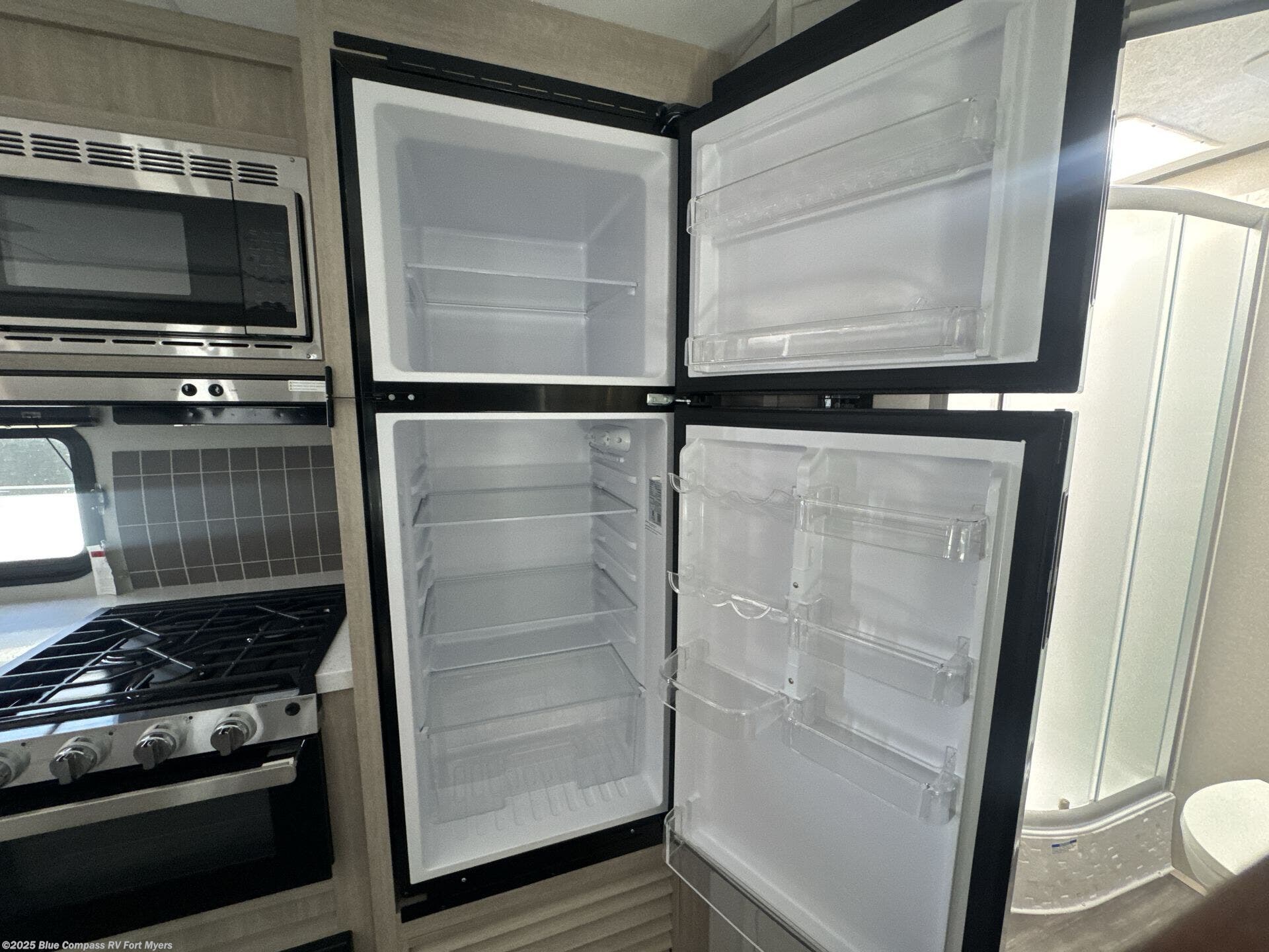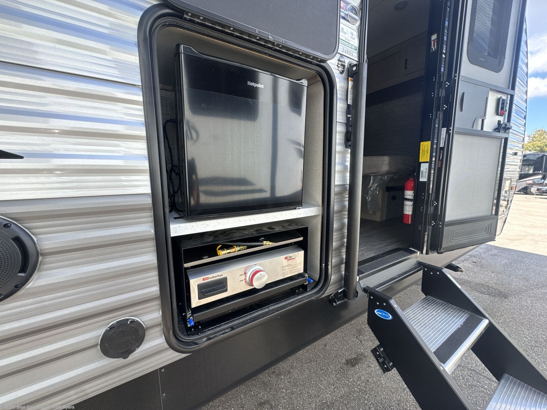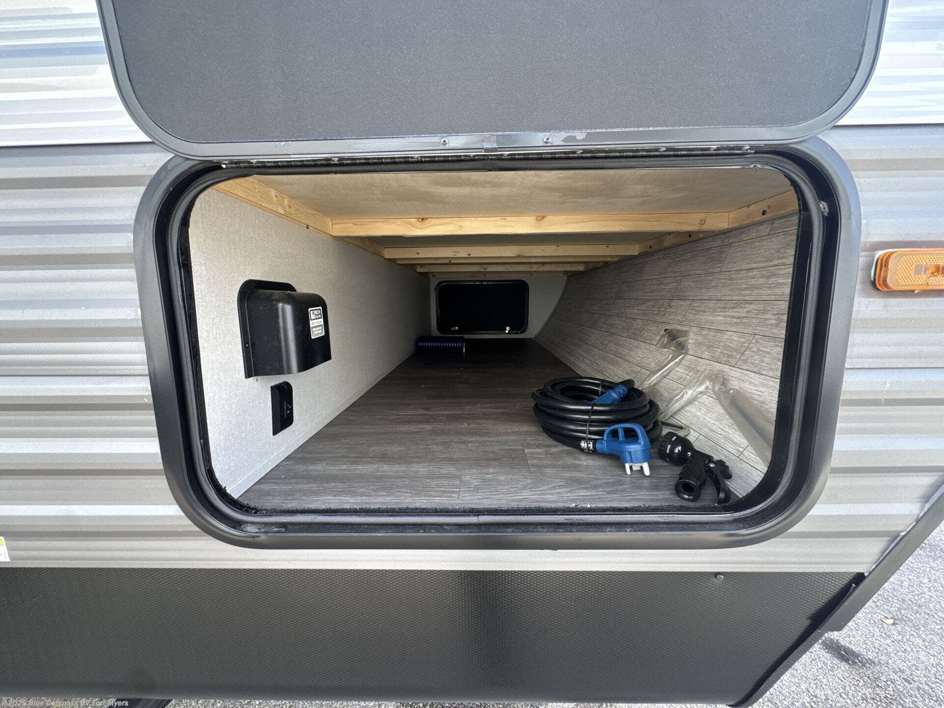 When you are ready to camp with your favorite person, this trailer offers the perfect couples trailer with space for an overnight guest on the booth dinette. You will have a front bedroom with a walk-around queen bed, dual wardrobes and overhead cabinets for your belongings. The main living and kitchen area is spacious with a slide out dinette and sofa giving you more floor space, dining and relaxing seating, and extra sleeping space for friends once the furniture is easily setup. There is a wardrobe/pantry next to the rear corner bathroom complete with a radius shower. The galley kitchen includes full amenities, plus there is an outside kitchen with a griddle and mini refrigerator. Everyone will enjoy the entertainment center when inside, and the 18' awning offers a covered outdoor living area, just grab your chairs from the pass-through compartment.