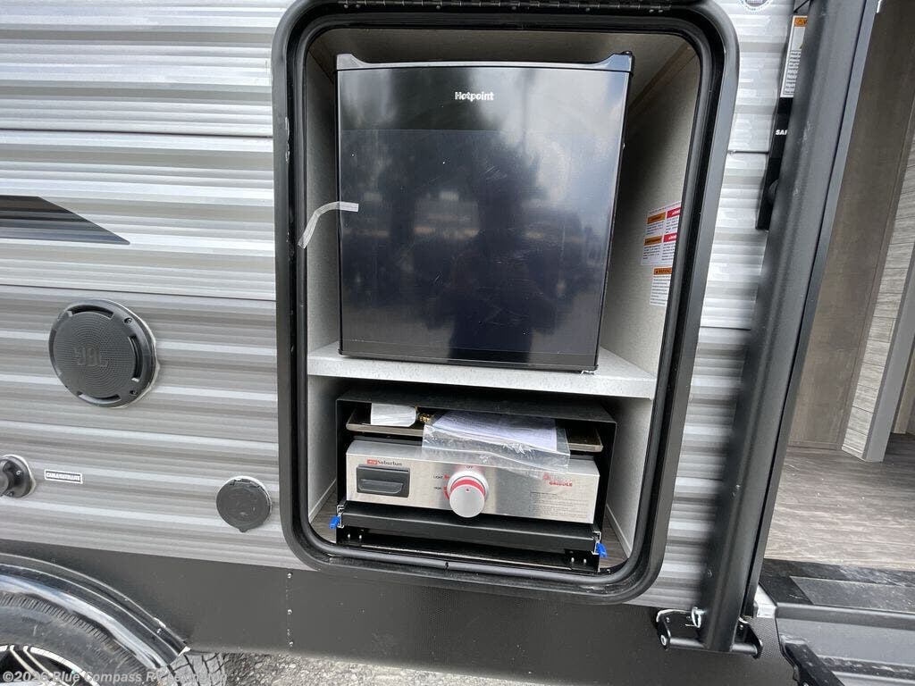 When you are ready to camp with your favorite person, this trailer offers the perfect couples trailer with space for an overnight guest on the booth dinette. You will have a front bedroom with a walk-around queen bed, dual wardrobes and overhead cabinets for your belongings. The main living and kitchen area is spacious with a slide out dinette and sofa giving you more floor space, dining and relaxing seating, and extra sleeping space for friends once the furniture is easily setup. There is a wardrobe/pantry next to the rear corner bathroom complete with a radius shower. The galley kitchen includes full amenities, plus there is an outside kitchen with a griddle and mini refrigerator. Everyone will enjoy the entertainment center when inside, and the 18' awning offers a covered outdoor living area, just grab your chairs from the pass-through compartment.