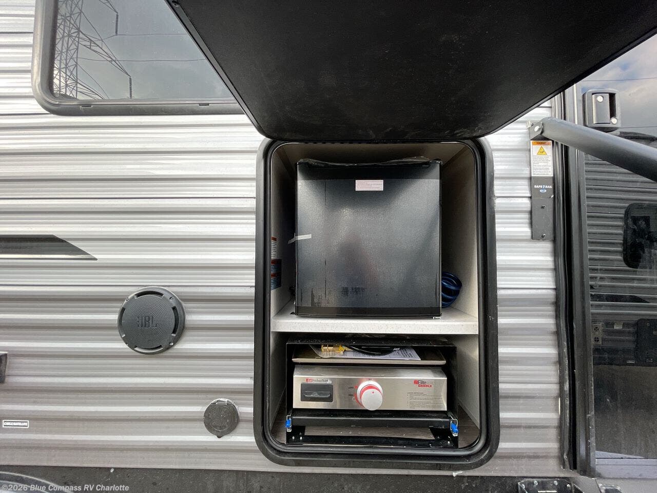 When you are ready to camp with your favorite person, this trailer offers the perfect couple's trailer with space for an overnight guest on the booth dinette. You will have a front bedroom with a walk-around queen bed, dual wardrobes and overhead cabinets for your belongings. The main living and kitchen area is spacious with a slide out dinette and sofa giving you more floor space, dining and relaxing seating, and extra sleeping space for friends once the furniture is easily setup. There is a wardrobe/pantry with washer/dryer prep next to the rear corner bathroom complete with a radius shower. The galley kitchen includes full amenities, plus there is an outside kitchen with a griddle and mini refrigerator. Everyone will enjoy the entertainment center when inside, and the 21' awning offers a covered outdoor living area, just grab your chairs from the pass-through compartment.