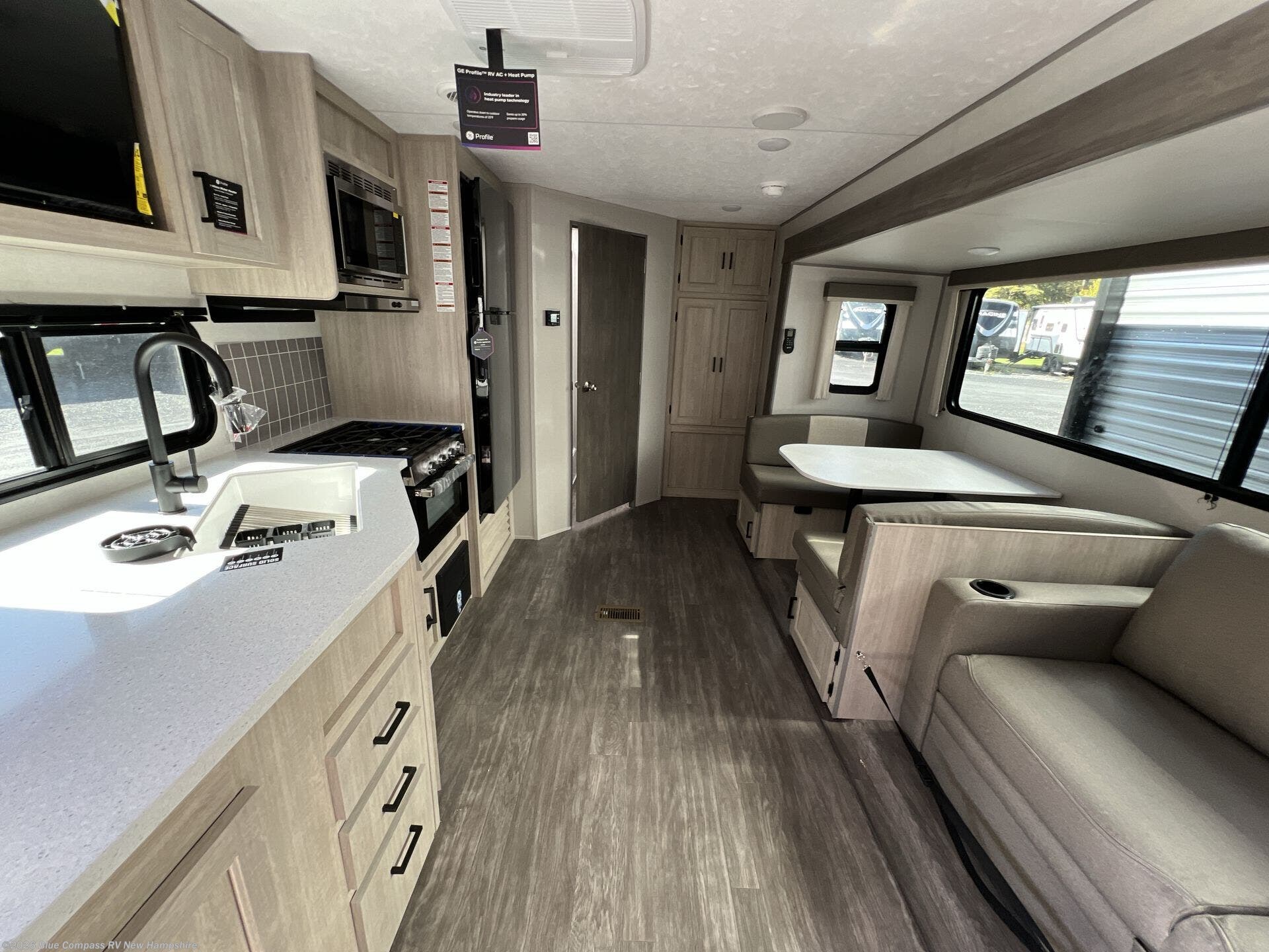 When you are ready to camp with your favorite person, this trailer offers the perfect couples trailer with space for an overnight guest on the booth dinette. You will have a front bedroom with a walk-around queen bed, dual wardrobes and overhead cabinets for your belongings. The main living and kitchen area is spacious with a slide out dinette and sofa giving you more floor space, dining and relaxing seating, and extra sleeping space for friends once the furniture is easily setup. There is a wardrobe/pantry next to the rear corner bathroom complete with a radius shower. The galley kitchen includes full amenities, plus there is an outside kitchen with a griddle and mini refrigerator. Everyone will enjoy the entertainment center when inside, and the 18' awning offers a covered outdoor living area, just grab your chairs from the pass-through compartment.