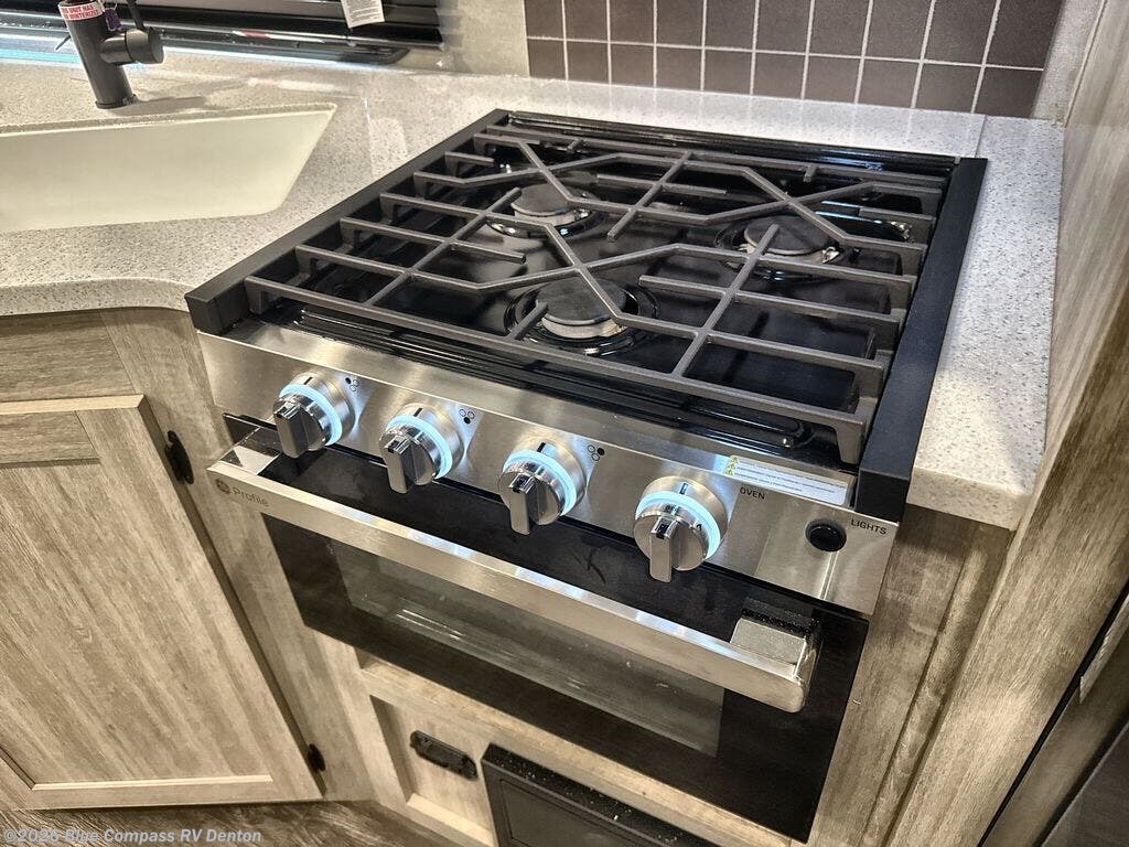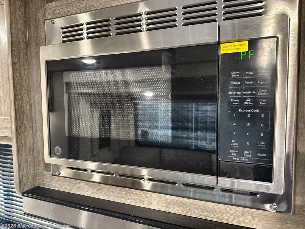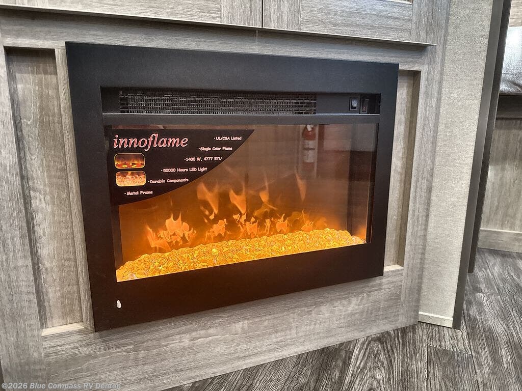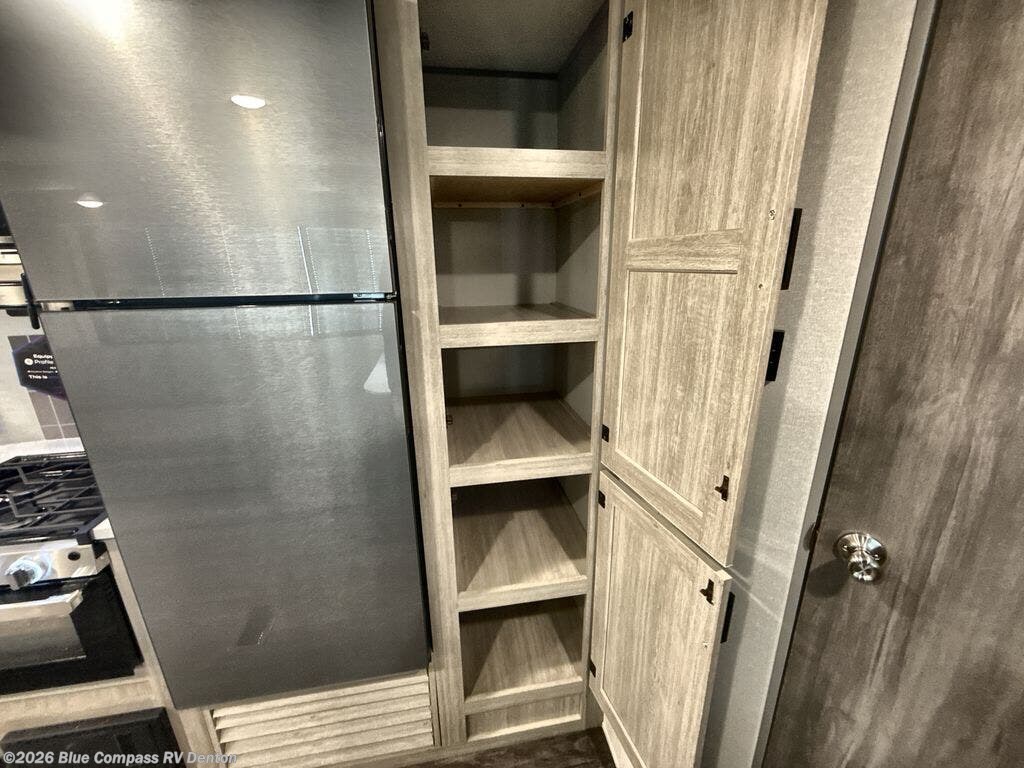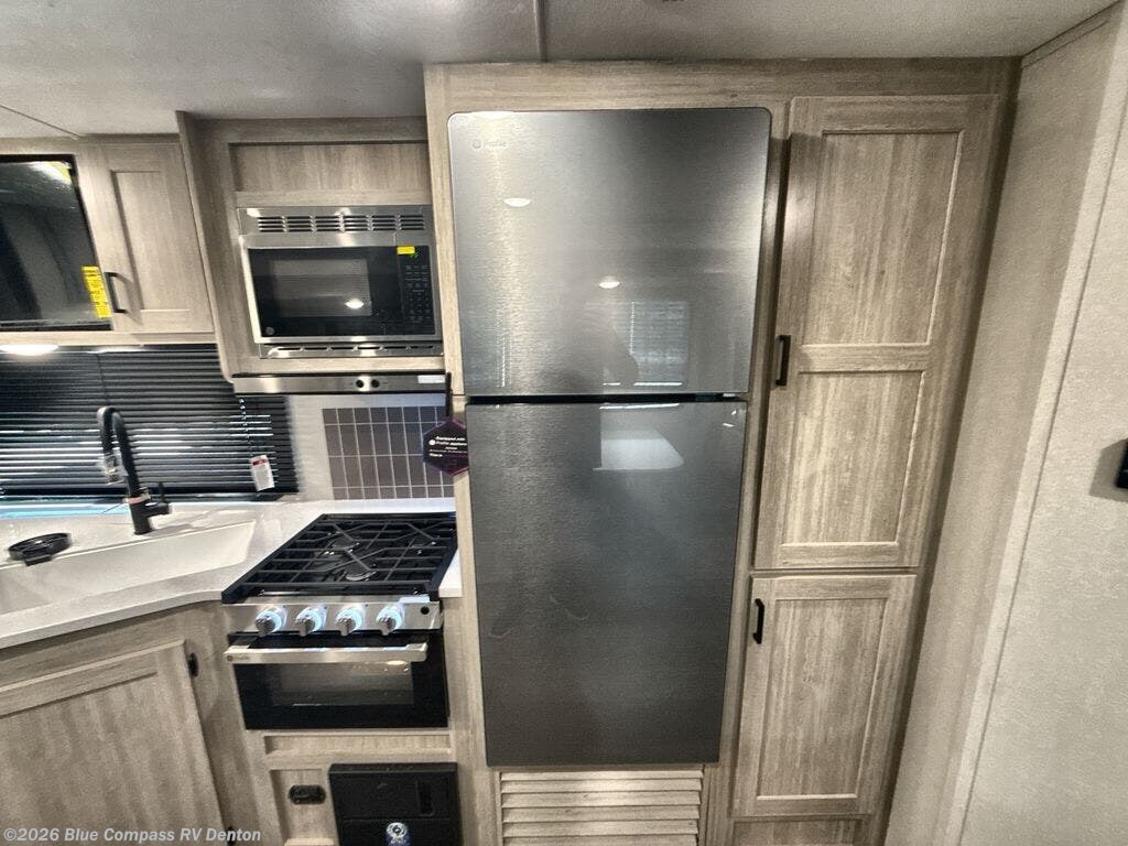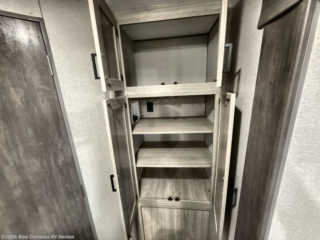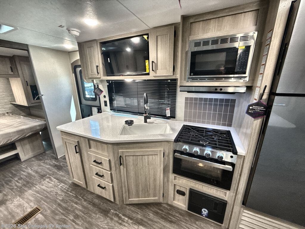 When you are ready to camp with your favorite person, this trailer offers the perfect couple's trailer with space for an overnight guest on the booth dinette. You will have a front bedroom with a walk-around queen bed, dual wardrobes and overhead cabinets for your belongings. The main living and kitchen area is spacious with a slide out dinette and sofa giving you more floor space, dining and relaxing seating, and extra sleeping space for friends once the furniture is easily setup. There is a wardrobe/pantry with washer/dryer prep next to the rear corner bathroom complete with a radius shower. The galley kitchen includes full amenities, plus there is an outside kitchen with a griddle and mini refrigerator. Everyone will enjoy the entertainment center when inside, and the 21' awning offers a covered outdoor living area, just grab your chairs from the pass-through compartment.